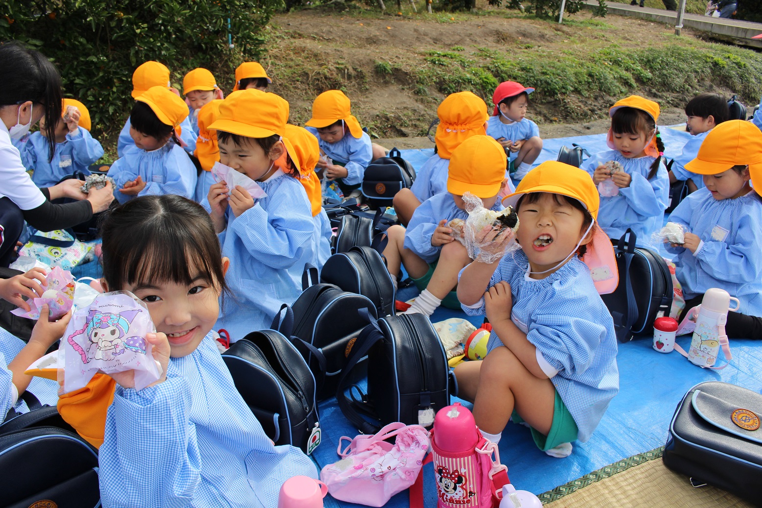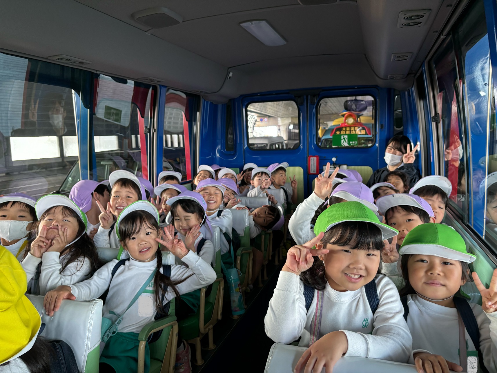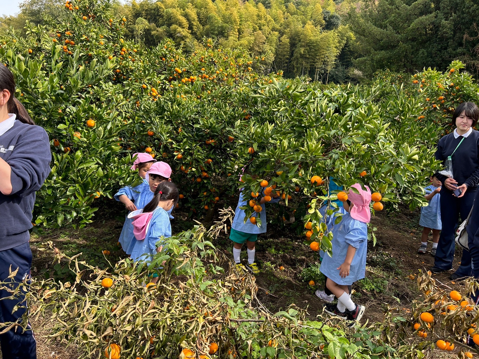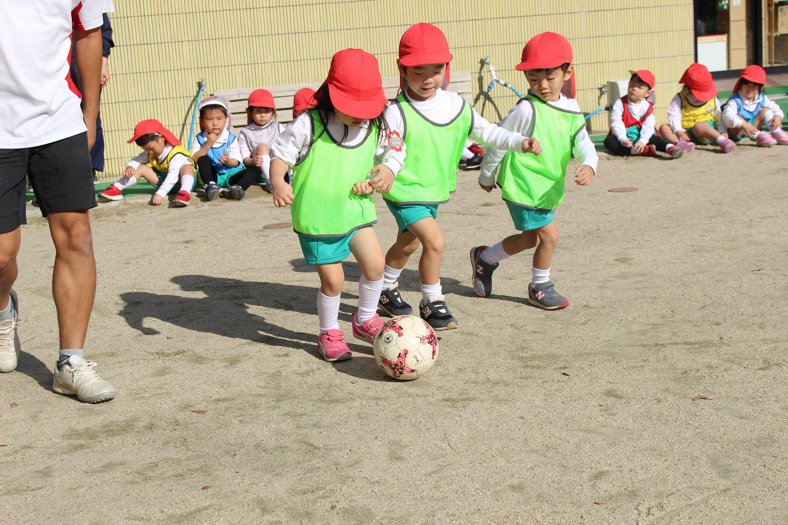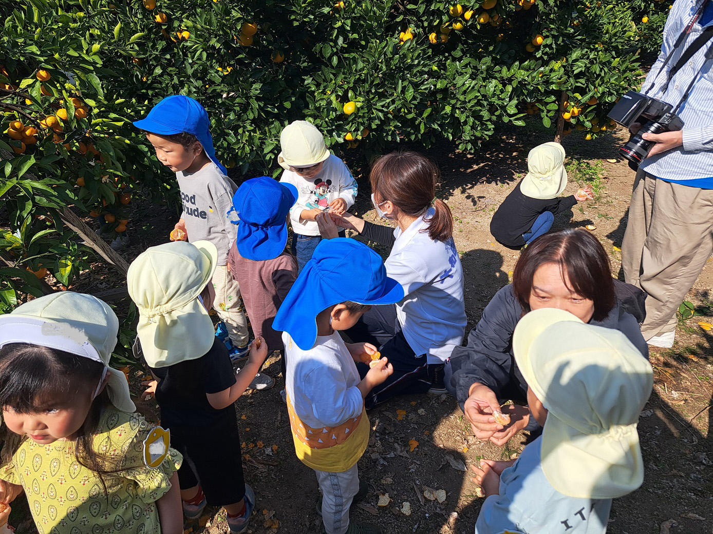 大学グラウンドへお散歩♪いろいろな色や形の葉っぱを嬉しそうにひろう子どもたちでした。"よいしょ よいしょ"と保育者と一緒に、散歩車を押してくれてありがとう♡