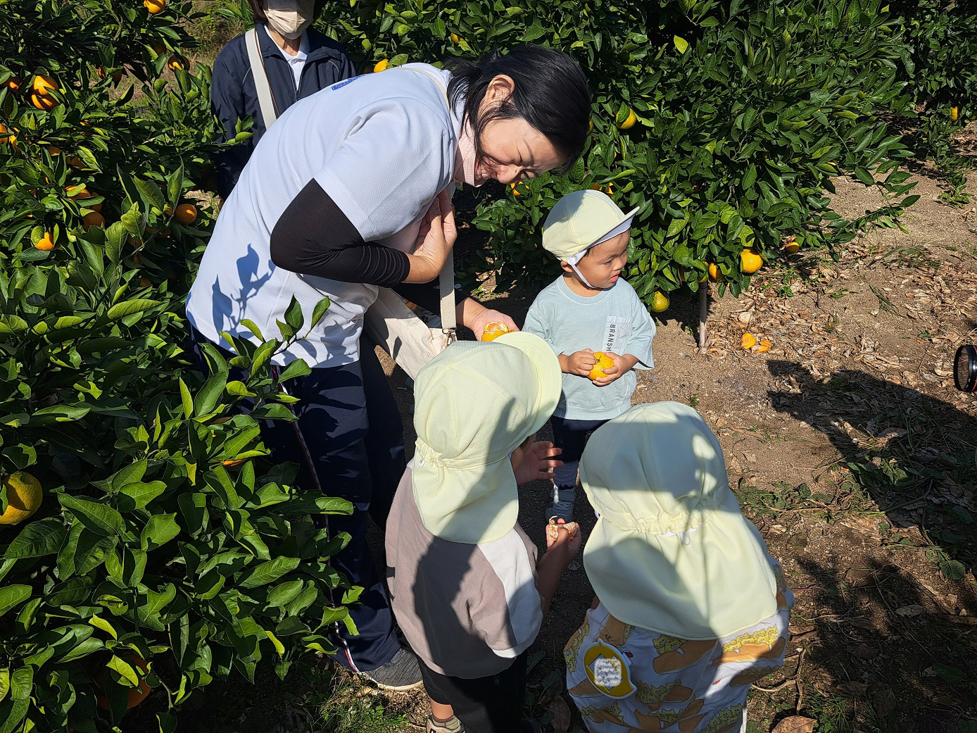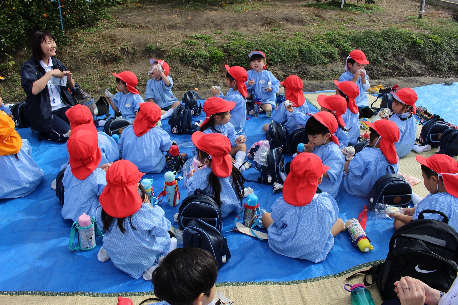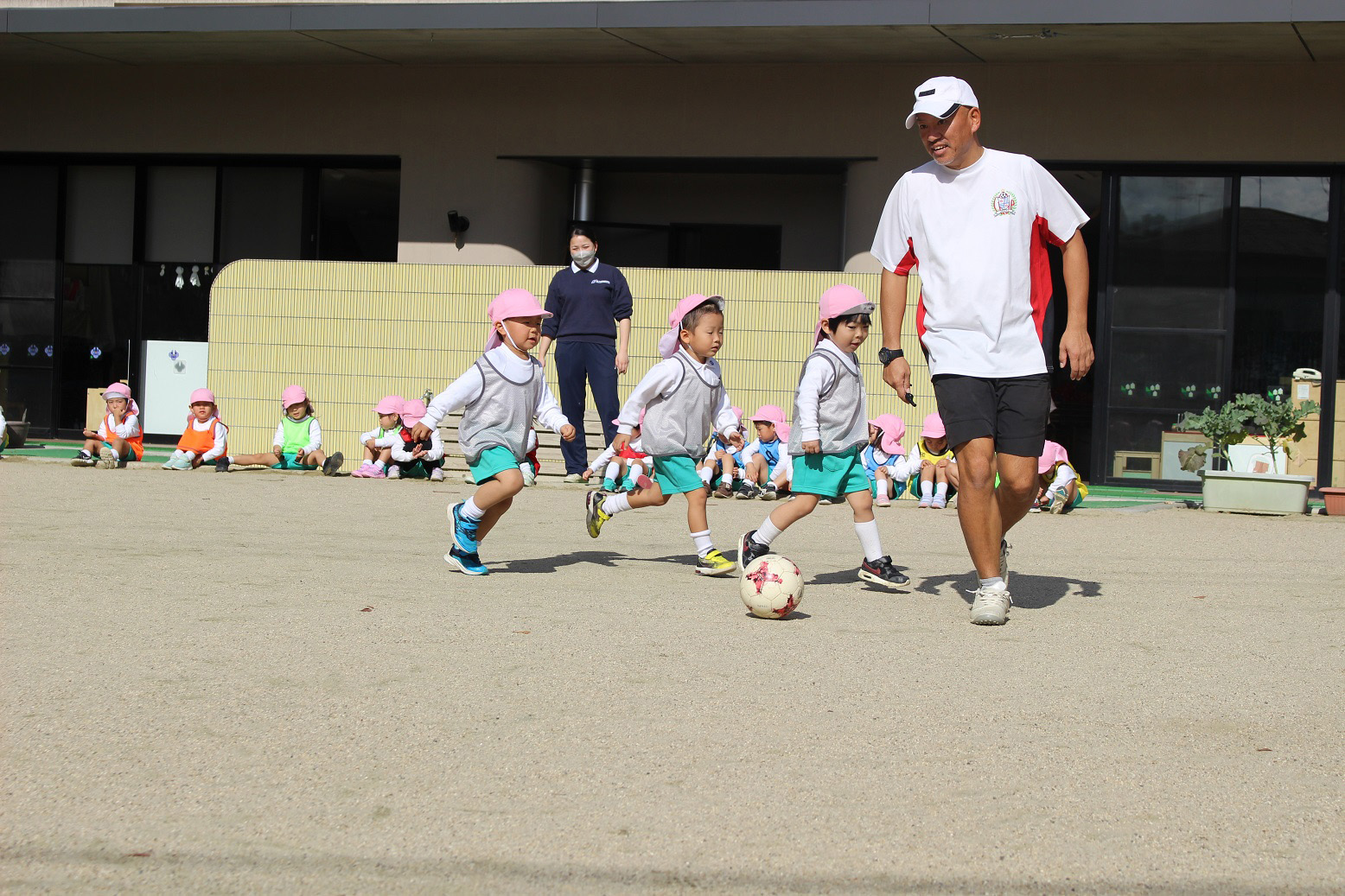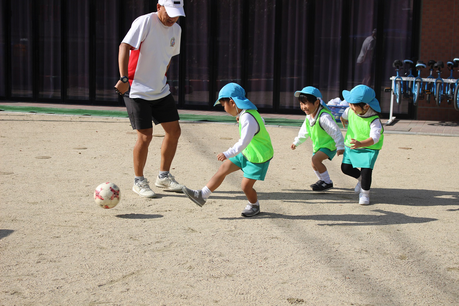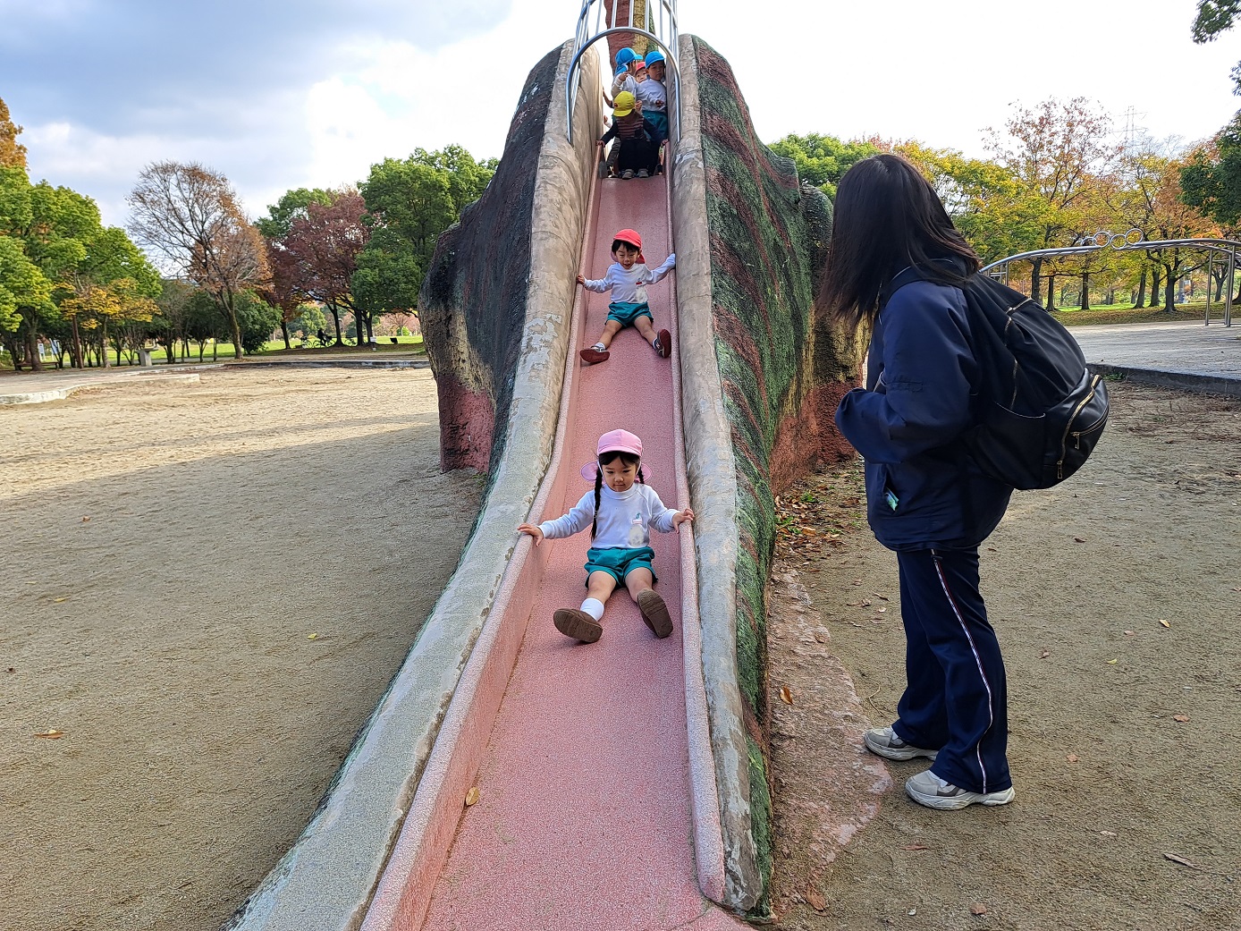 大学グラウンドへお散歩♪いろいろな色や形の葉っぱを嬉しそうにひろう子どもたちでした。"よいしょ よいしょ"と保育者と一緒に、散歩車を押してくれてありがとう♡