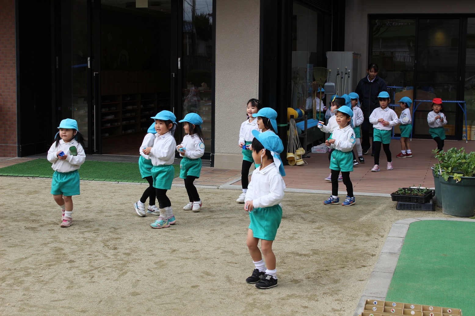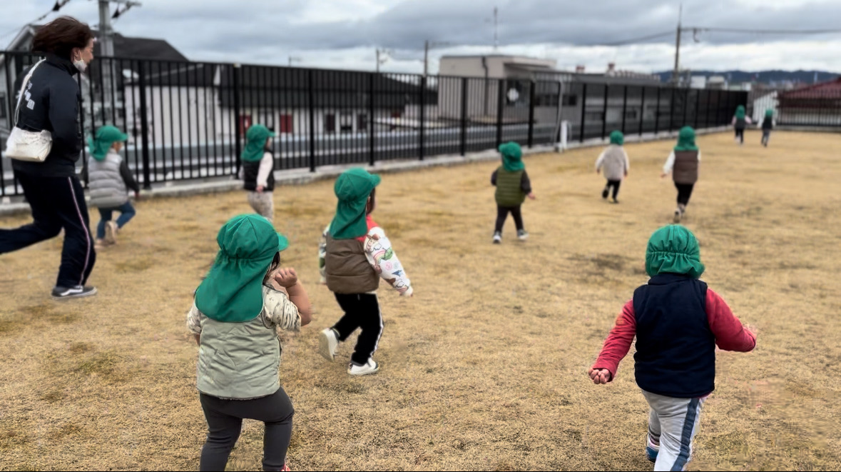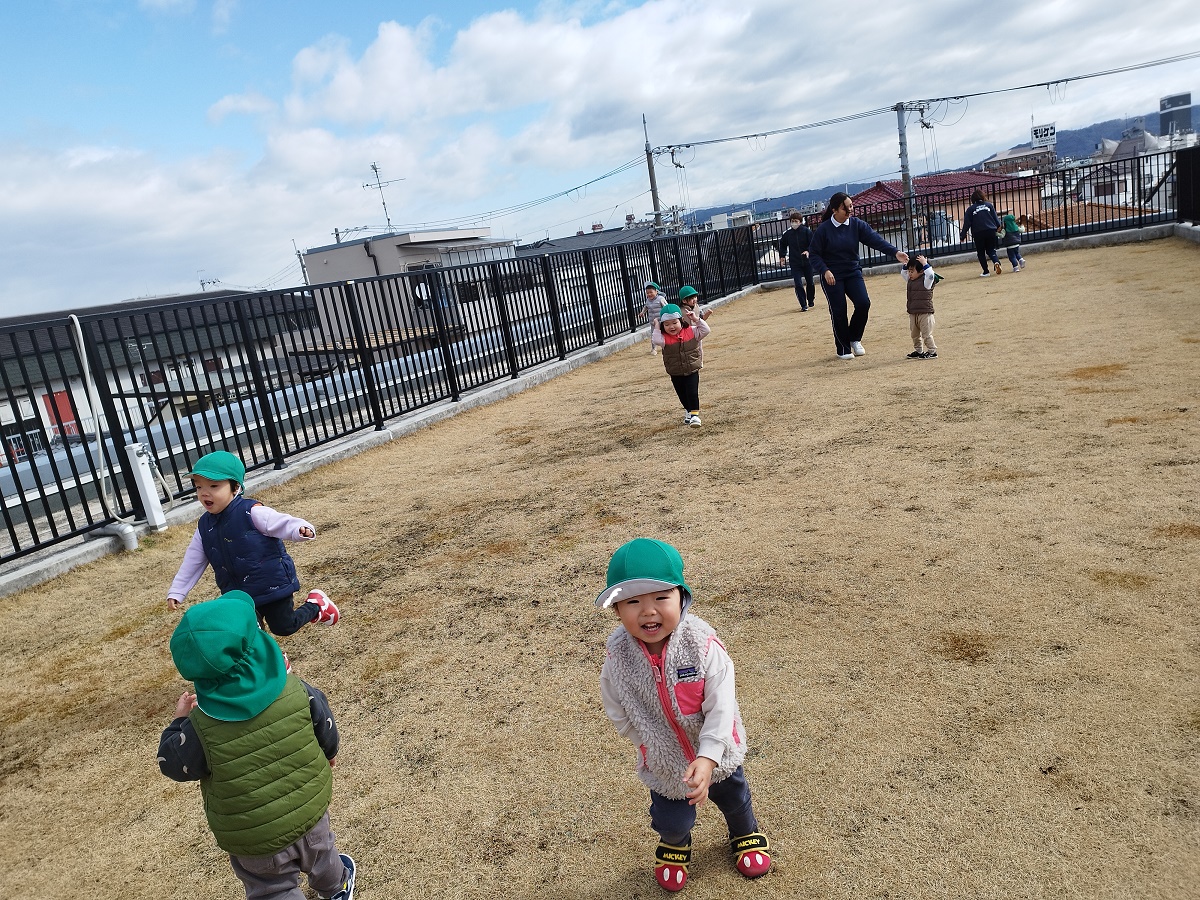 空庭で元気いっぱい遊びました♪保育士とかけっこ!!みんなとっても速いんです!!