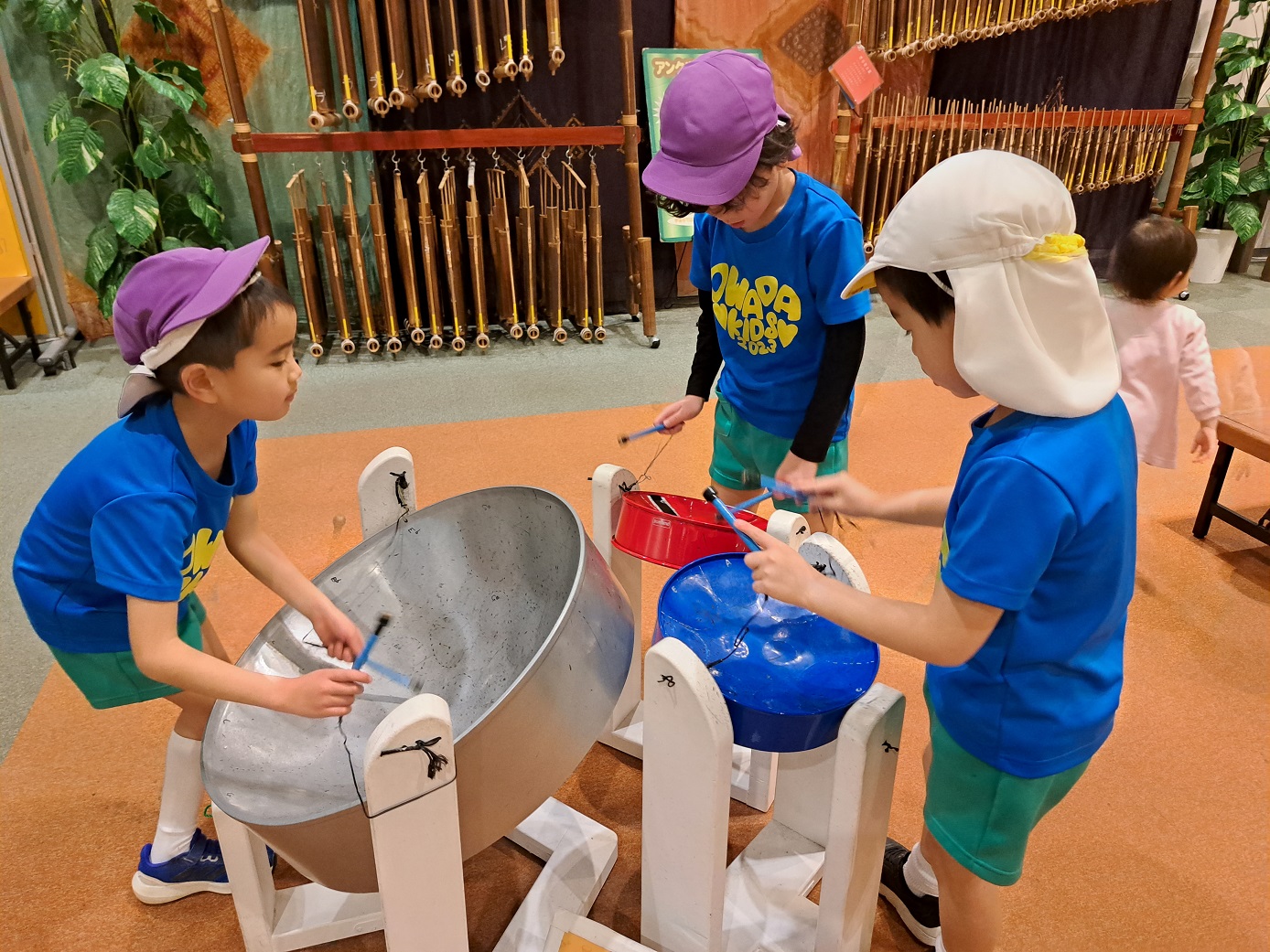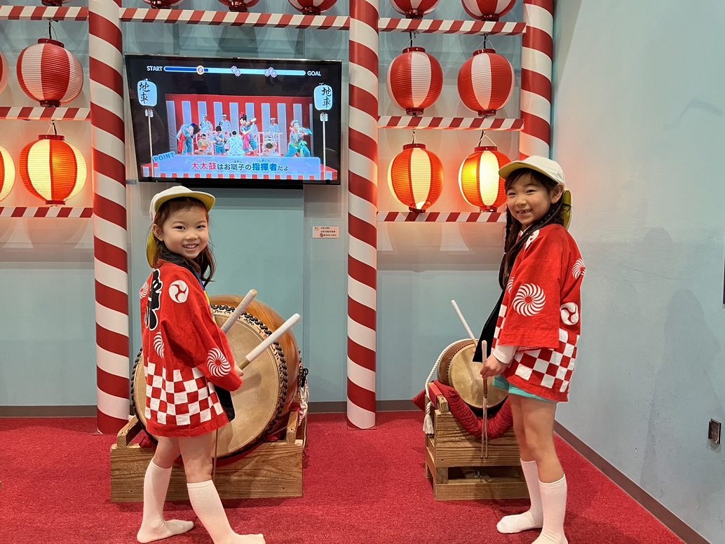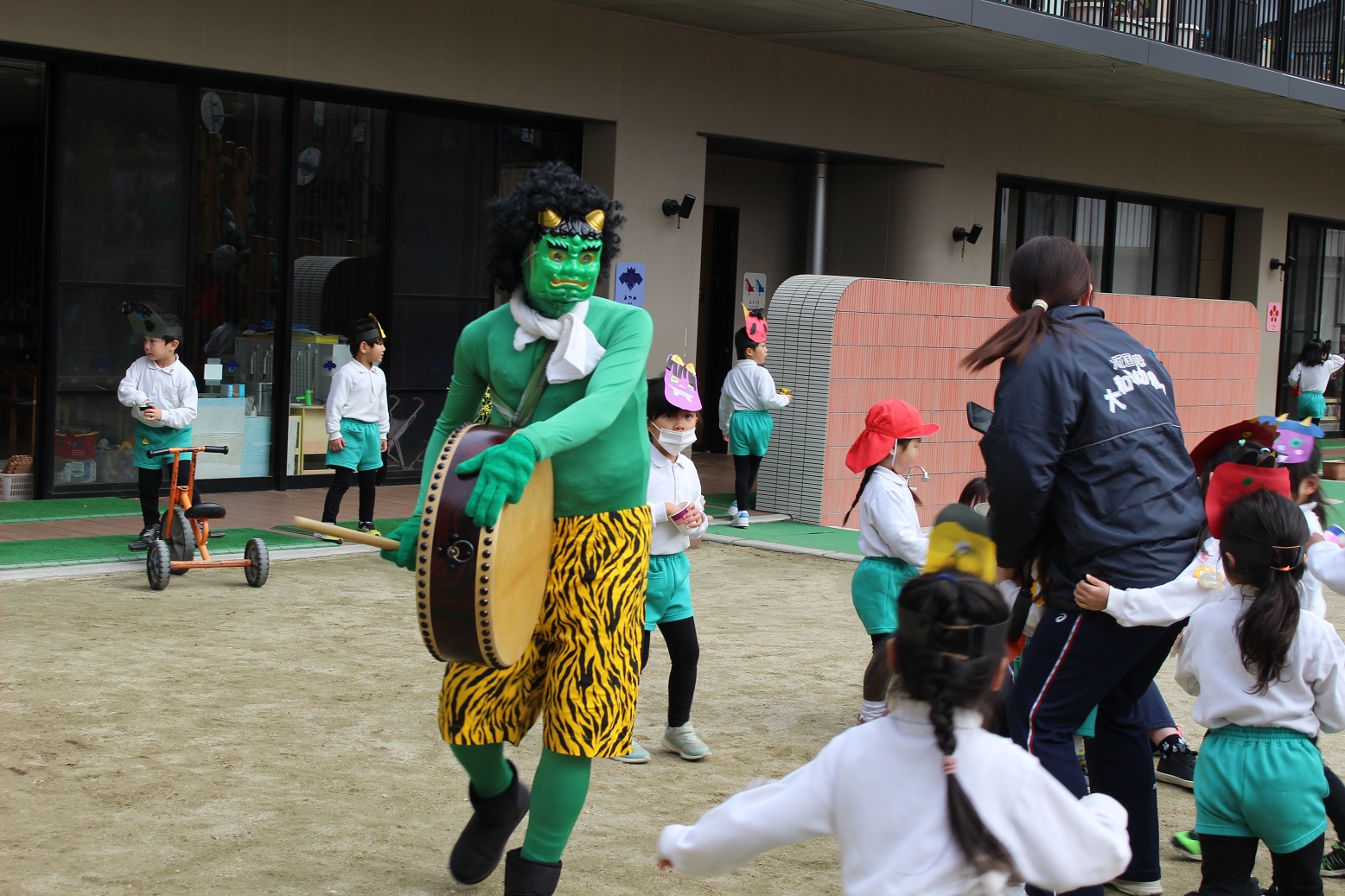 子どもたちが園庭で遊んでいると、ドンッドンッと太鼓の音が響き渡ってきました。
