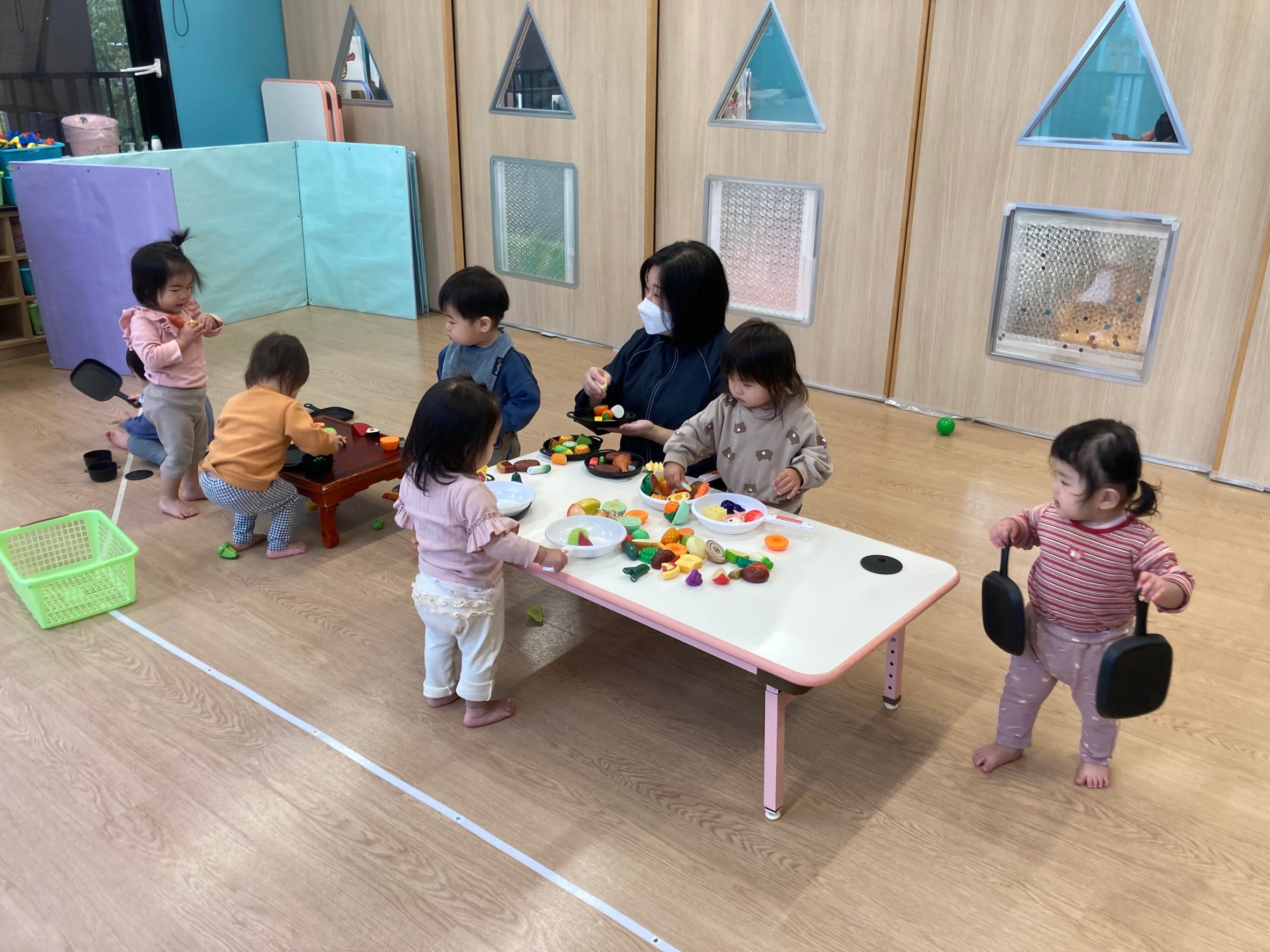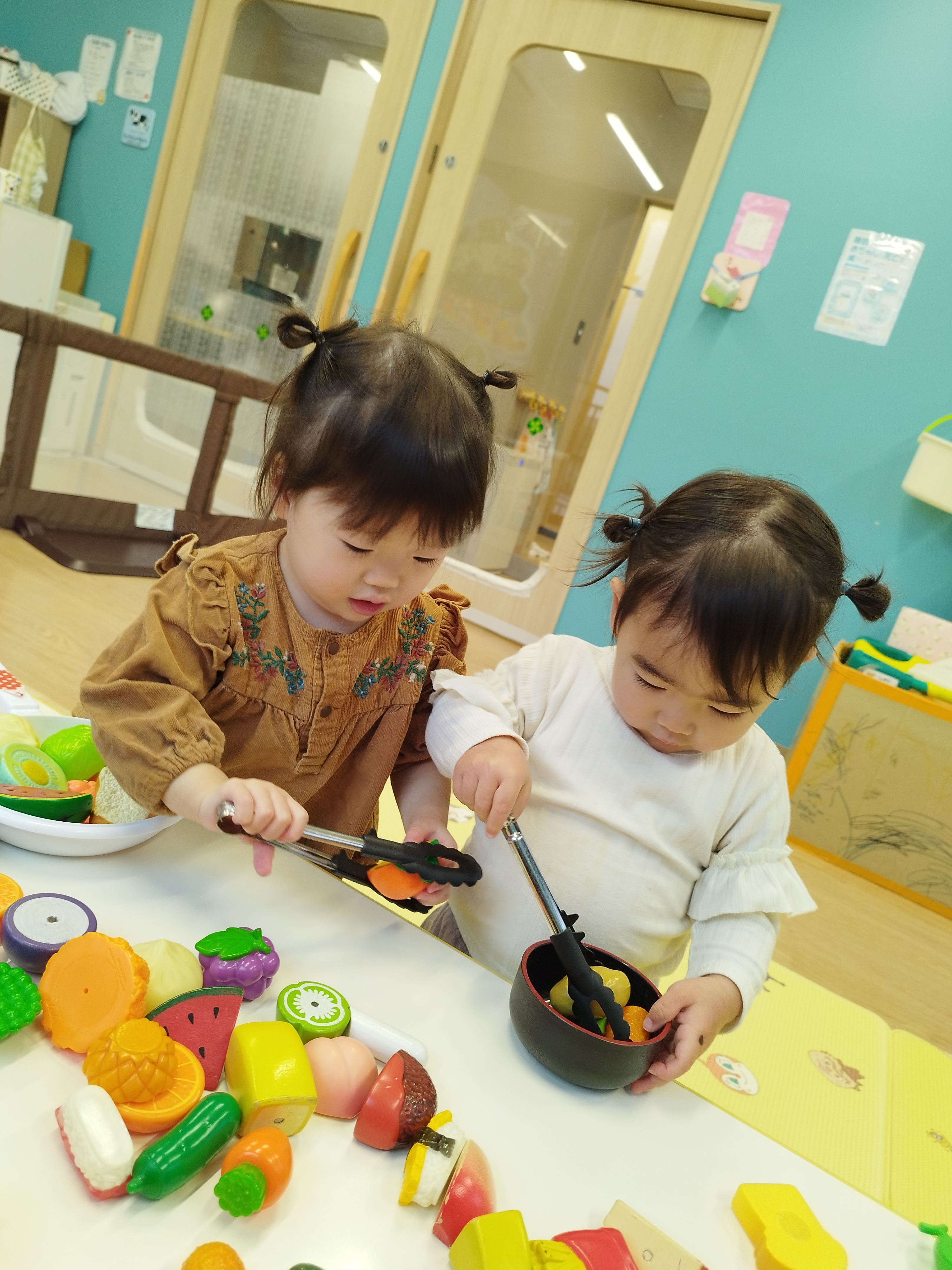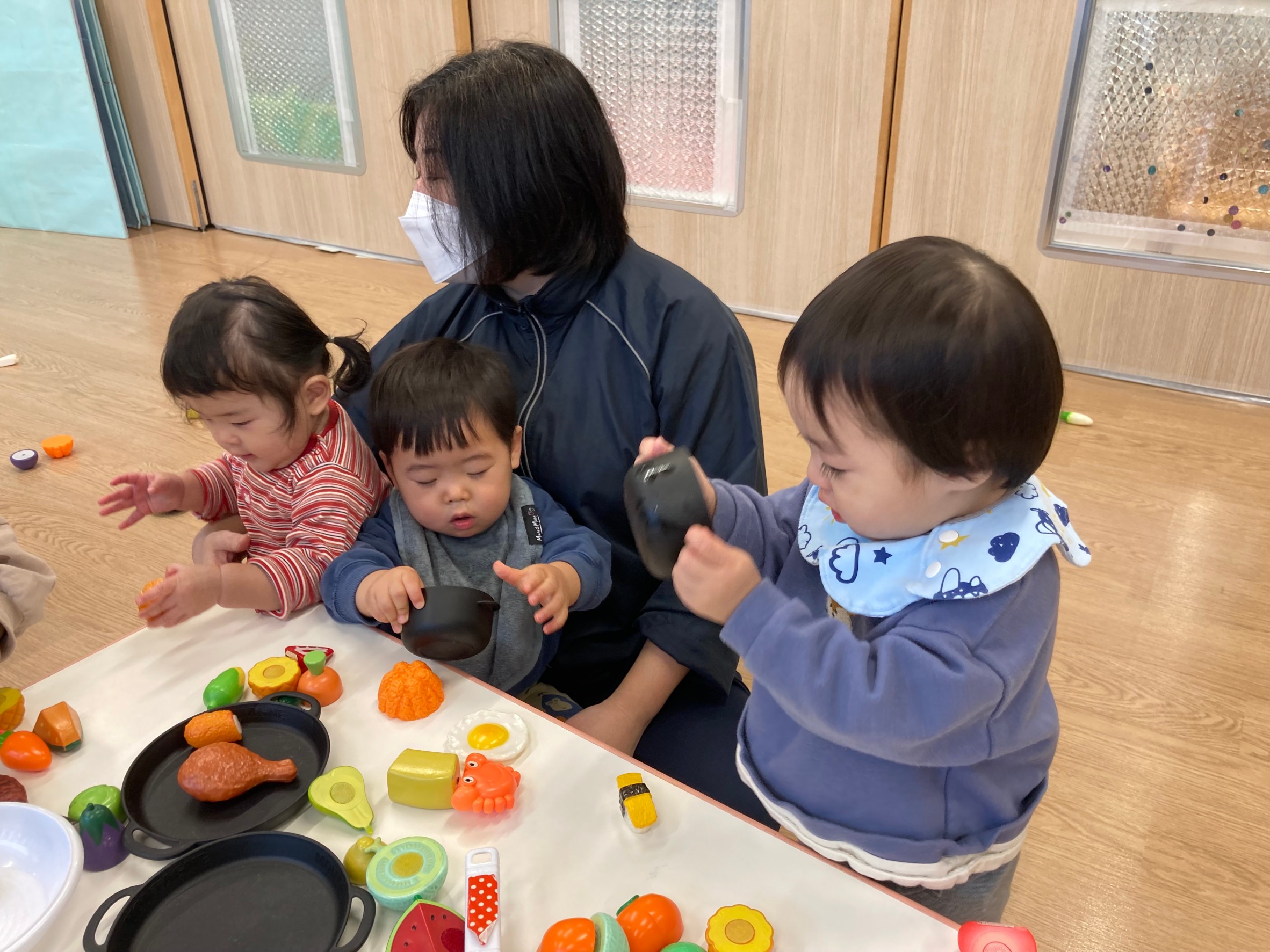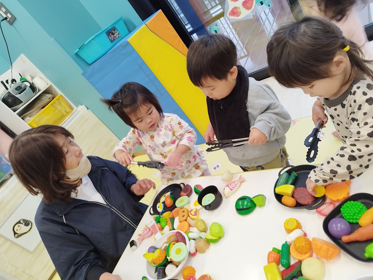 おままごとで遊びました♪フライパンに溢れるほどの食べ物を入れてご満悦の子どもたち!トングを使って掴もうと一生懸命...上手に掴めるとニコッと嬉しそうでした♪
