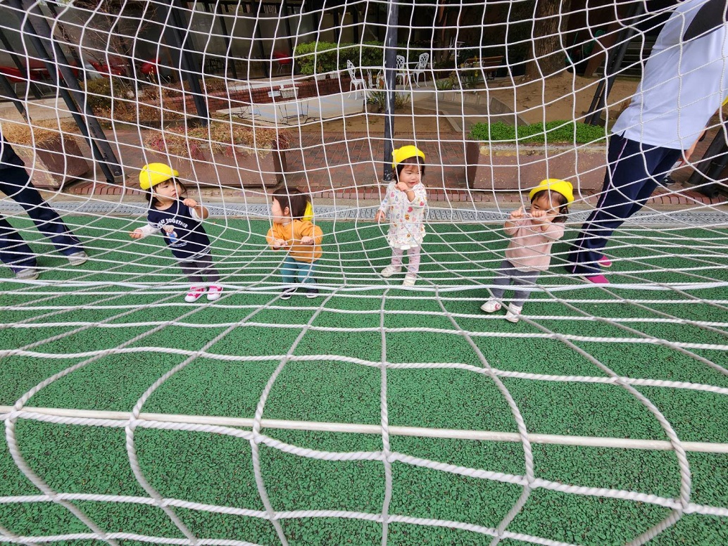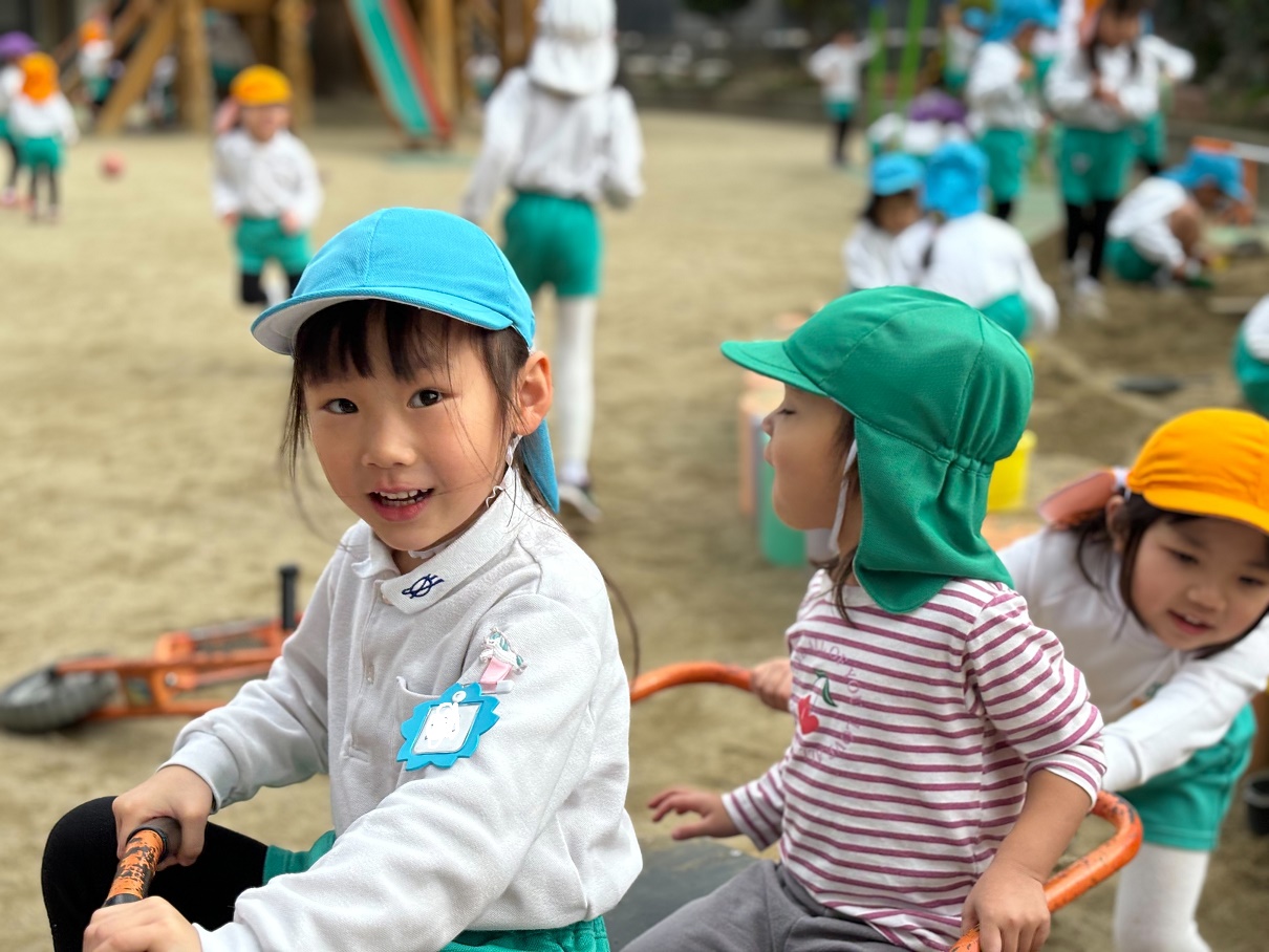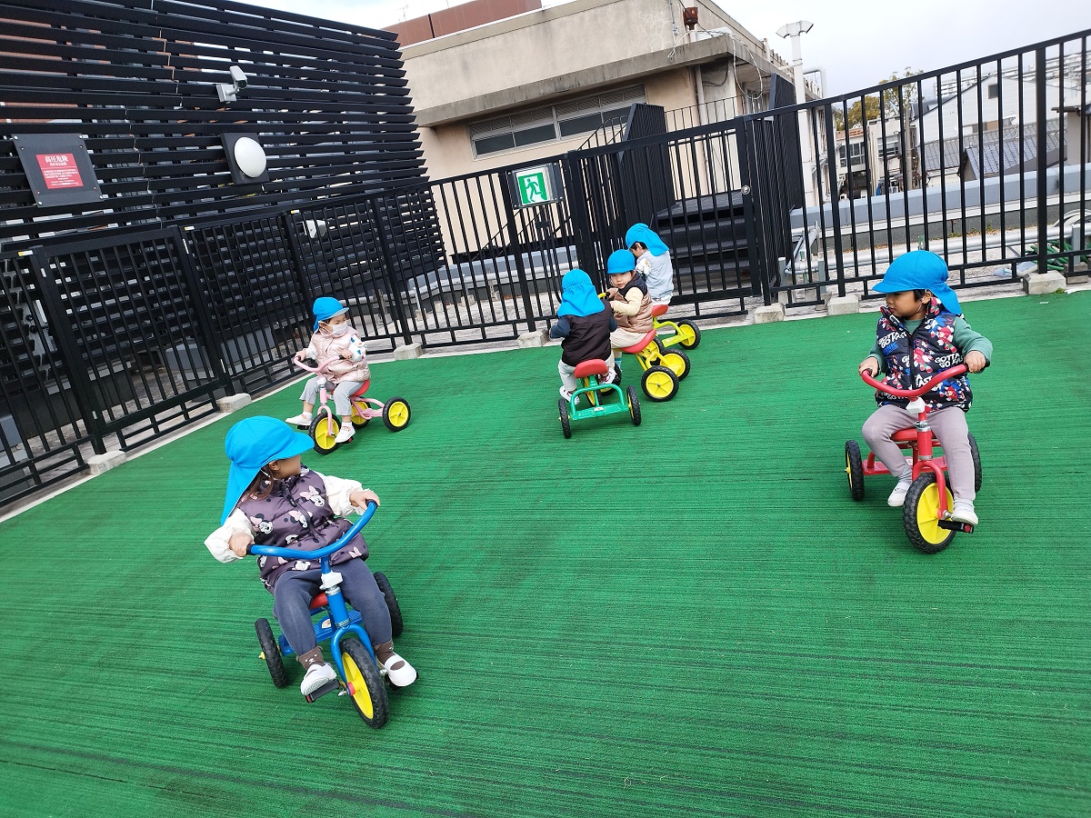 三輪車に乗ったり、みんなで追いかけっこをしたりと元気いっぱいのぱんだ組さんでした♪最近"むっくりくまさん"という鬼ごっこが大好きで今日もたくさん走りました♪