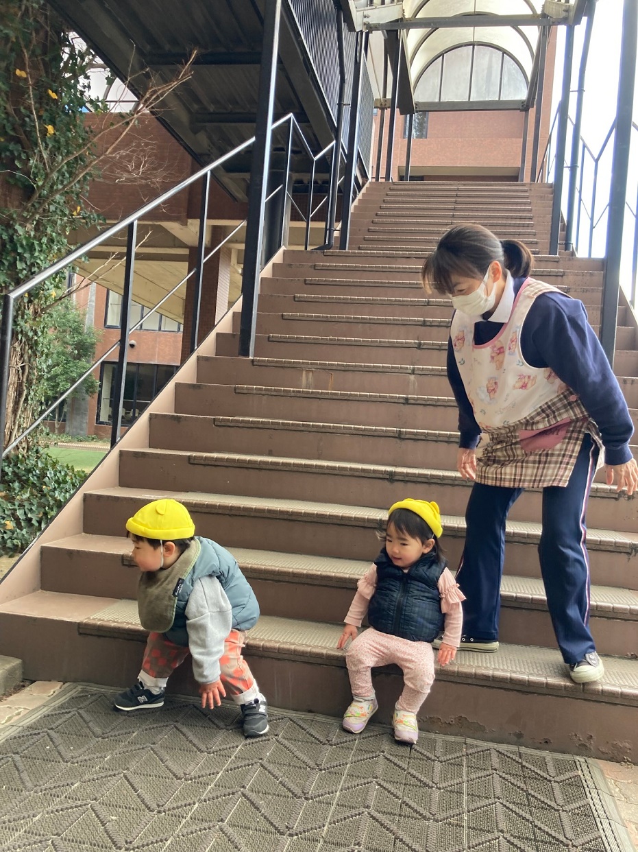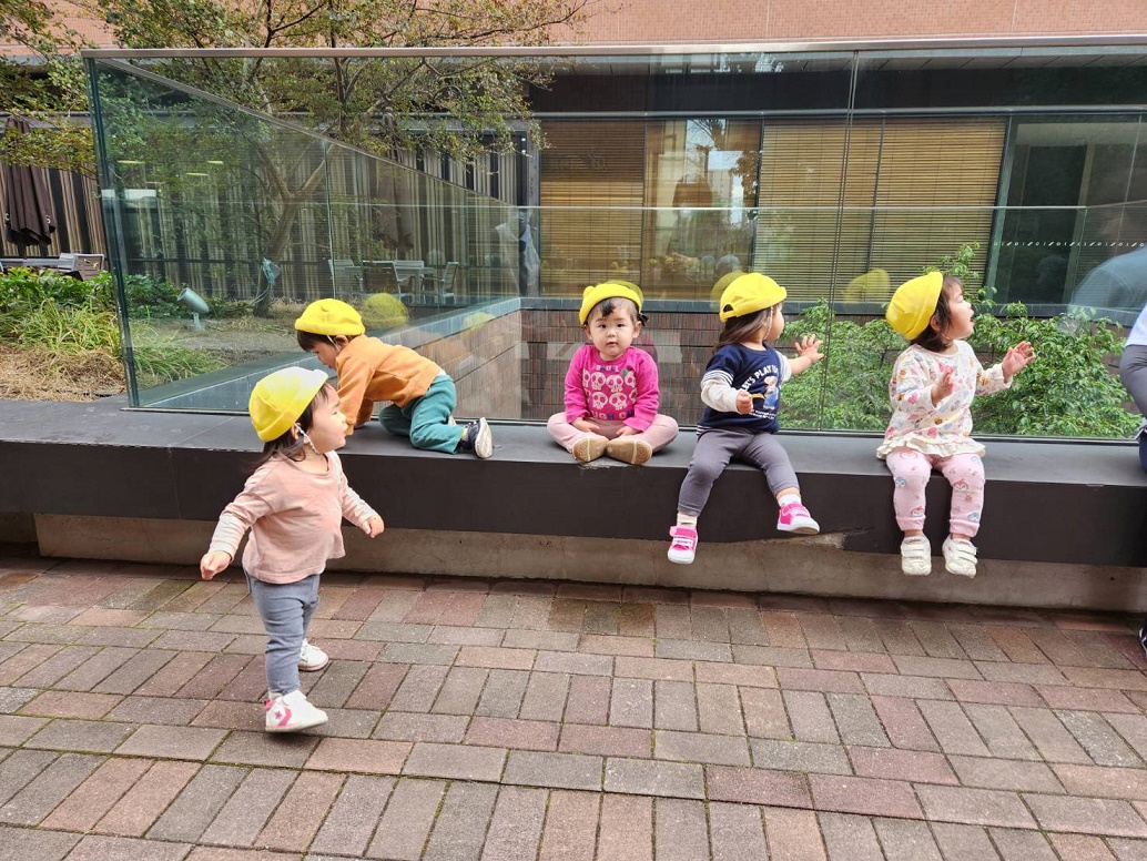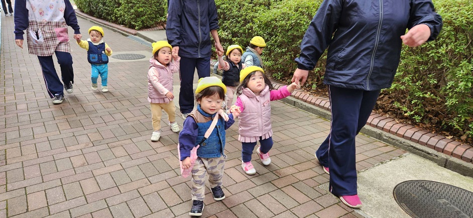 大学を散歩しました♪お友だちと保育者と手をつないで上手に歩けるようになってきました!!