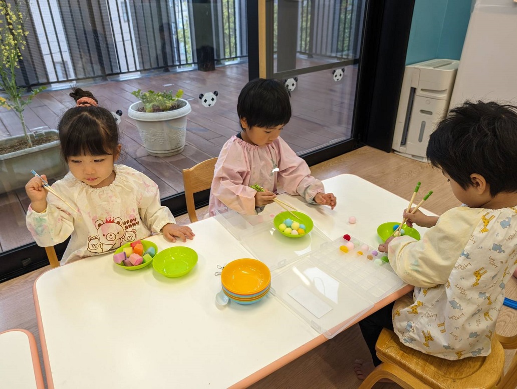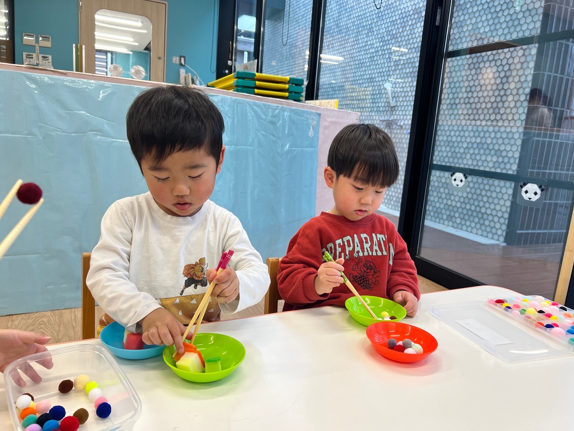 色々なものをお箸でつかんで遊びました♪みんな頑張ってお箸を使っています♪まずは楽しみながら慣れていきましょう!