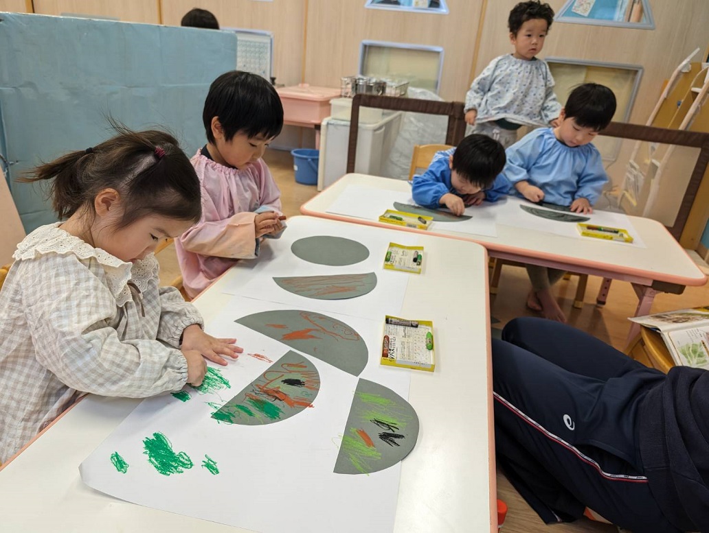 発表会遊びでダンゴ虫になりきって遊んだ子どもたち♪今日は保育者が画用紙で作ったダンゴ虫を好きな所に貼り付けて、パスで思い思いに絵を描きました!