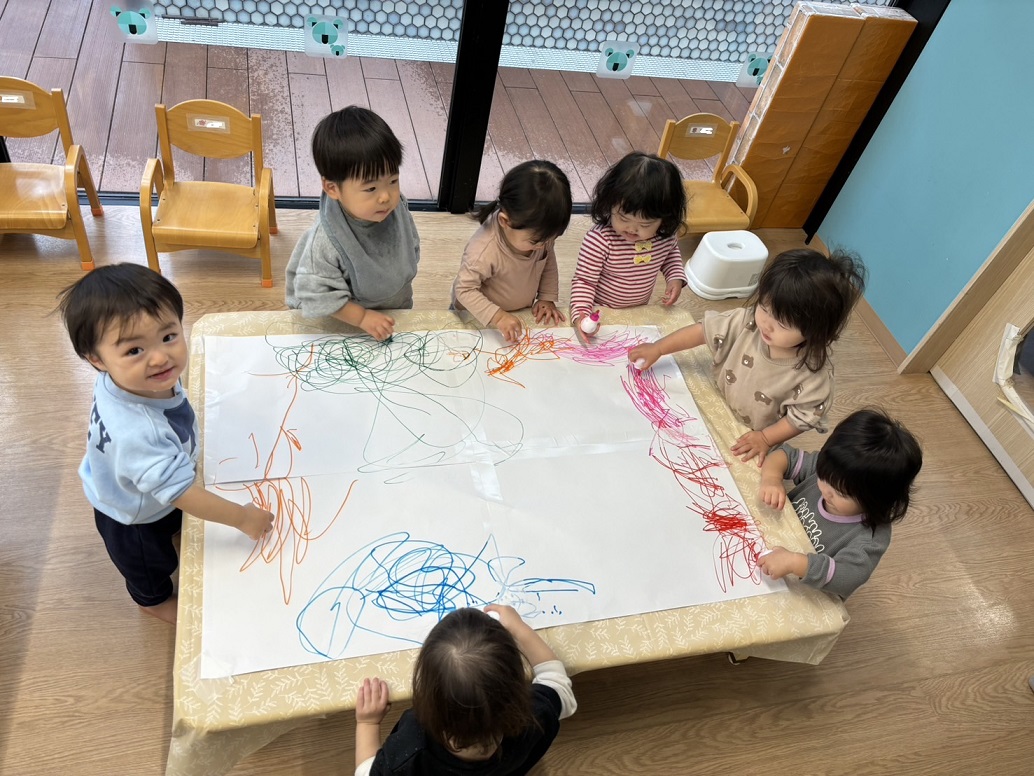 お絵描きを楽しんでいたこあら組のお友だち♪好きな色を使って、腕を大きく動かし