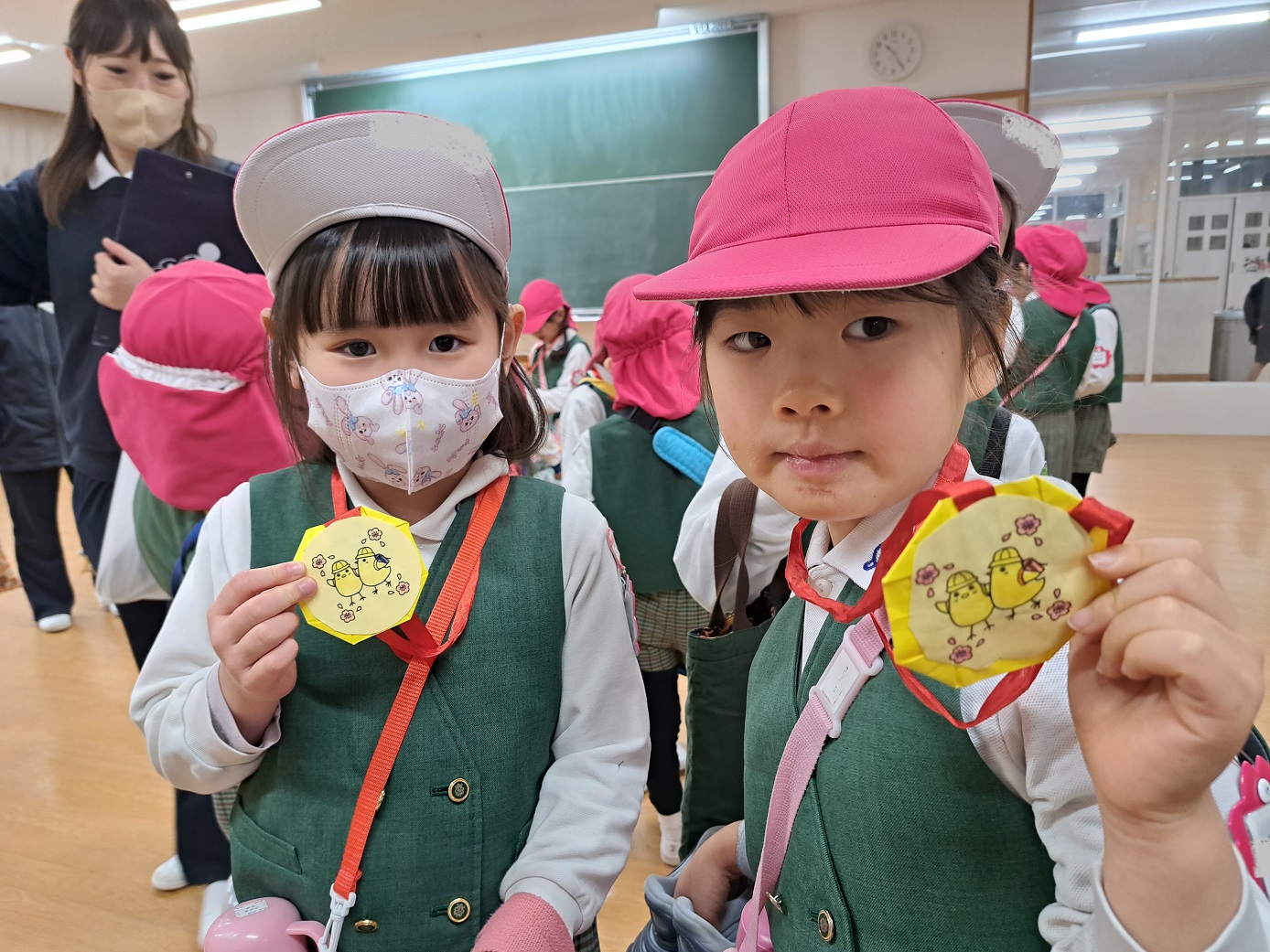 小学生のお兄さん・お姉さんにメダルのペンダントをもらって大喜びの子どもたちでした!