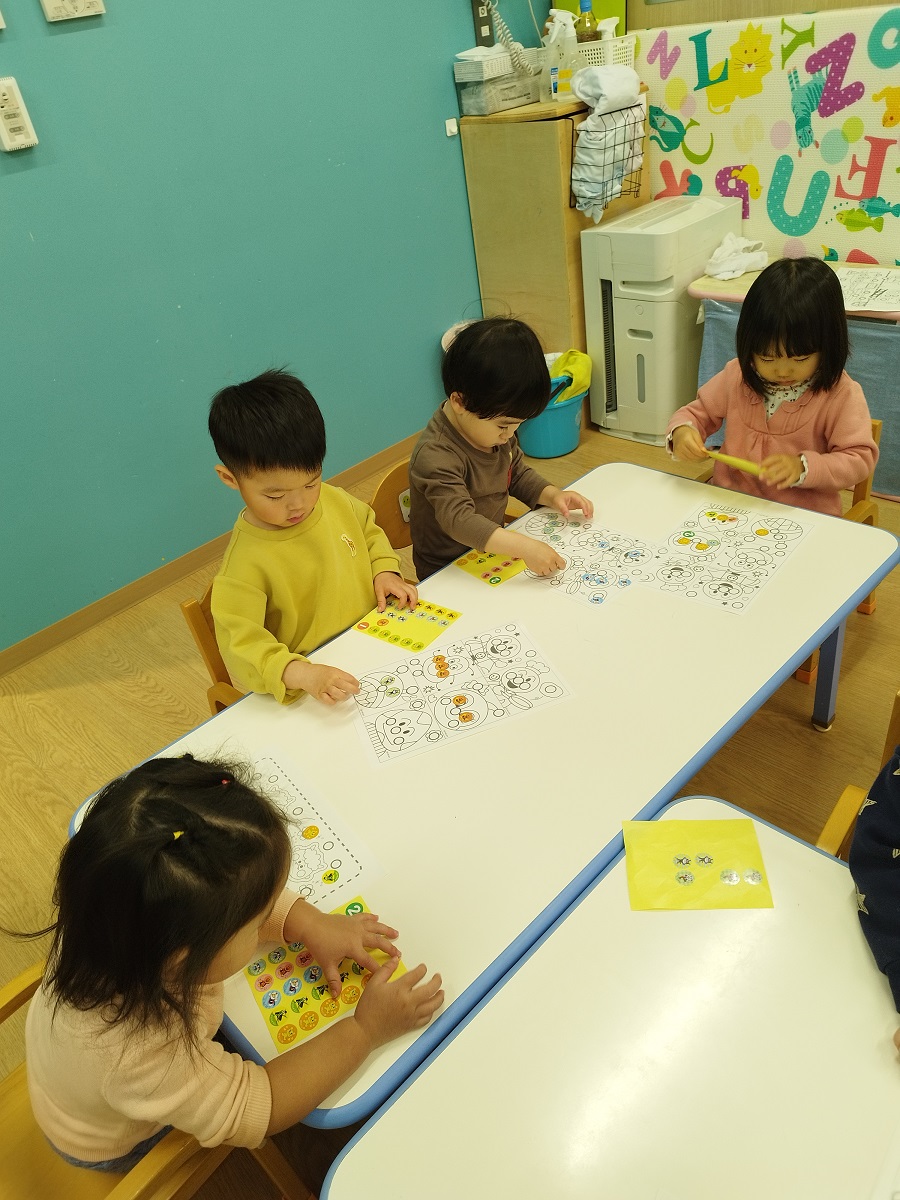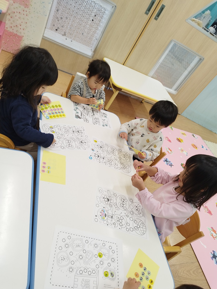 シール遊びをしていました♪みんな大好きアンパンマンのキャラクターシールに大喜びの子どもたち!〇しるしのところに合わせて上手に貼っていましたよ♪