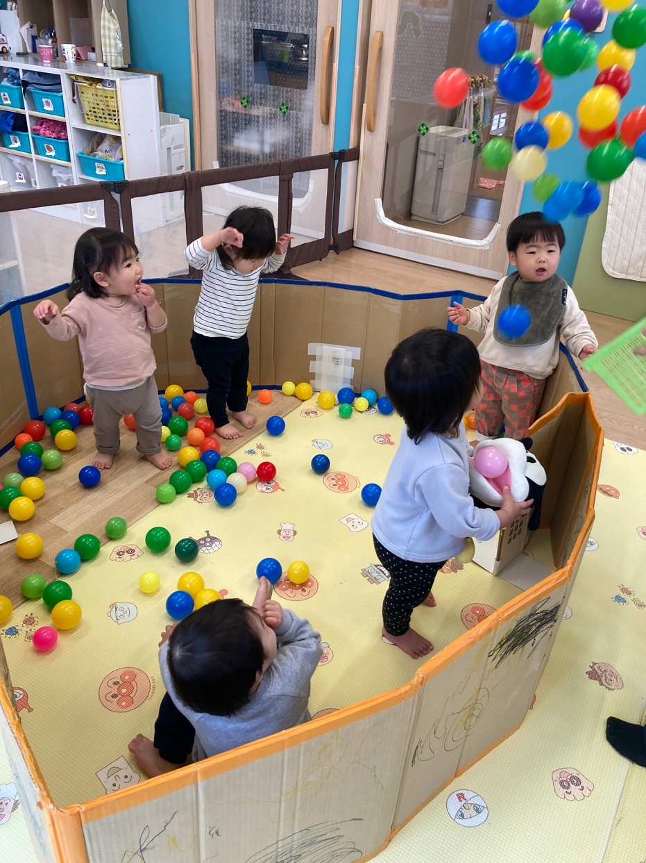 ボールや滑り台で遊びました♪保育者が箱に入れたボールを"ぽーーん"と出すと「きゃあ~♪」と大きな声を出して喜んでいました!