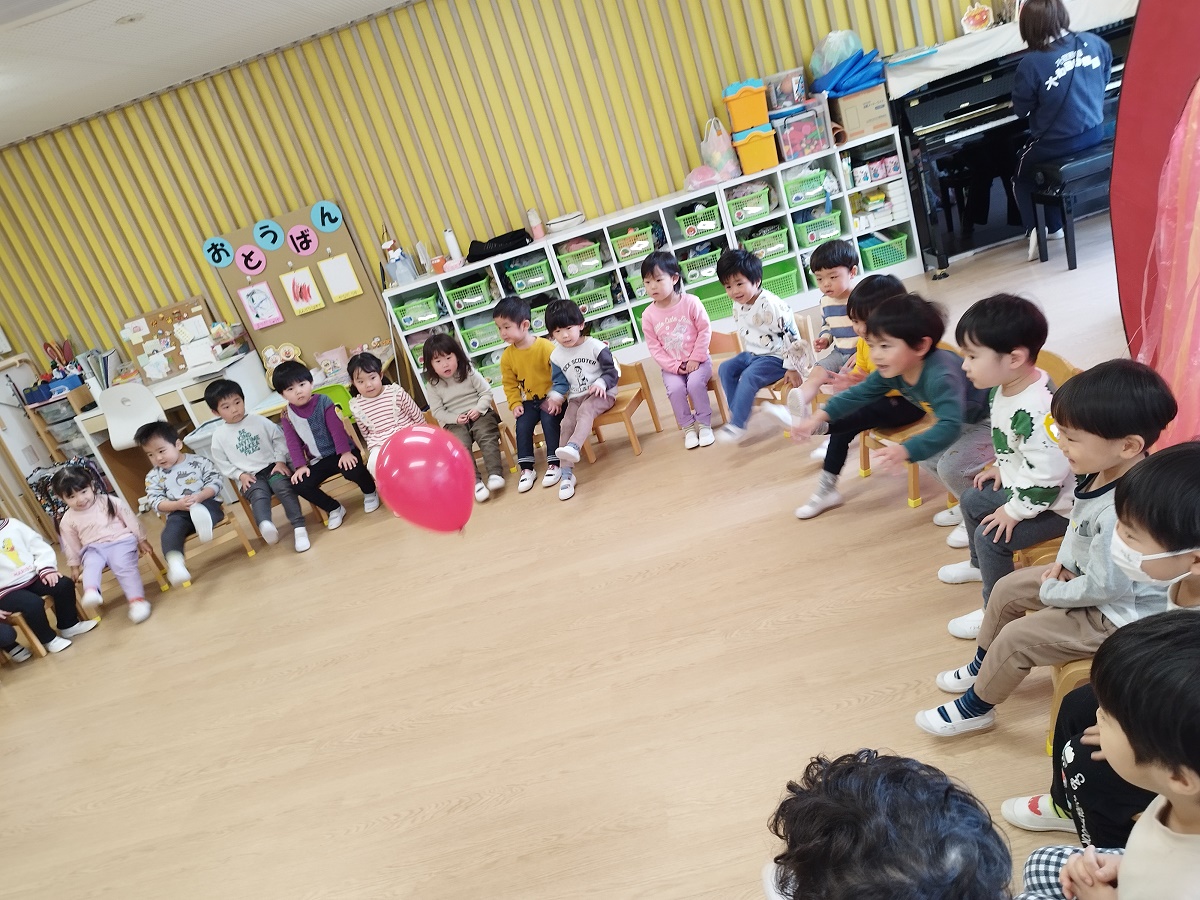 ひよこ組さんと一緒に"爆弾ゲーム"をしました!ピアノが止まった時に赤い風船を持っている子どもは頭が"ちりちり"になっちゃったり、青い風船は"カチン コチン"に凍っちゃったり、緑の風船は恐竜にかじられたり!!など面白いルールを作りながら楽しみました♪「あしたもしよう!!」とまだまだ遊び足りない子どもたちでした!