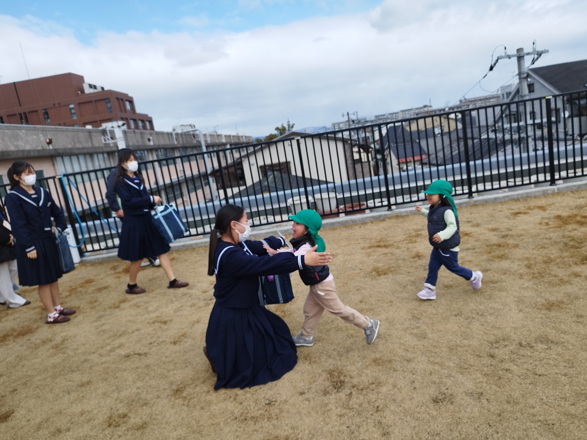 空庭で遊びました♪大久保中学の学生さんたちがくると嬉しそうに駆け寄る子ども、恥ずかしくて遠くに逃げて行ってしまう子ども様々でした(笑)
