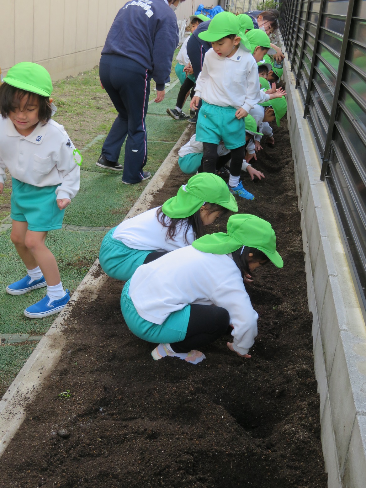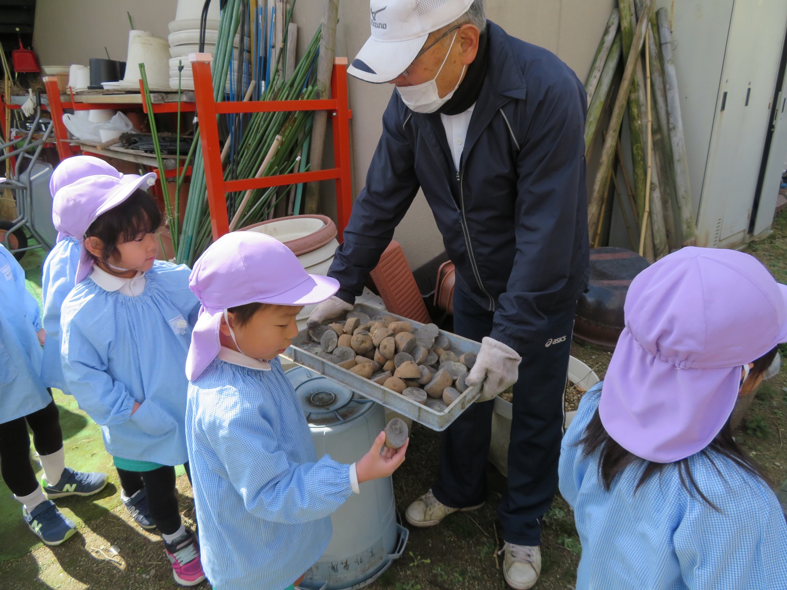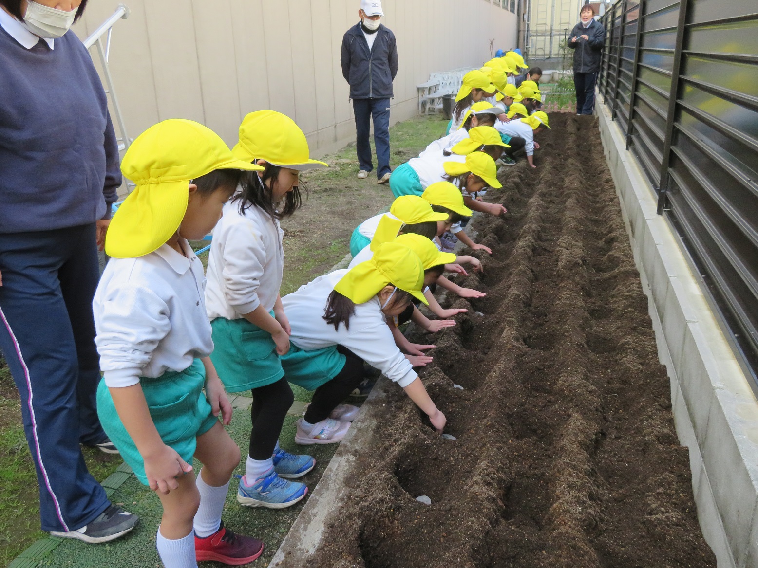 年中組の子どもたちは、施設長に植え方を教えてもらいじゃがいもを植えました!