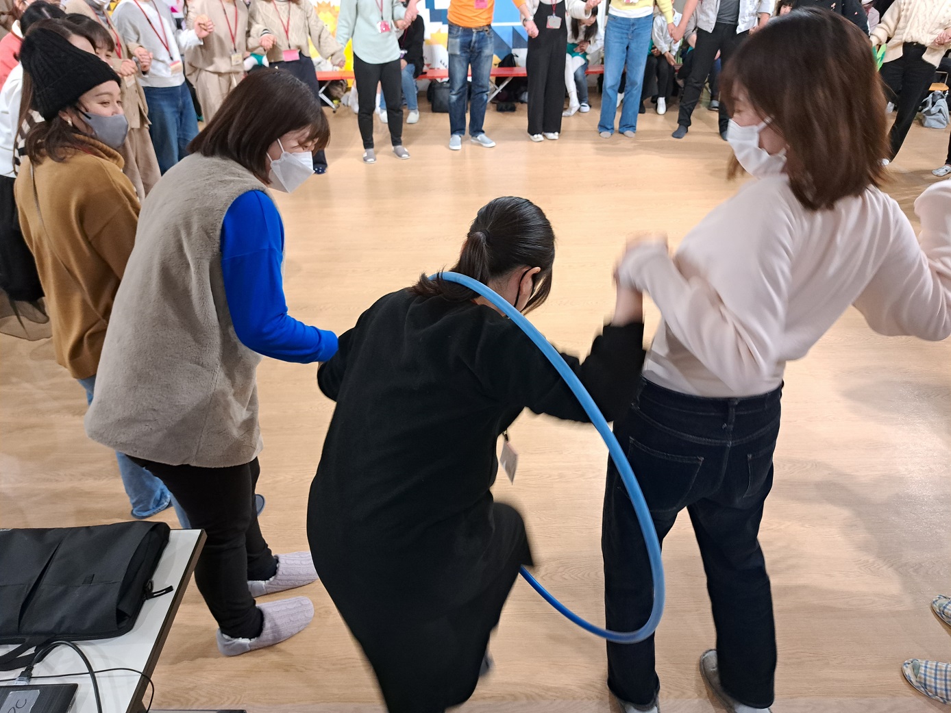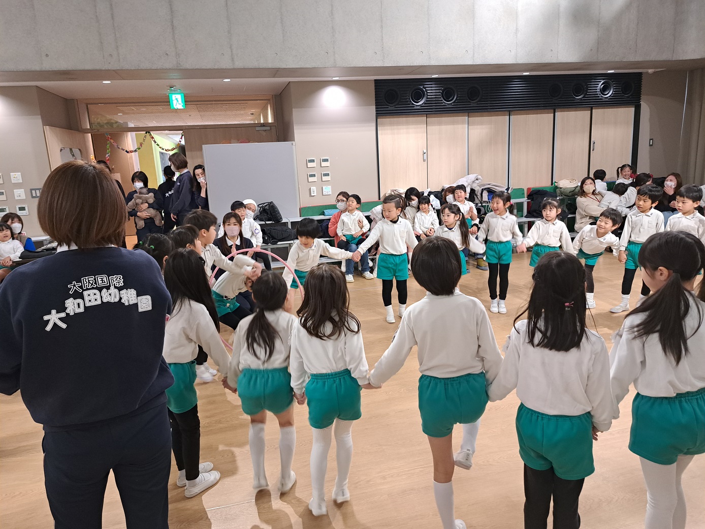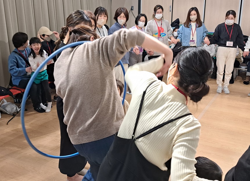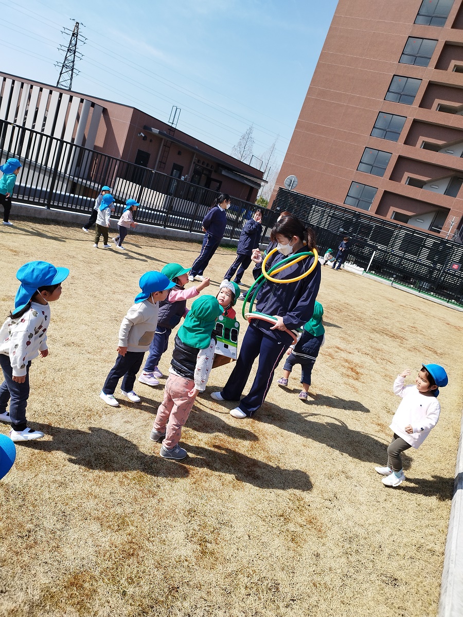 "フープ送り競争"をしましたが、どのクラスも子どもたちの勝利です♪