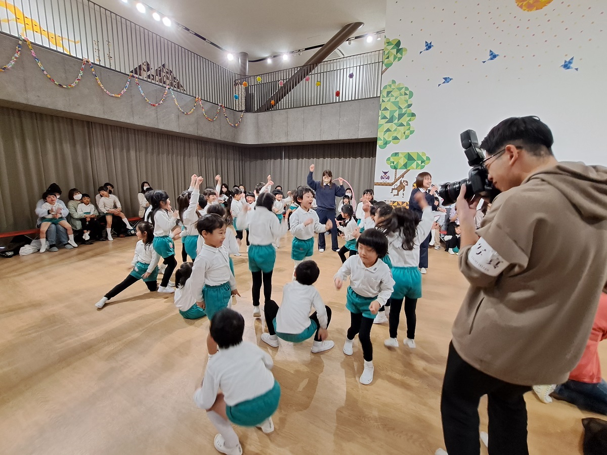 年少組担任、年中組担任、ひよこ組担任、はな組の先生、3号の先生、担任外の先生総勢14人で、「前向きスクリーム」を演奏して、子どもたちも一緒に踊りました!