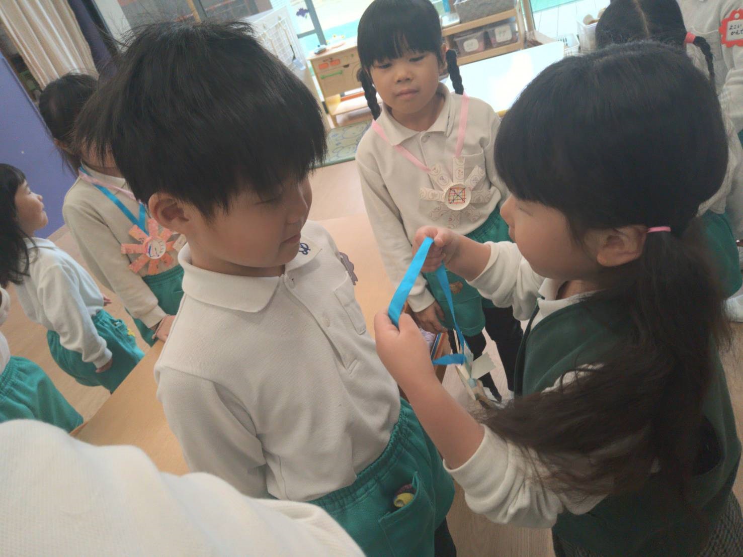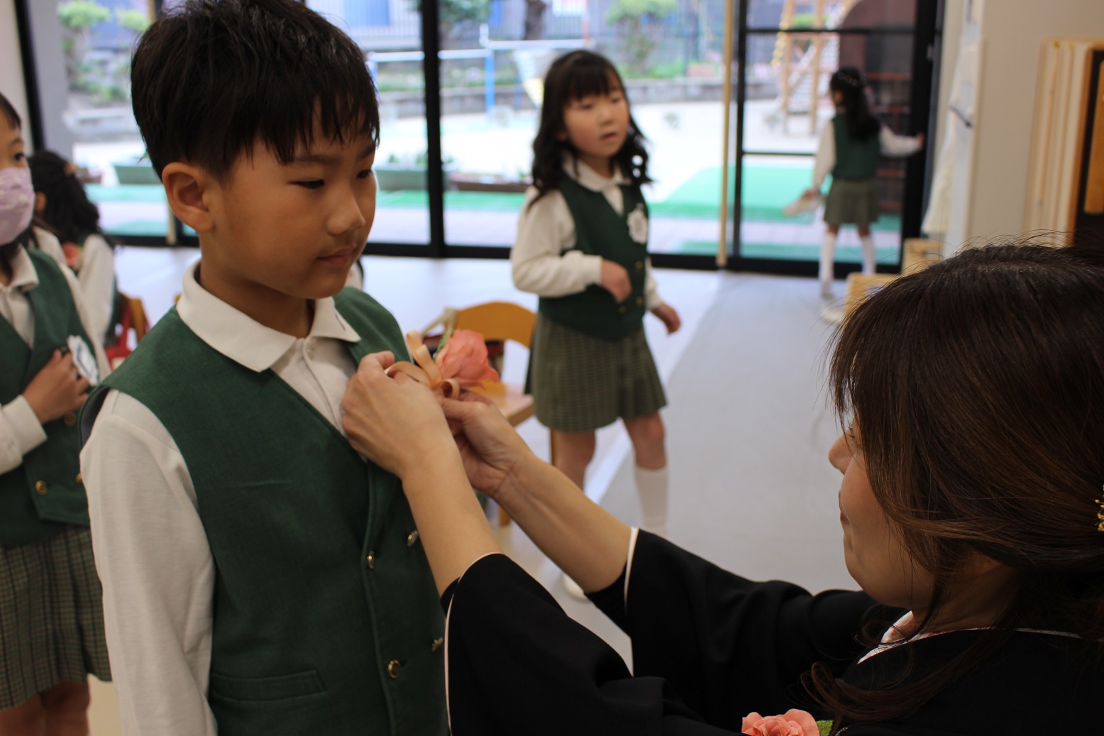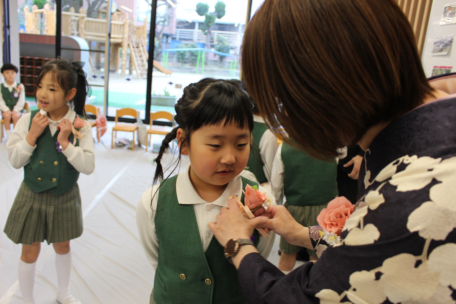 子どもたちは緊張しながらもニコニコと登園し、胸にコサージュをつけてもらいました。