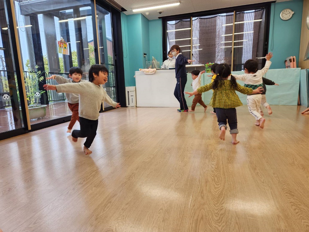 空庭で遊びました♪「まて~」とみんなで鬼ごっこ!追いかけても追いかけても終わりがありません!子どもたちの無限の体力に大人はついていけません...(笑)