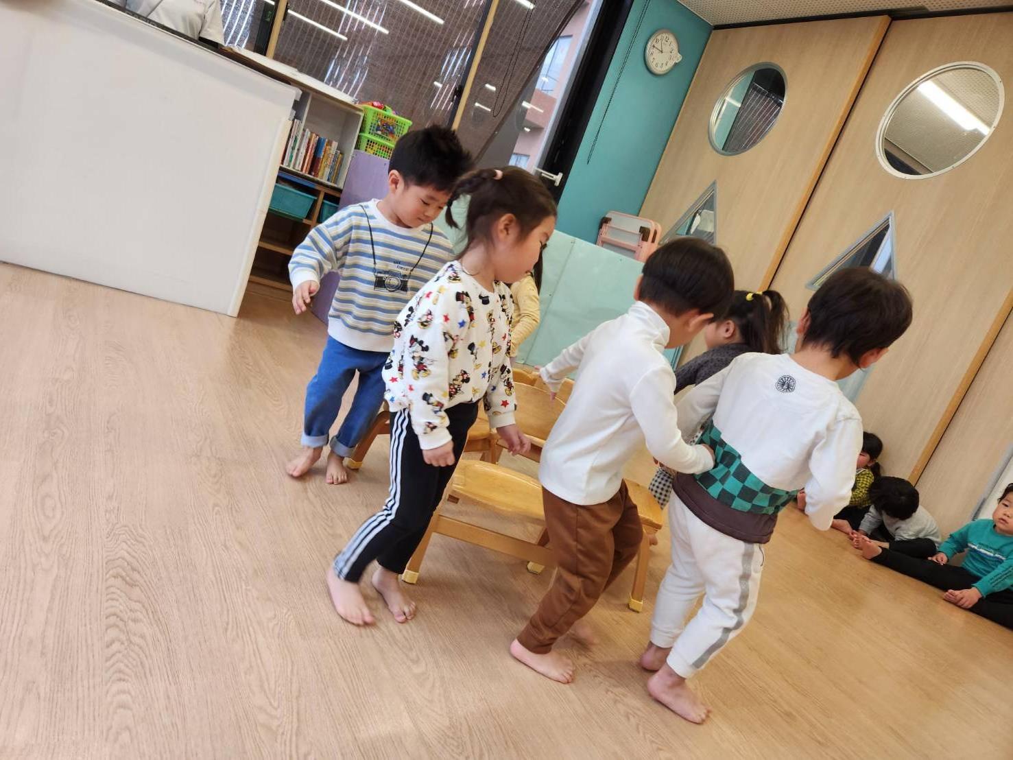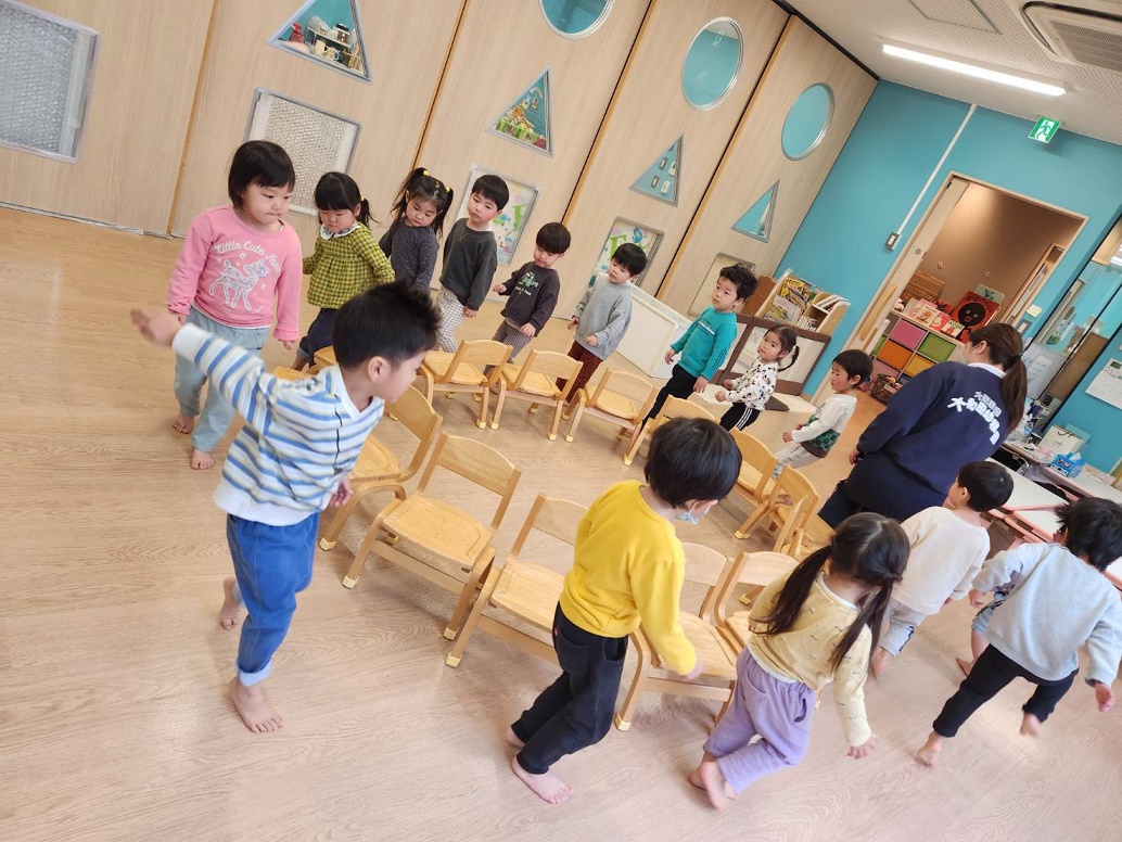 ピアノに合わせてリズム遊び♪いろいろな動物さんになりきって動いていました。その後は"イス取りゲーム"!初めは余裕の表情の子どもたちもイスが少なくなってくると真剣に...負けると悔しくて泣いてしまうお友だちもいましたが、それもまたゲームの面白い所ですね♪