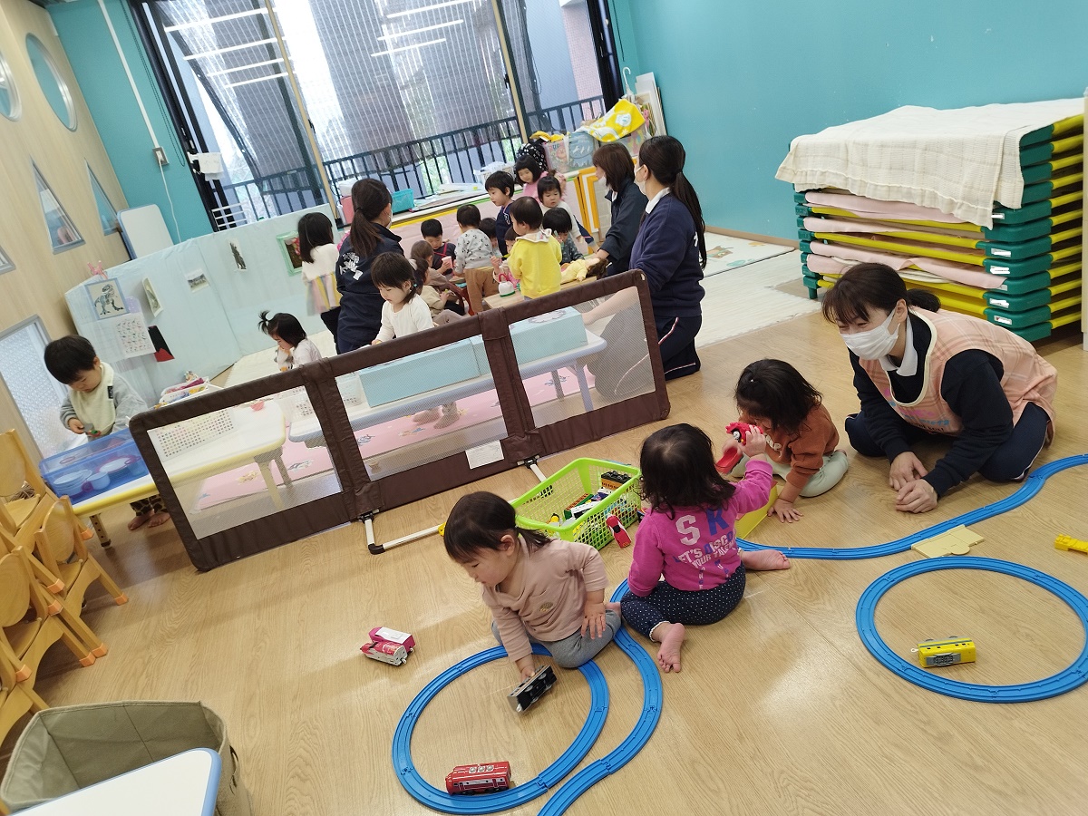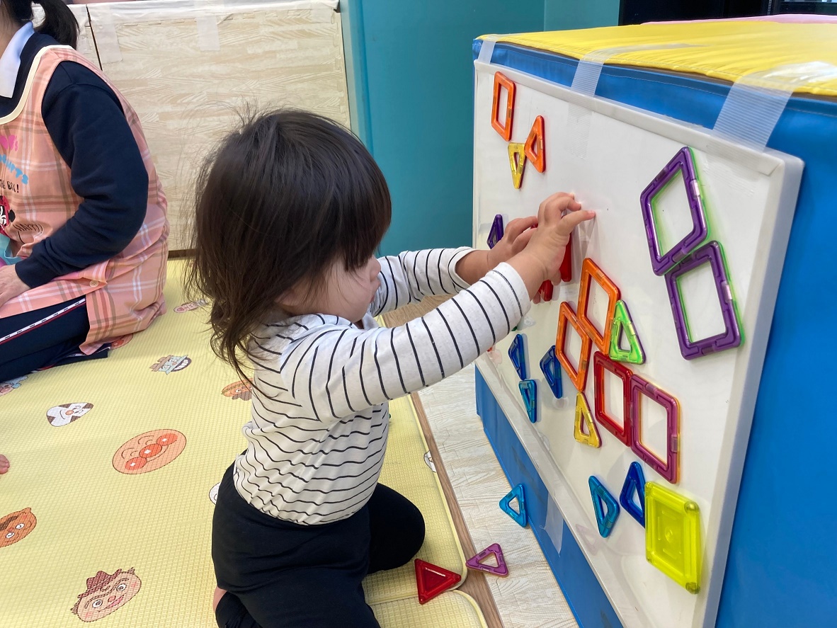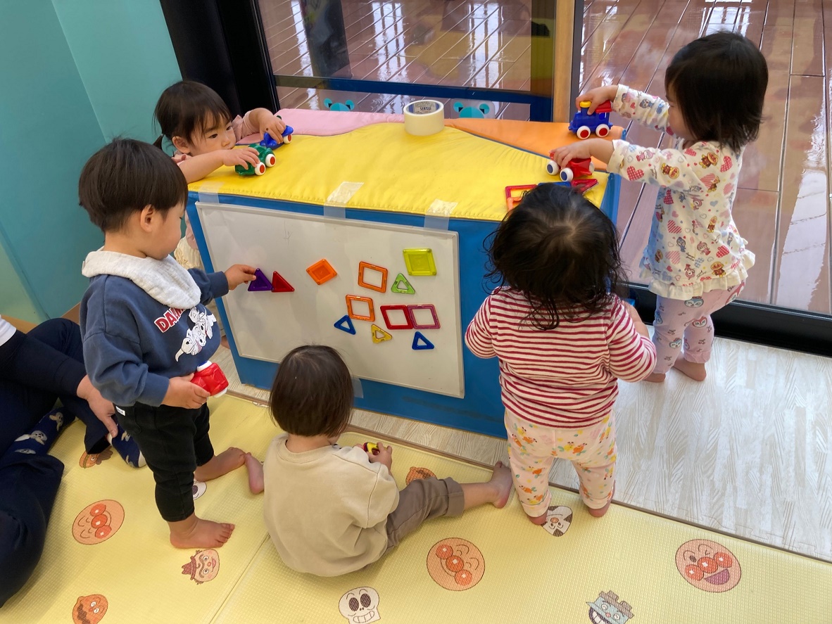雨なので保育室でゆったりまったり過ごしました♪大好きな乗り物やマグネットのおもちゃで楽しそうに遊んでいました♪車用にと、坂を作りましたが子どもたちが「しゅー♪」と嬉しそうに滑っていました(笑)
