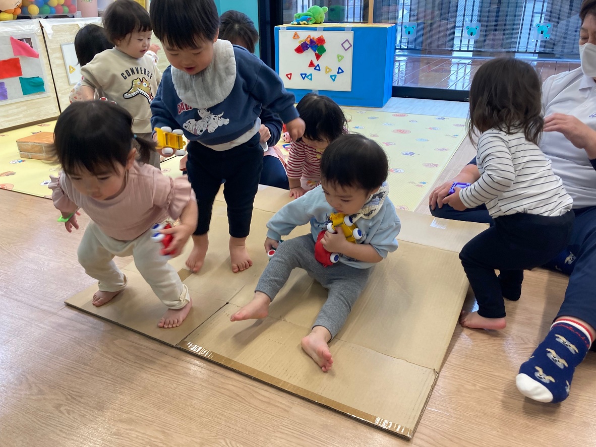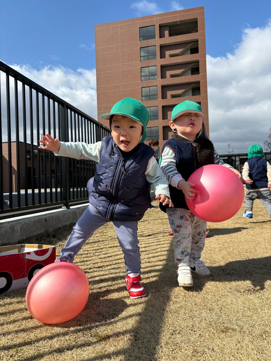 空庭で遊びました♪ダンボールの乗り物に乗りこんで嬉しそうに電車ごっこを楽しんだり、ボールを"えーい!"と遠くまで蹴ったり、元気いっぱいの子どもたちでした♪