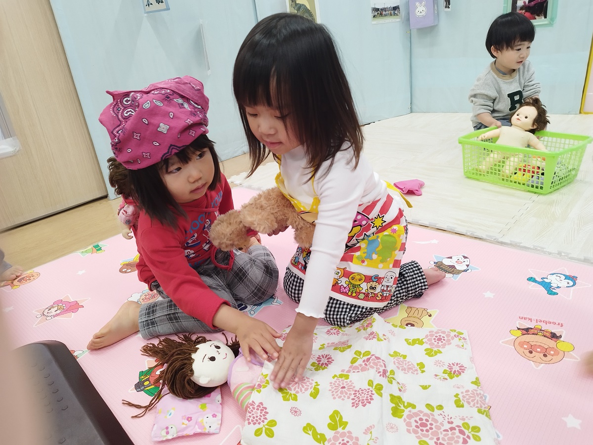 人形遊びをしました♪エプロンに三角巾を付けてパパやママに変身!!おんぶしてみたり、お風呂に入れてあげたりみんな嬉しそうにお世話を楽しんでいました♪