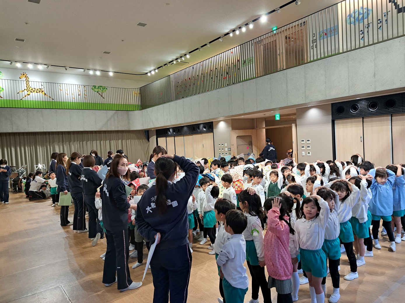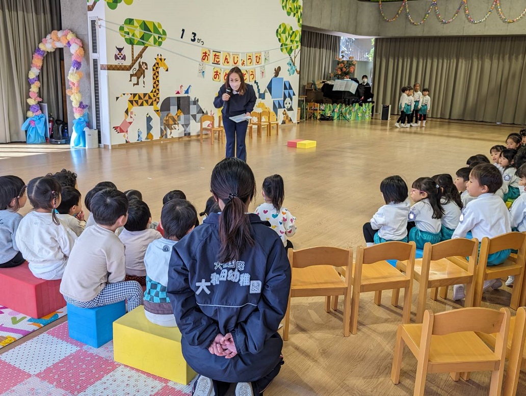 子どもたちが登園した直後だったので、着替えていたり、まだカバンを背負っている子どももいたりしましたが・・・