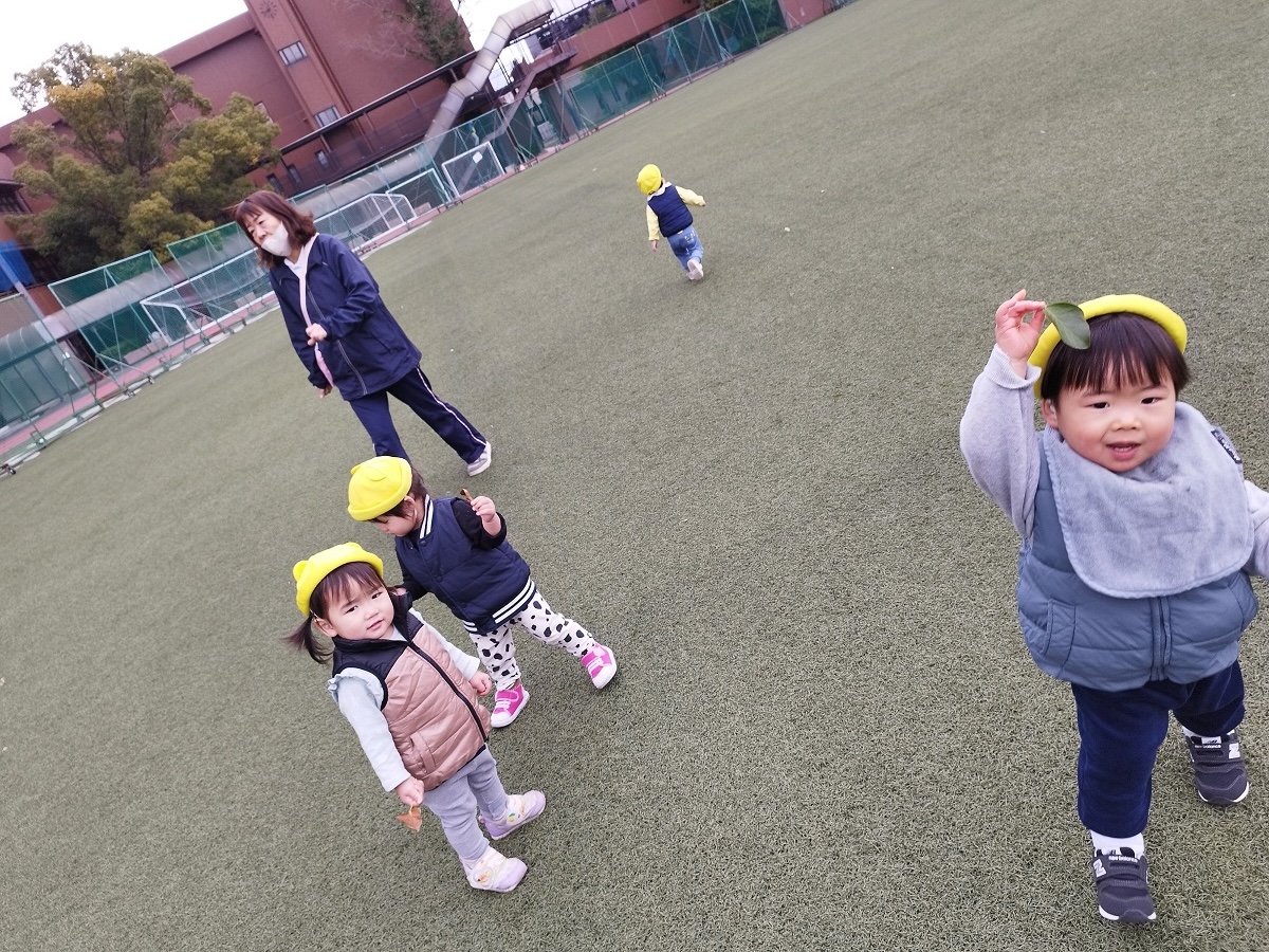 今日は大学グラウンドに遊びに行きました♪天気の良く陽が当たるとポカポカして気持ちよかったです!清掃員の方たちが気になるこあら組の子どもたち。集めた葉っぱを「ぱっぱ!」と嬉しそうに見せていました♪