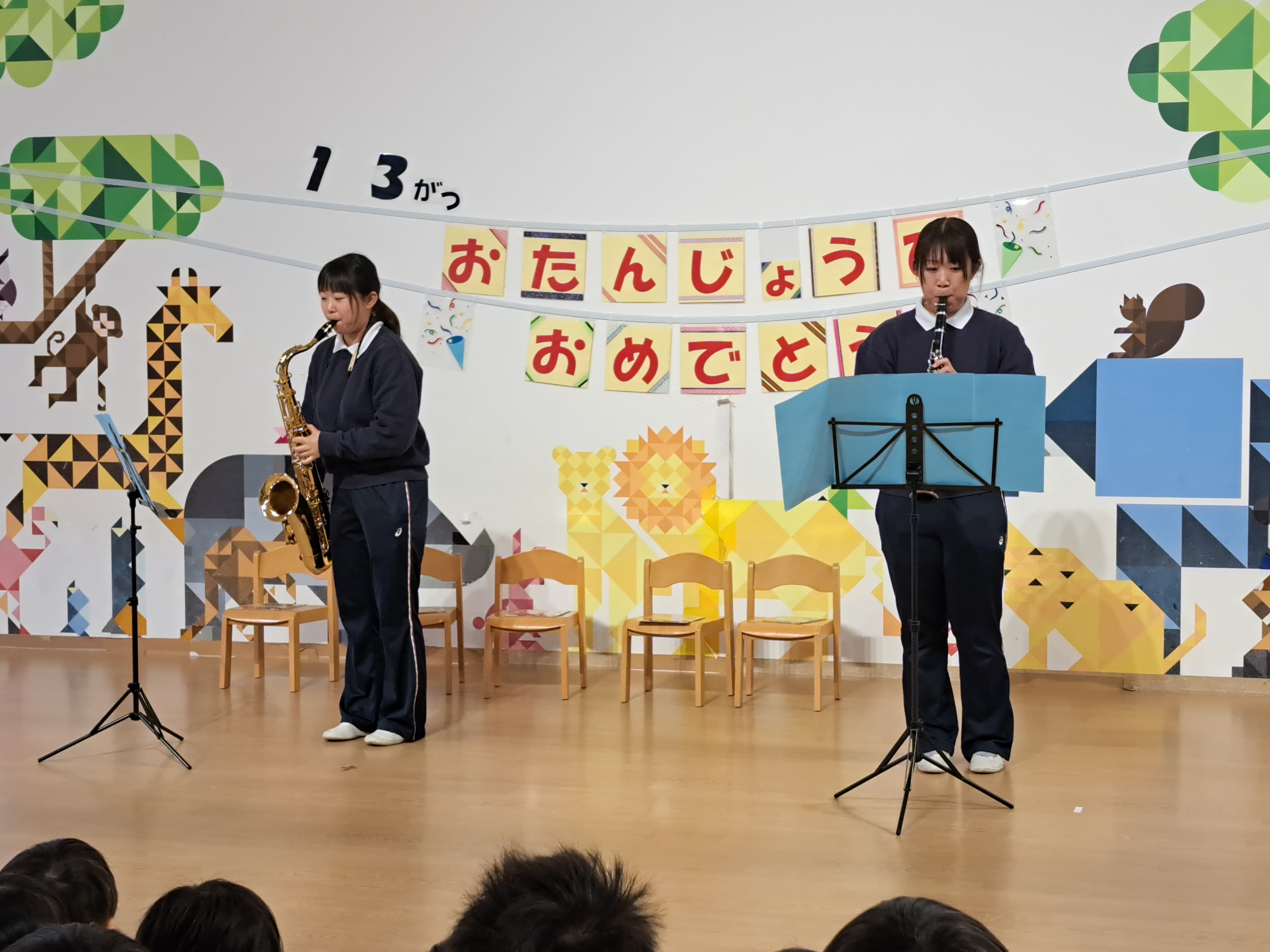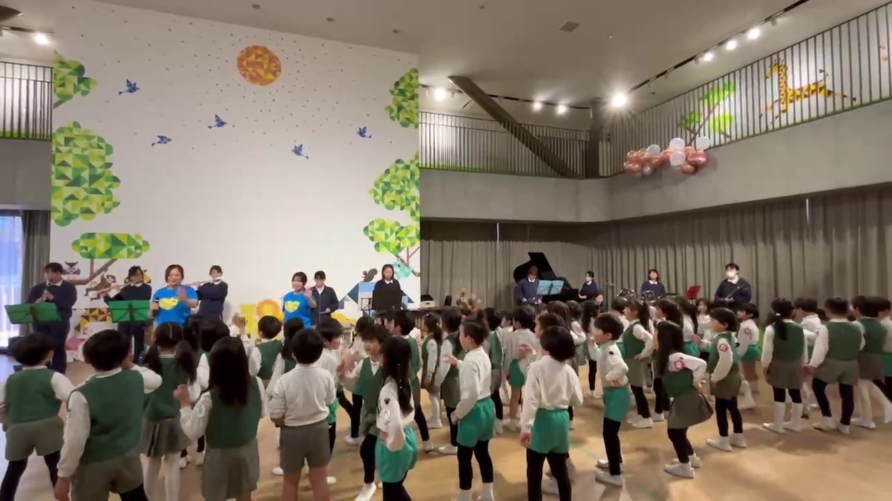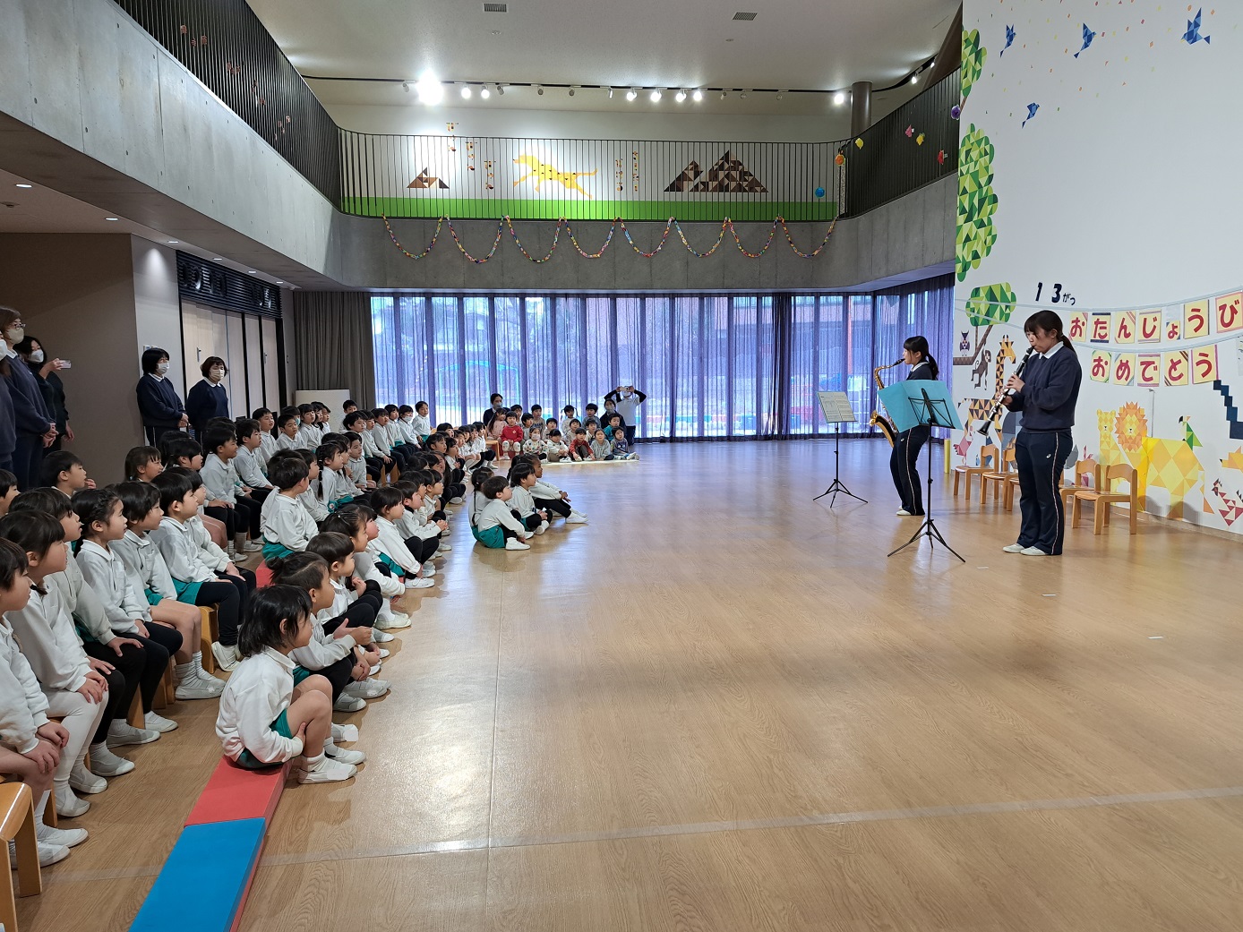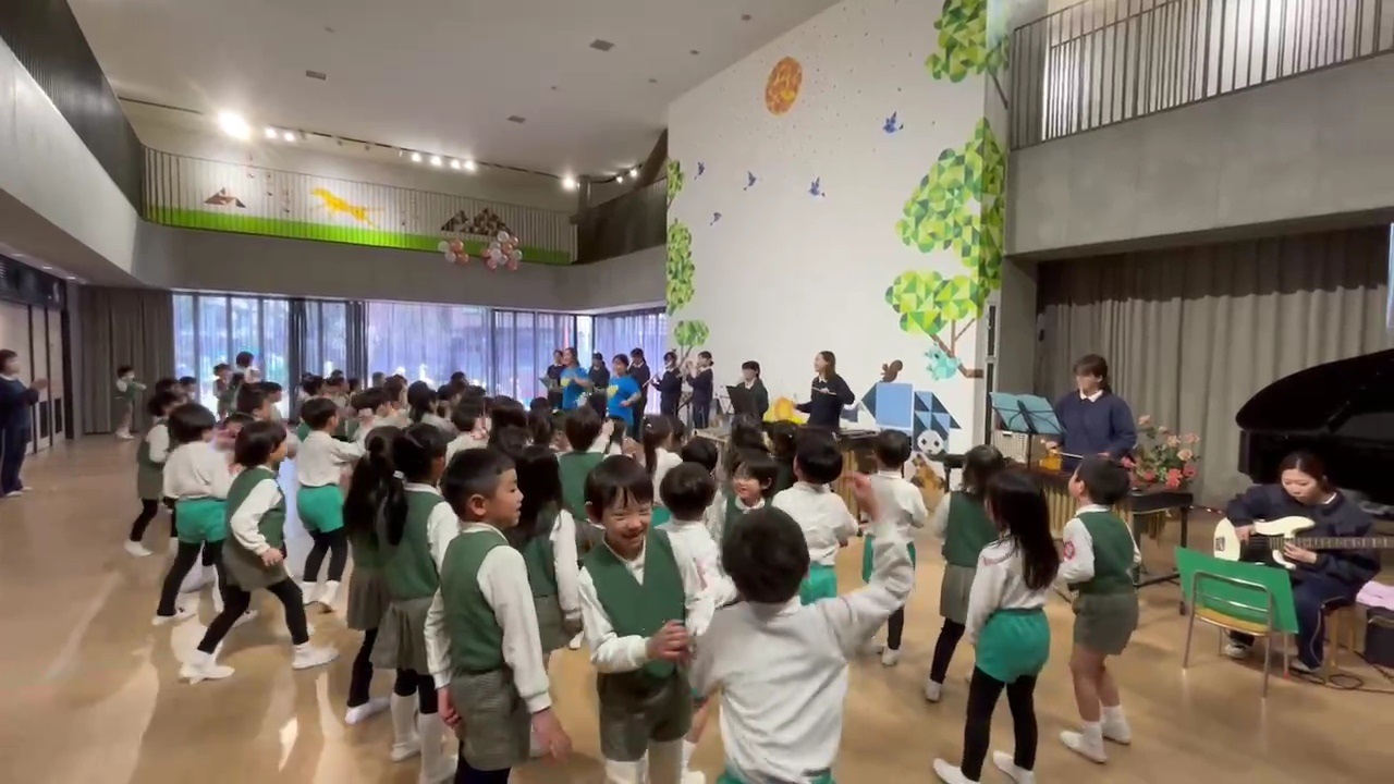 今日は幼稚園の3月生まれのお友だちのお誕生日会がありました!年中の先生たちがお祝いのプレゼントにステキな楽器演奏をすると聞き、ぱんだ組の子どもたちも参加させてもらいました!いつもと違う雰囲気に少し緊張していましたが、徐々に楽しい表情に!!終わった後はみんなが「たのしかった♪」とお話してくれました。