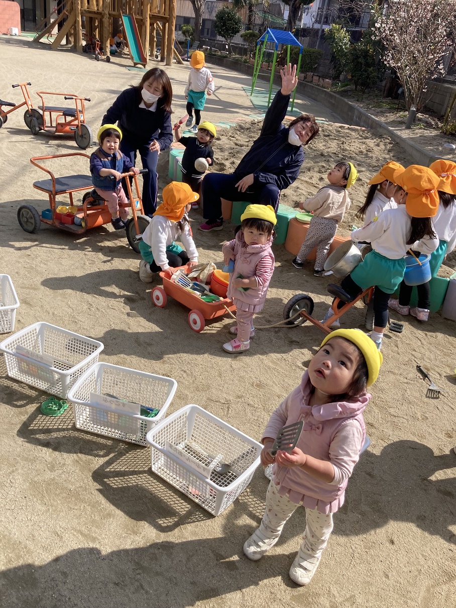 園庭で遊びました♪、砂場で嬉しそうにままごと遊びを楽しんでいました♪グランドに遊びに行く幼稚園のお友だちを"いってらっしゃい!"と嬉しそうに見送ったり、空庭にいるお友だちに「おーい!」と手を振ったりしていました♪