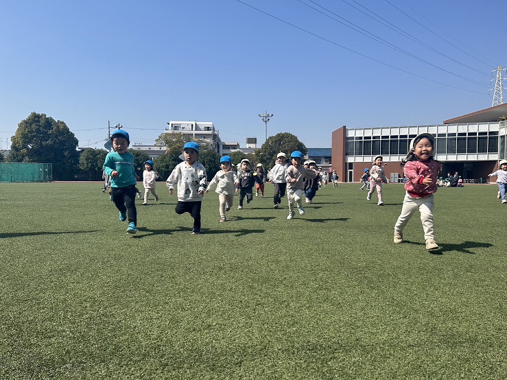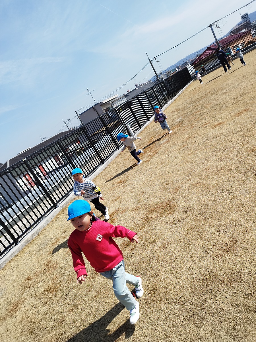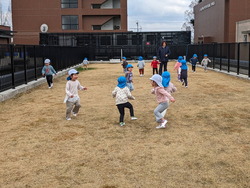 空庭で遊びました♪寒かったのでみんなで鬼ごっこ!鬼役の子どもたちが一生懸命追いかけ、最後はみんなつかまってしまいました♪「おにしたーい!」と鬼役が大人気です!