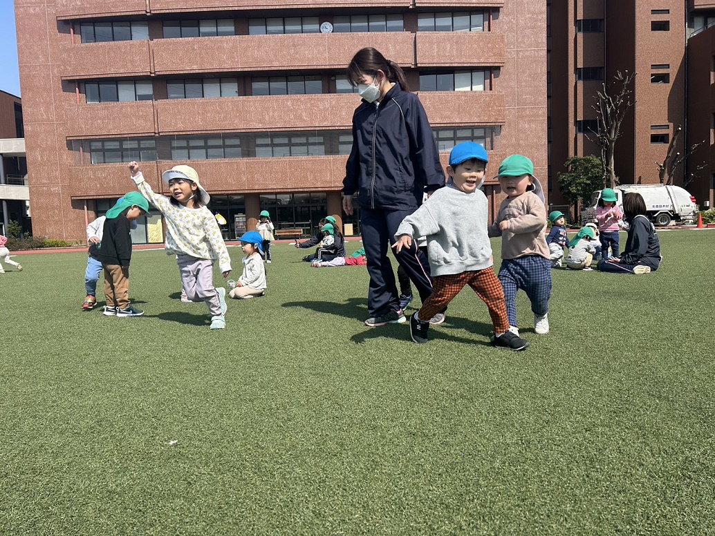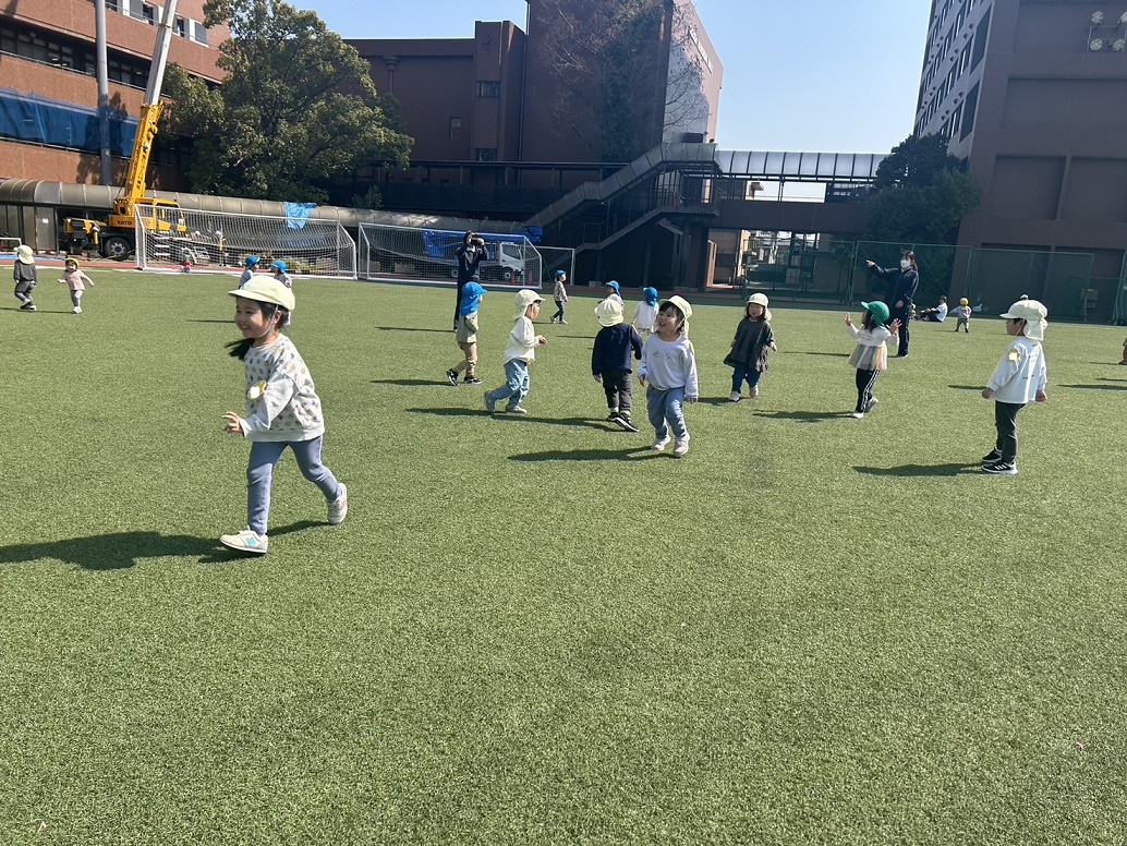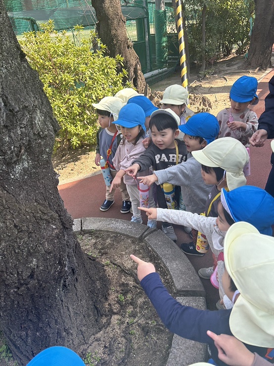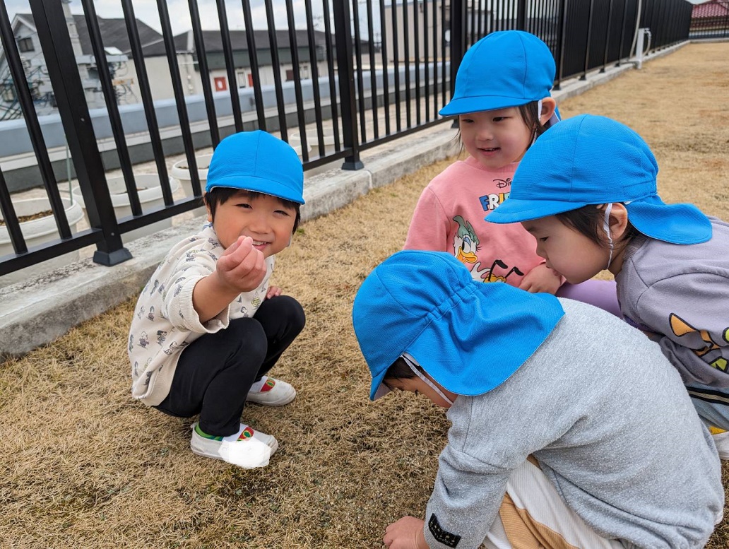 今日は3号全員とひよこ組で大学グラウンドに遊びに行きました♪「むしさんいないかな?」とワクワクしながら散歩していると、木にくっついているカメムシや小さな白い花を見つけました!土日は今日みたいに暖かいので桜のつぼみも膨らんできそうですね♪