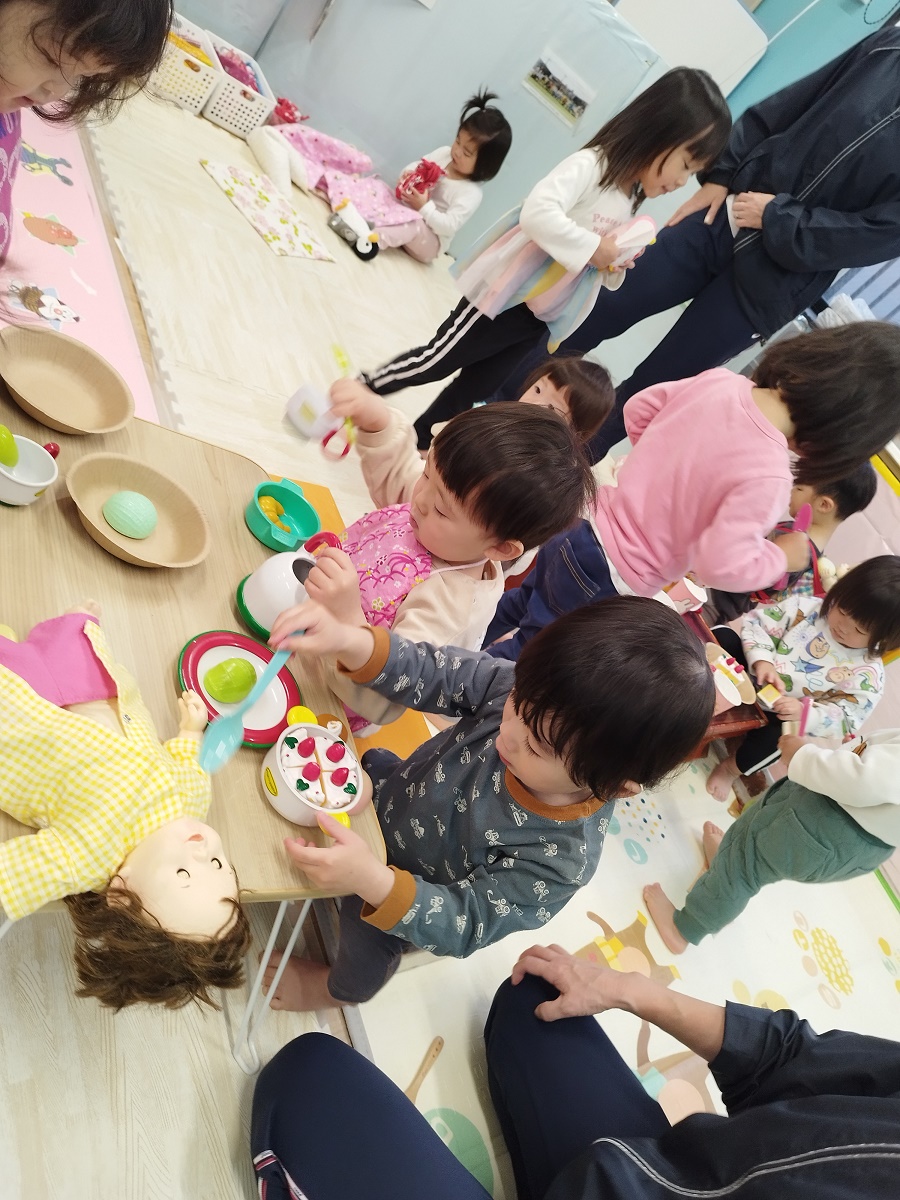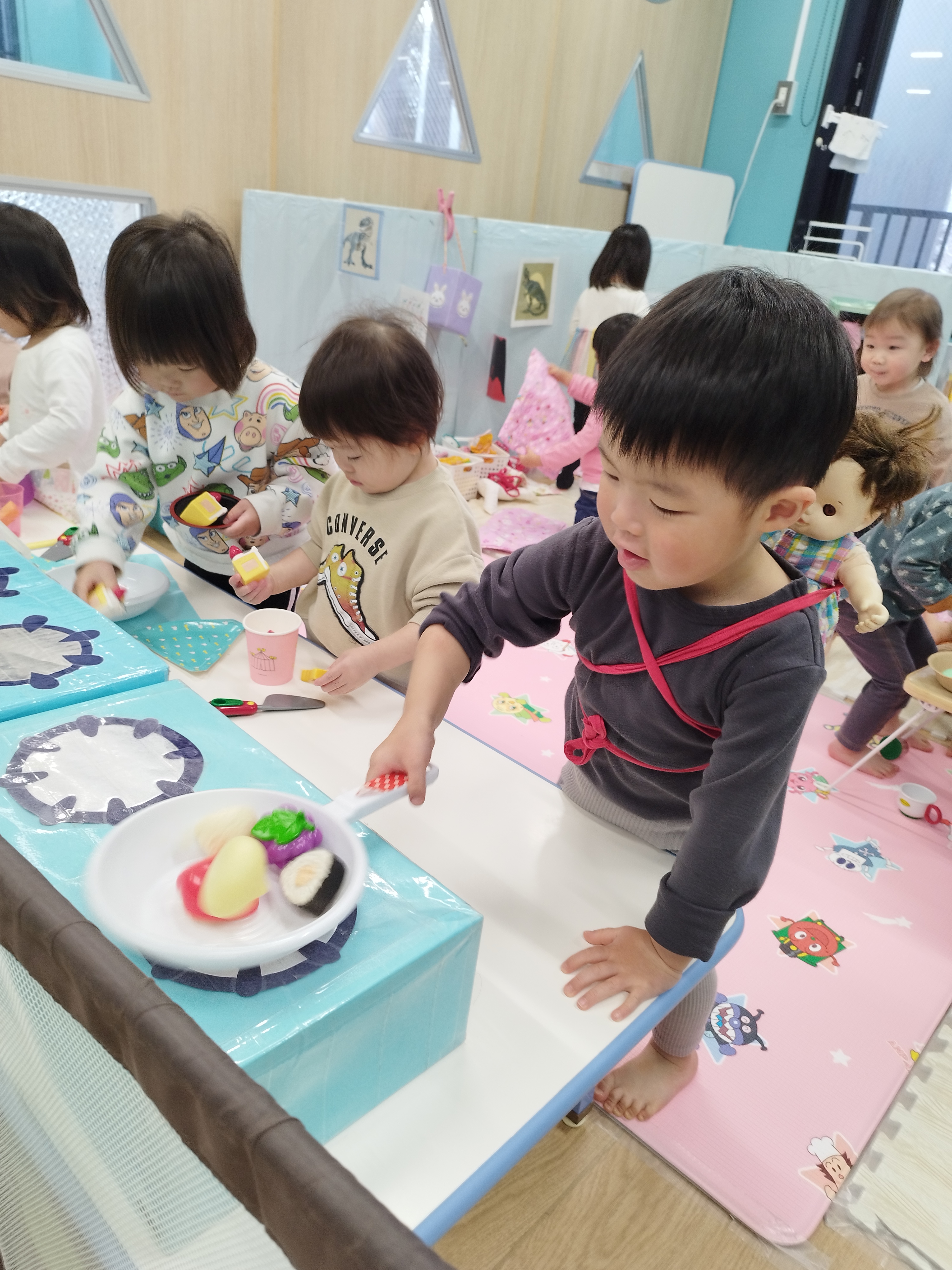 今日は2クラス一緒におままごととプラレールで遊びました!エプロンゃ三角巾をつけてカワイイお母さんとお父さんがいっぱい♪テーブルにごちそうをたくさん並べてパーティーを楽しんでいました!