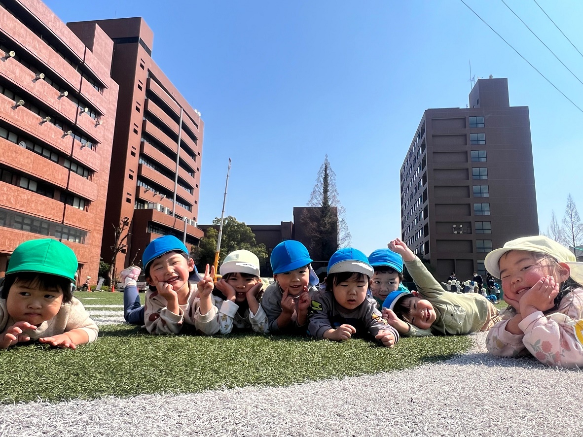 みんなでごろ~んと寝転んだり、追いかけっこしたりして遊びました♪グラウンドにクレーン車が止まっていて子どもたちは「すごーい!」と目を輝かせながら見上げていました