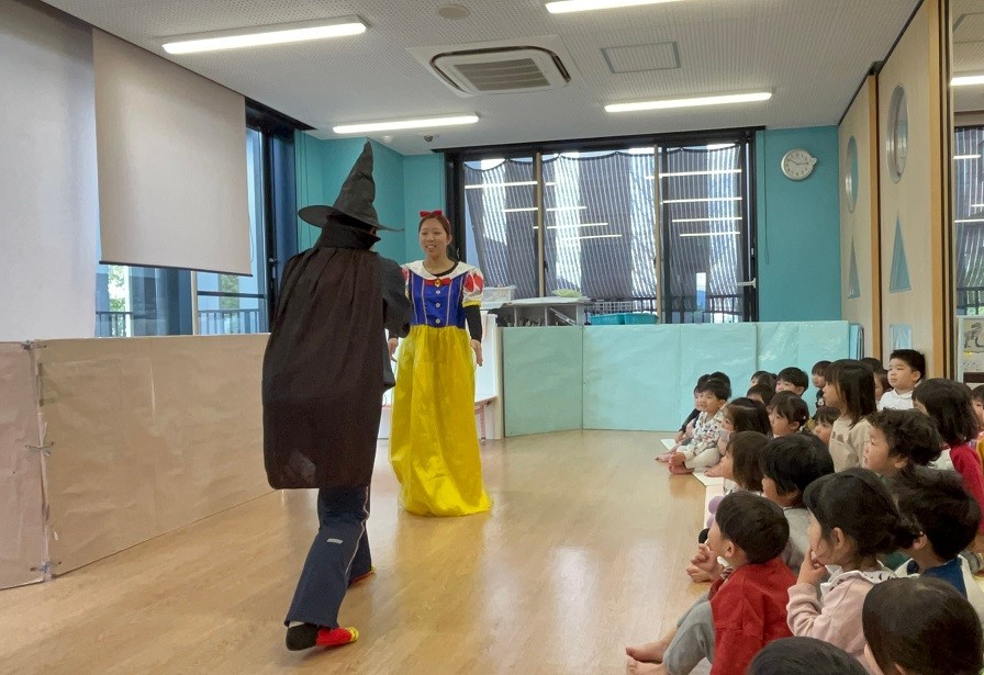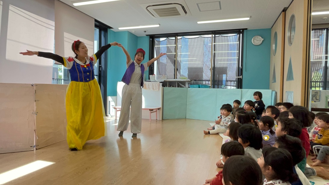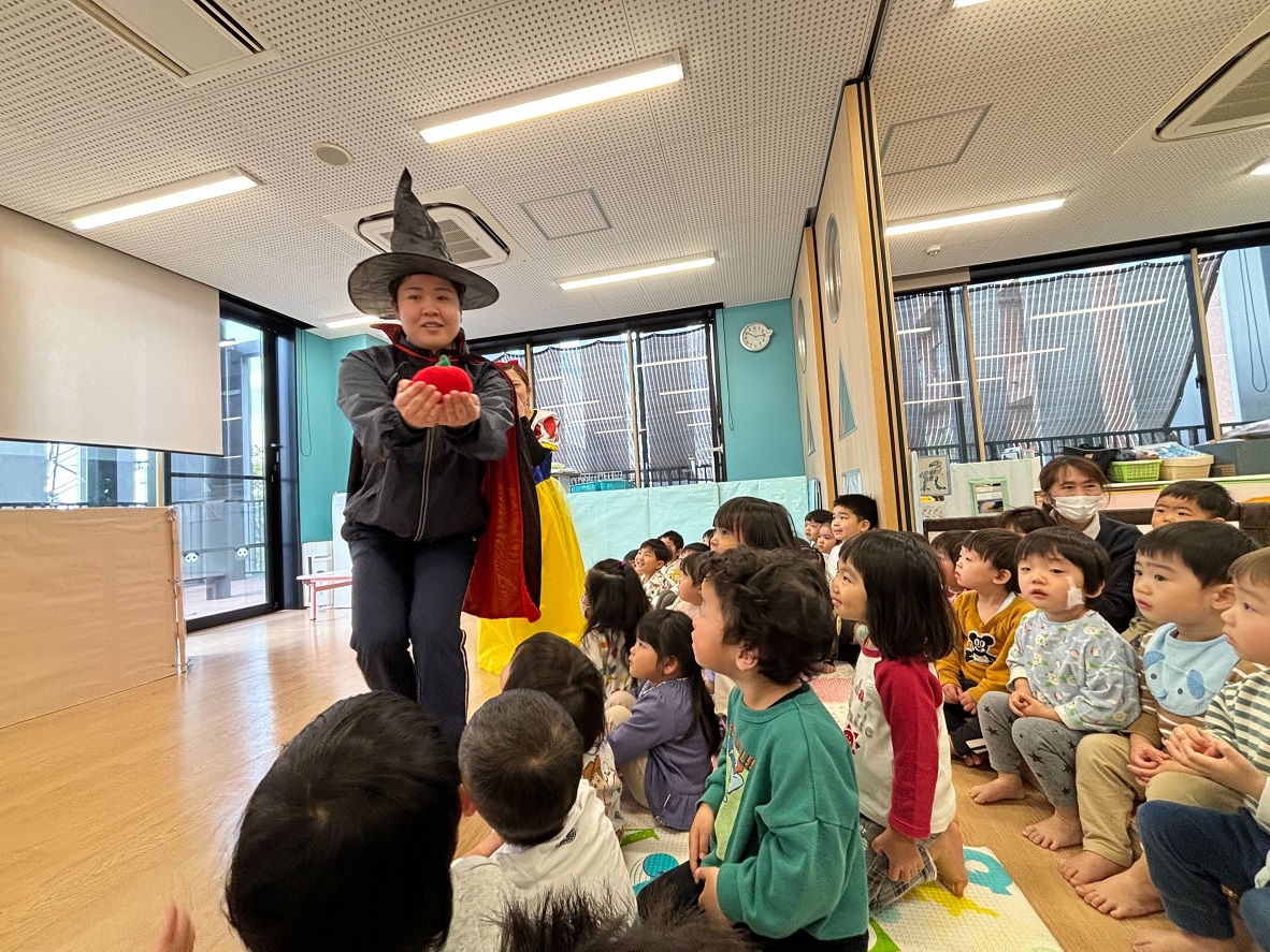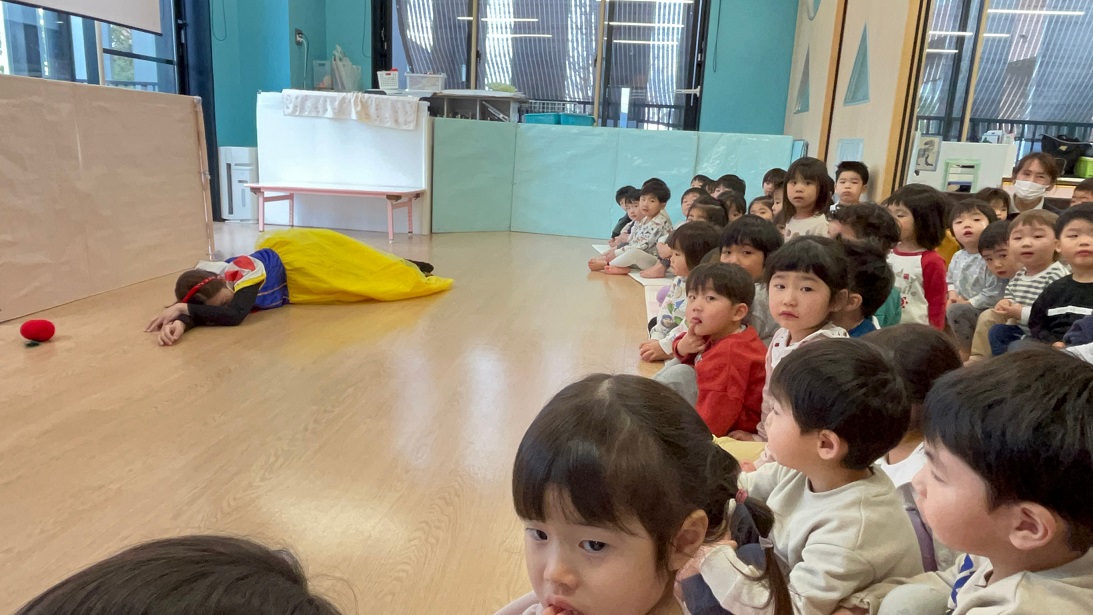 今日はぱんだ組さんの3月生まれのお友だちのお誕生日会をしました♪ひよこ組やうさぎ組・こあら組のみんなもお祝いに来てくれ、大人数でのお誕生日会でした!みんなに見られて少し恥ずかしそうな誕生児さんでしたが、得意わざ披露では"ジャンボリーミッキー"を踊ってくれました♪最後は先生たちからのプレゼントで"しらゆきひめ"の劇!笑いがあったり、ドキッとしたりととっても楽しい時間でした♪