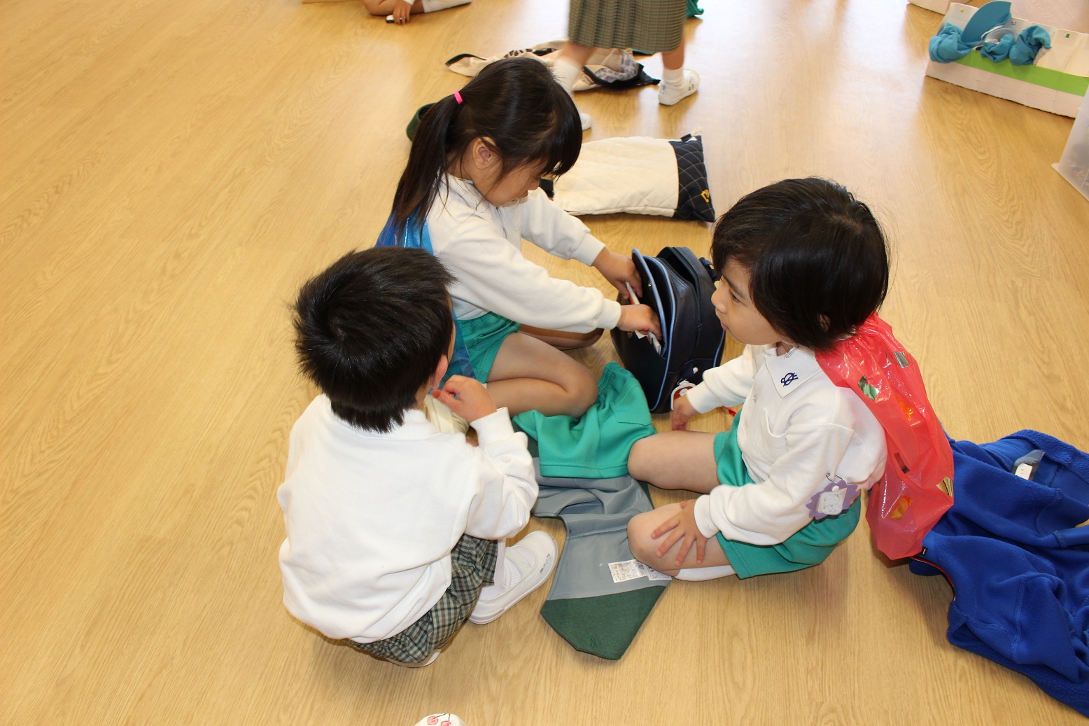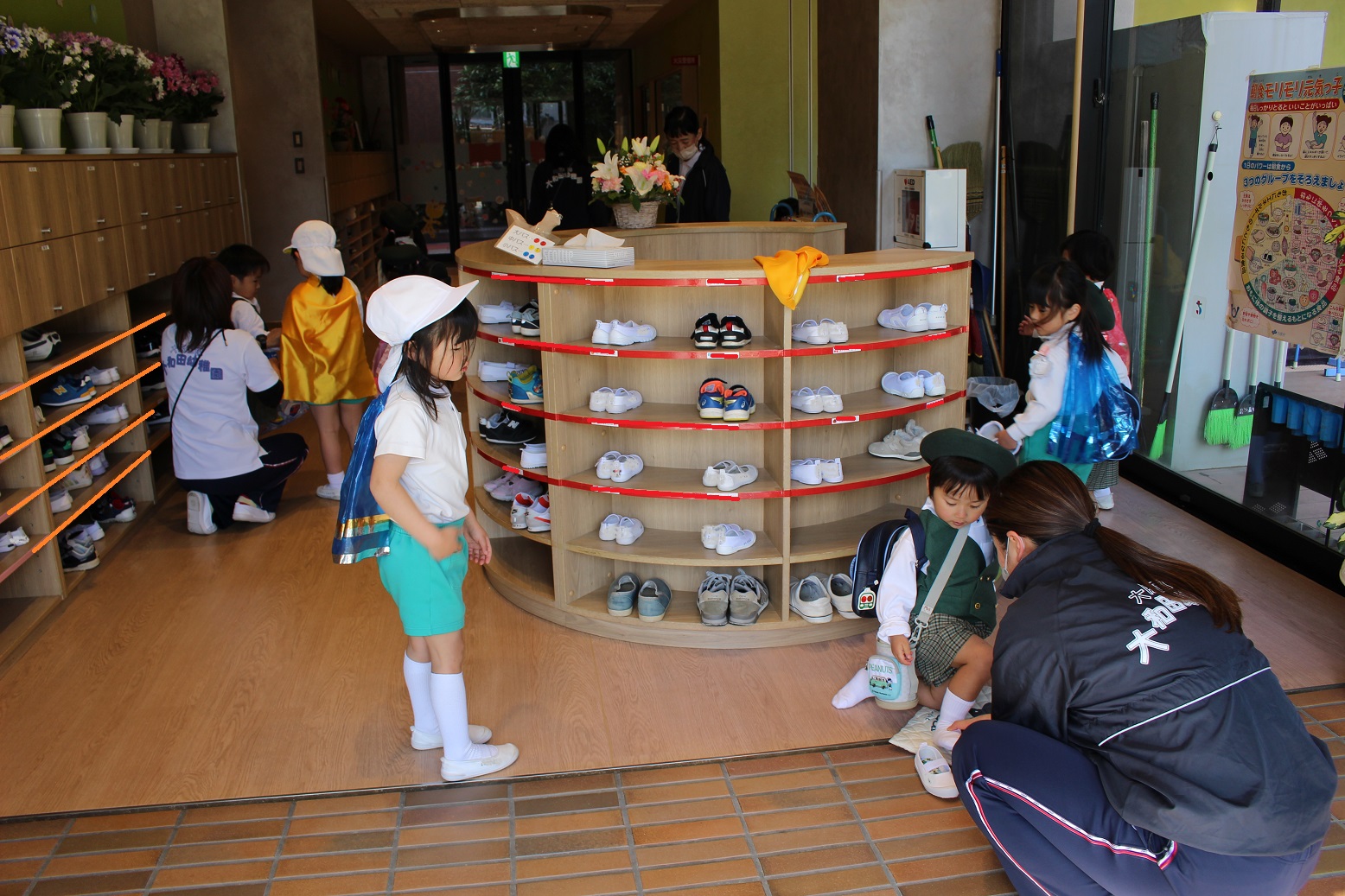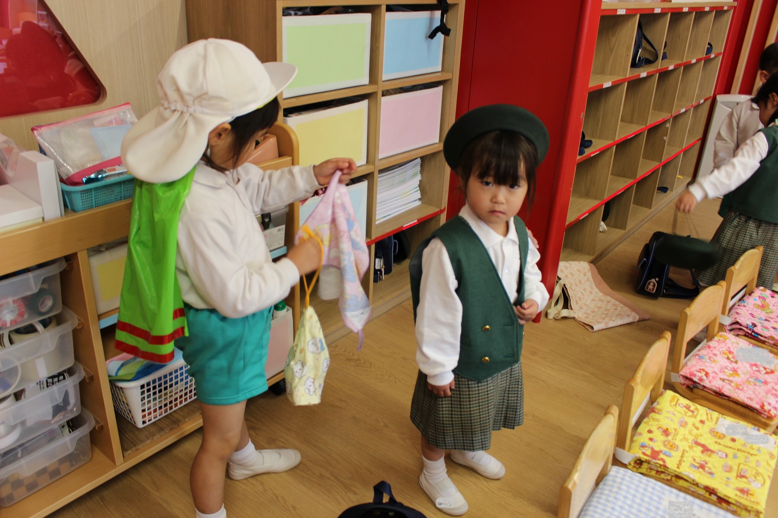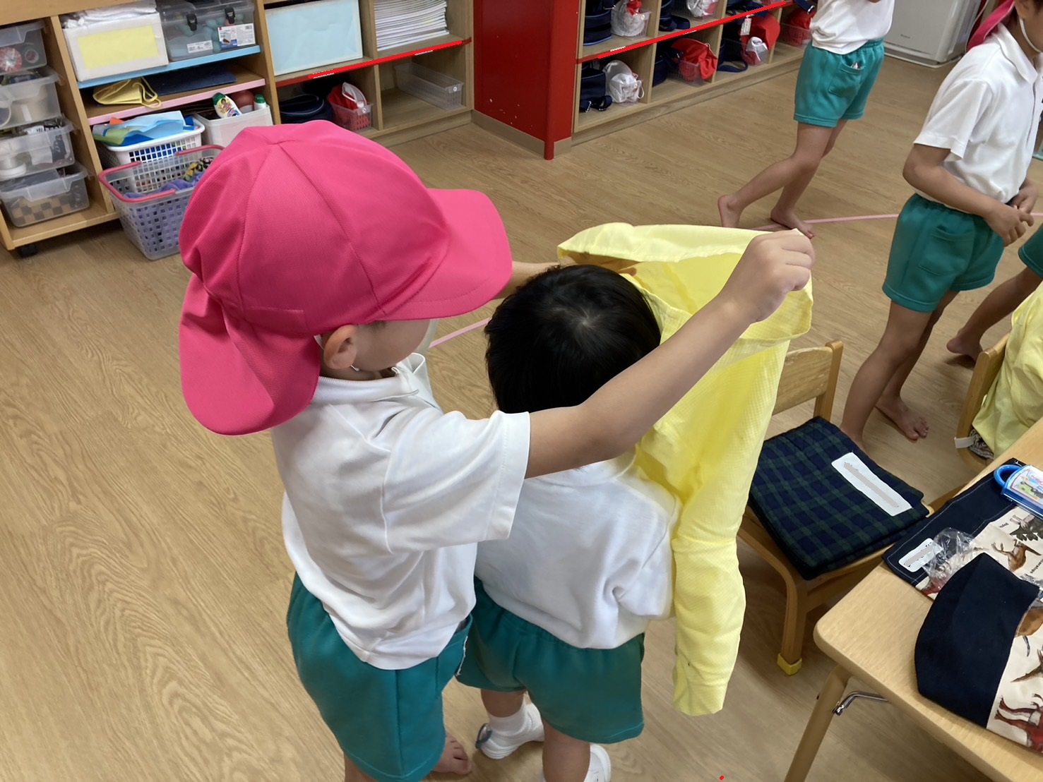 年少児が登園するときには、門からお部屋まで一緒に行ってくれたり、一緒にかばんやタオルを置いてくれたりなど、おたすけマンがたくさんいてくれています。