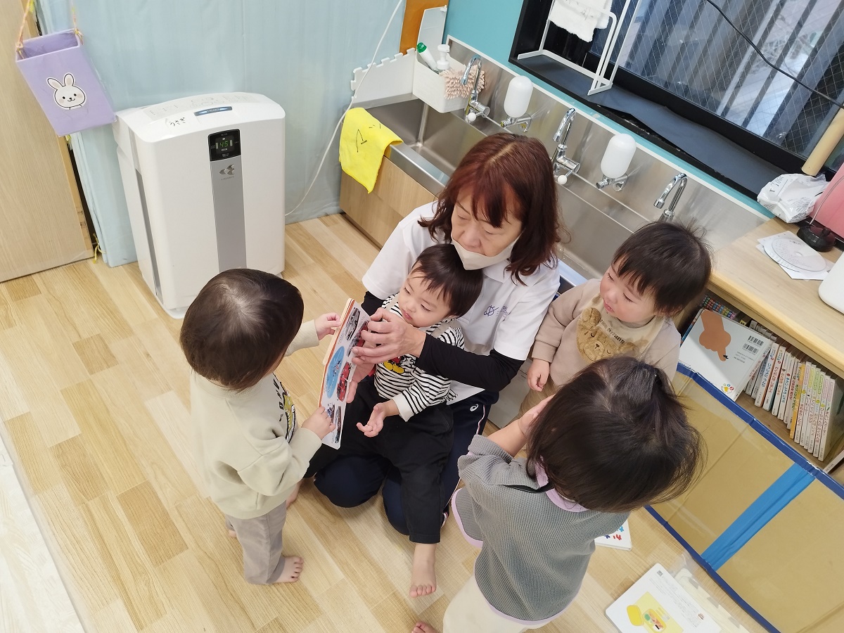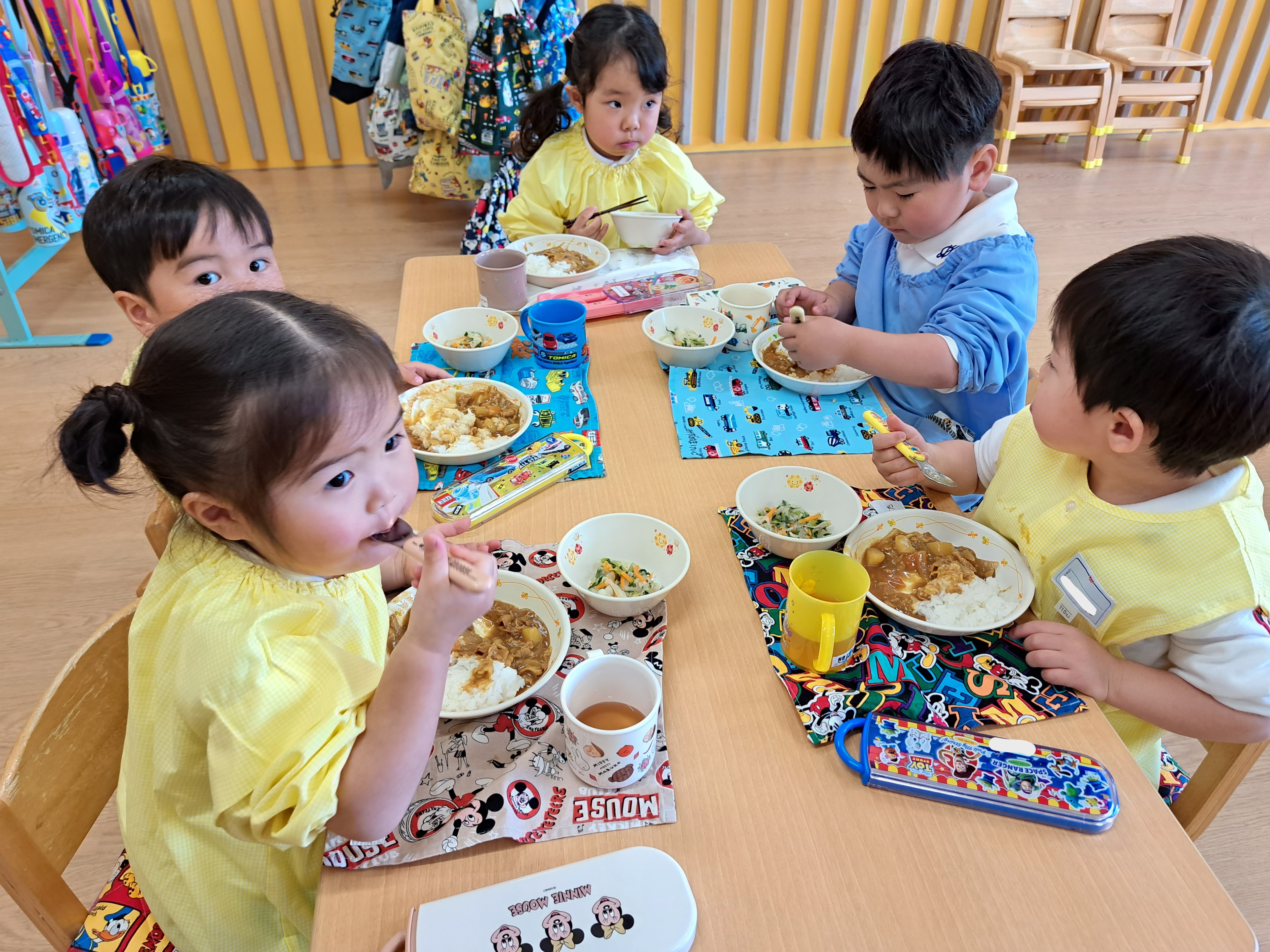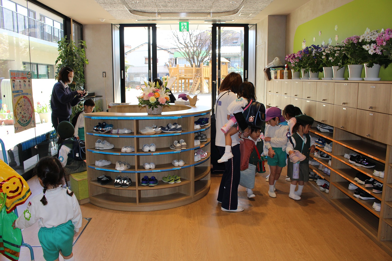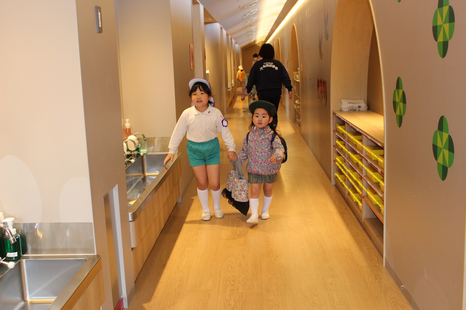 年少児が登園するときには、門からお部屋まで一緒に行ってくれたり、一緒にかばんやタオルを置いてくれたりなど、おたすけマンがたくさんいてくれています。