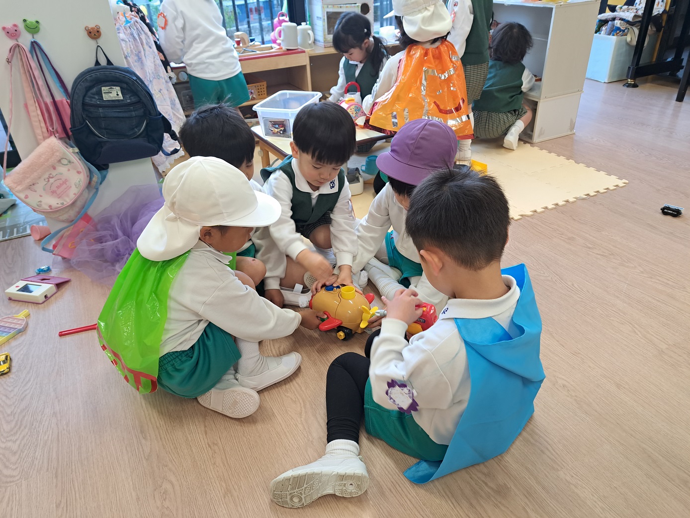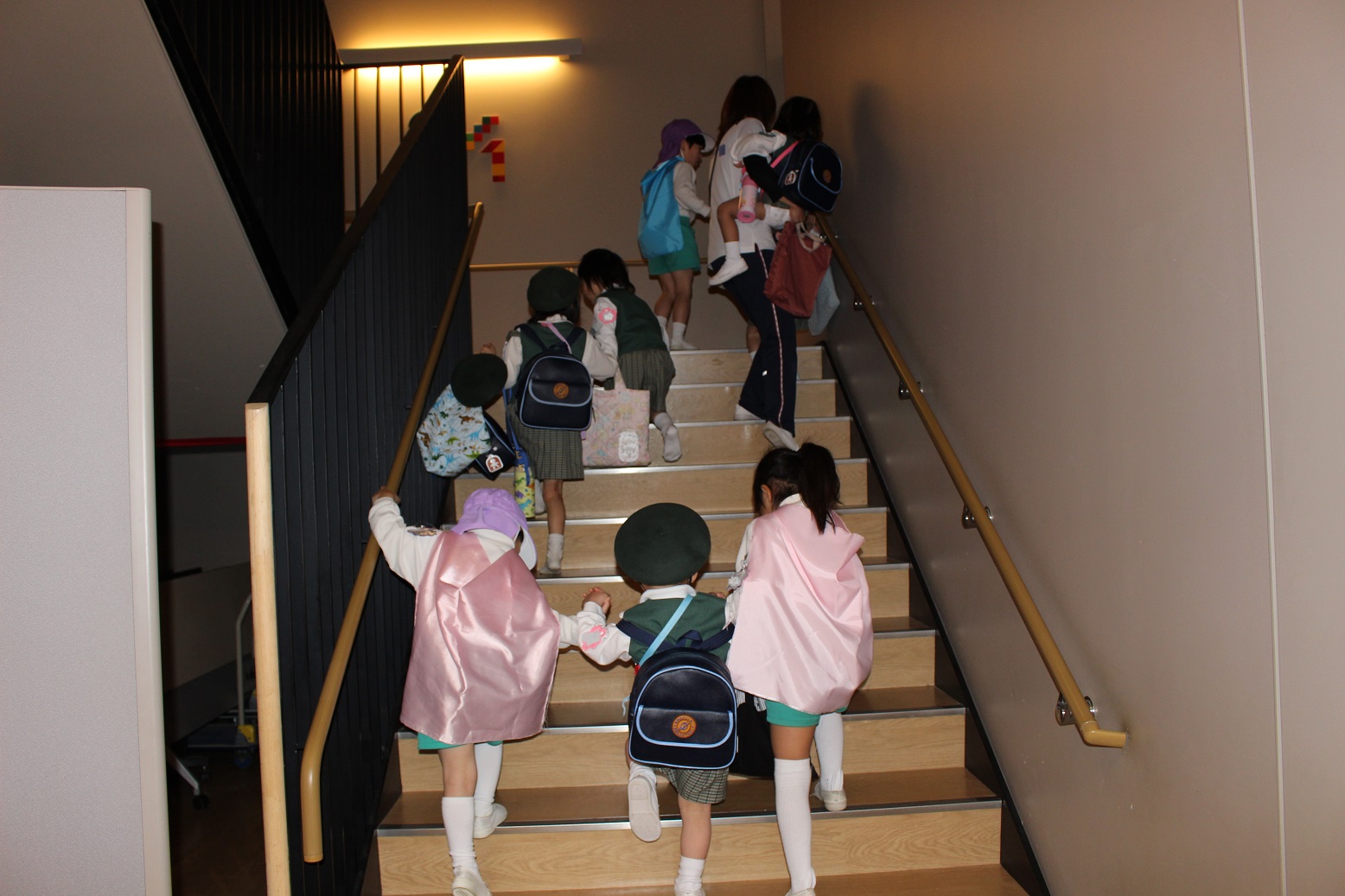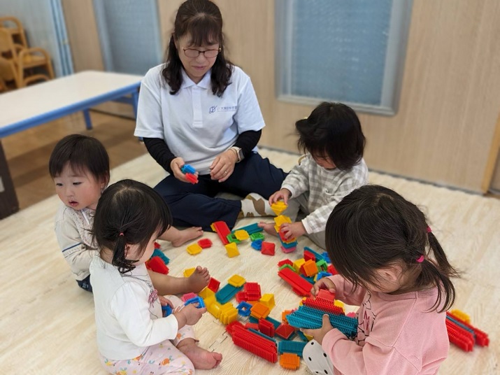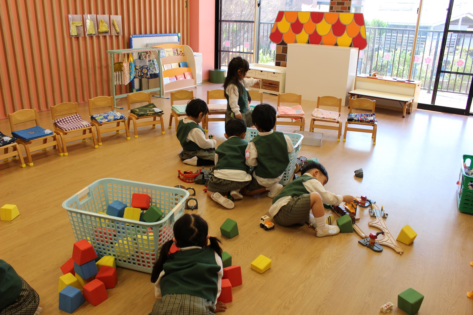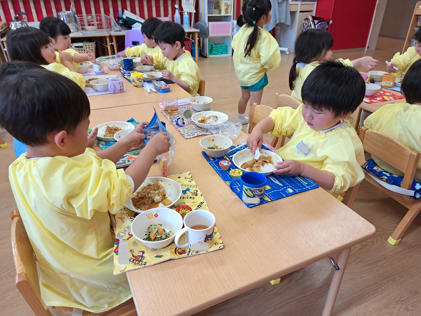 年少児が登園するときには、門からお部屋まで一緒に行ってくれたり、一緒にかばんやタオルを置いてくれたりなど、おたすけマンがたくさんいてくれています。