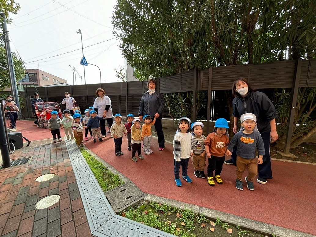 どんな場合でも、適切に避難できるように1ヵ月に1回訓練をしていきます。他にも、園長先生以外誰も知らない抜き打ち訓練もあります!