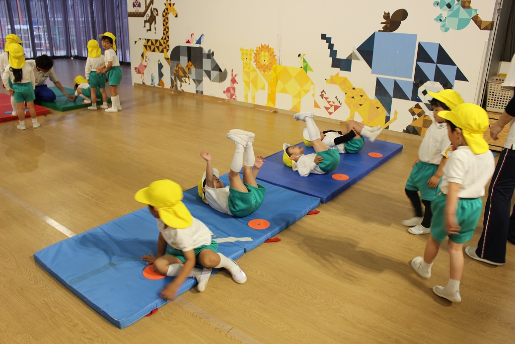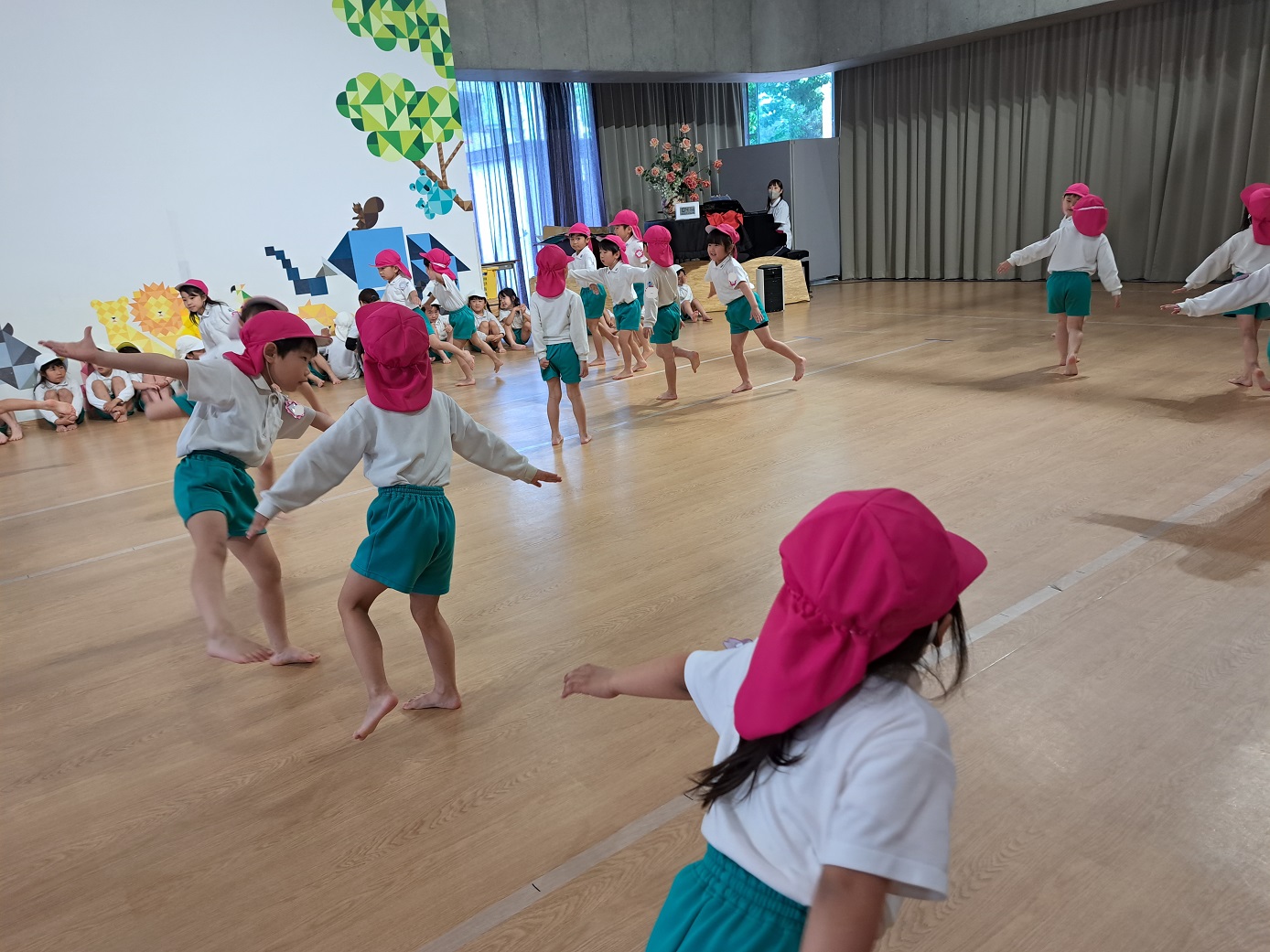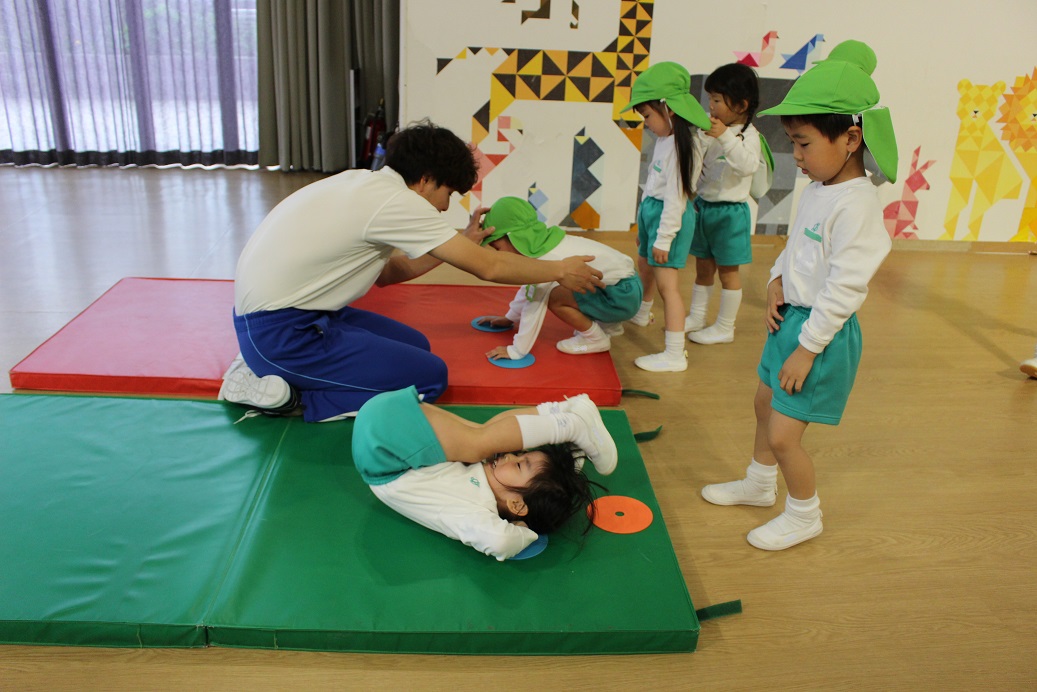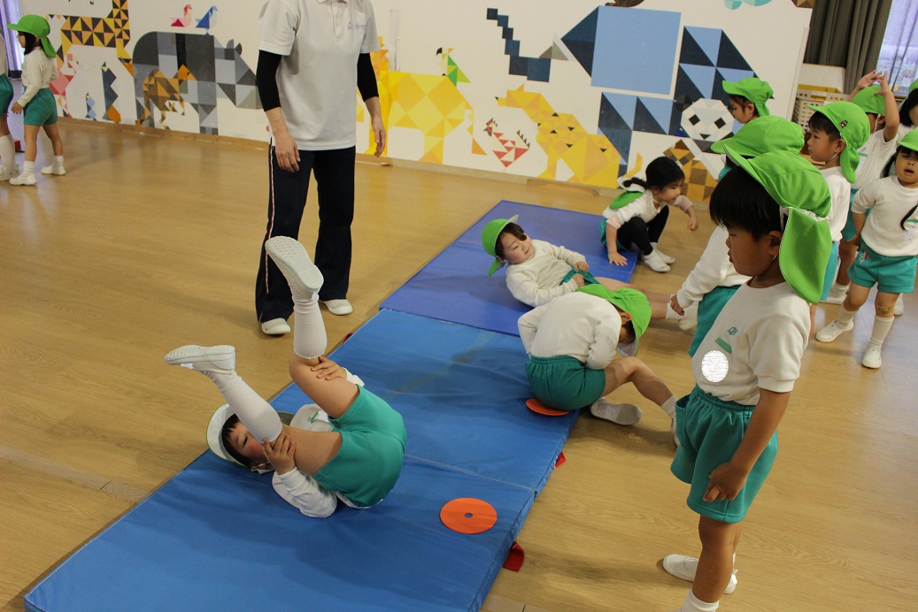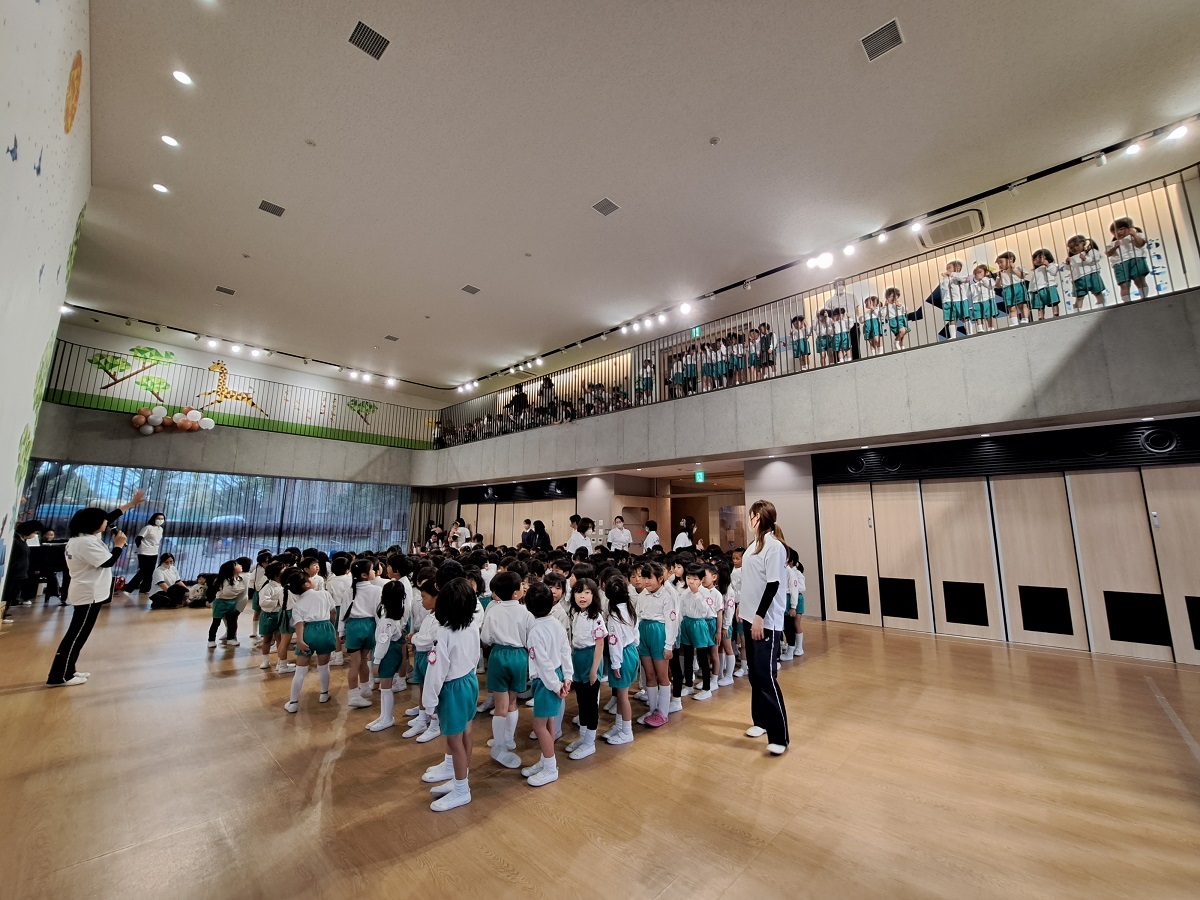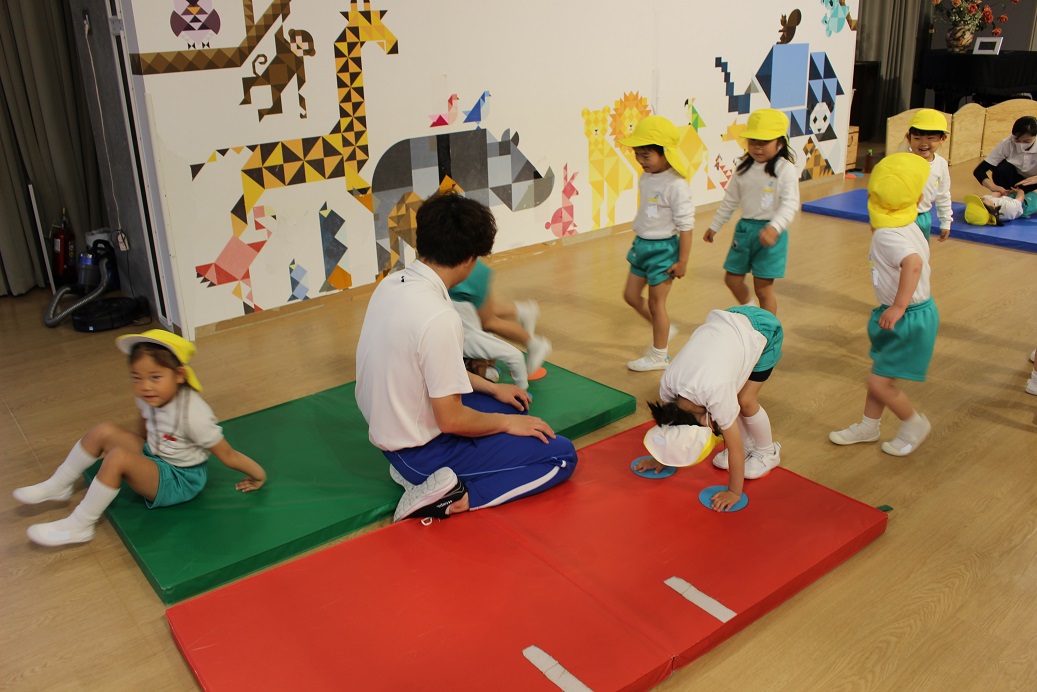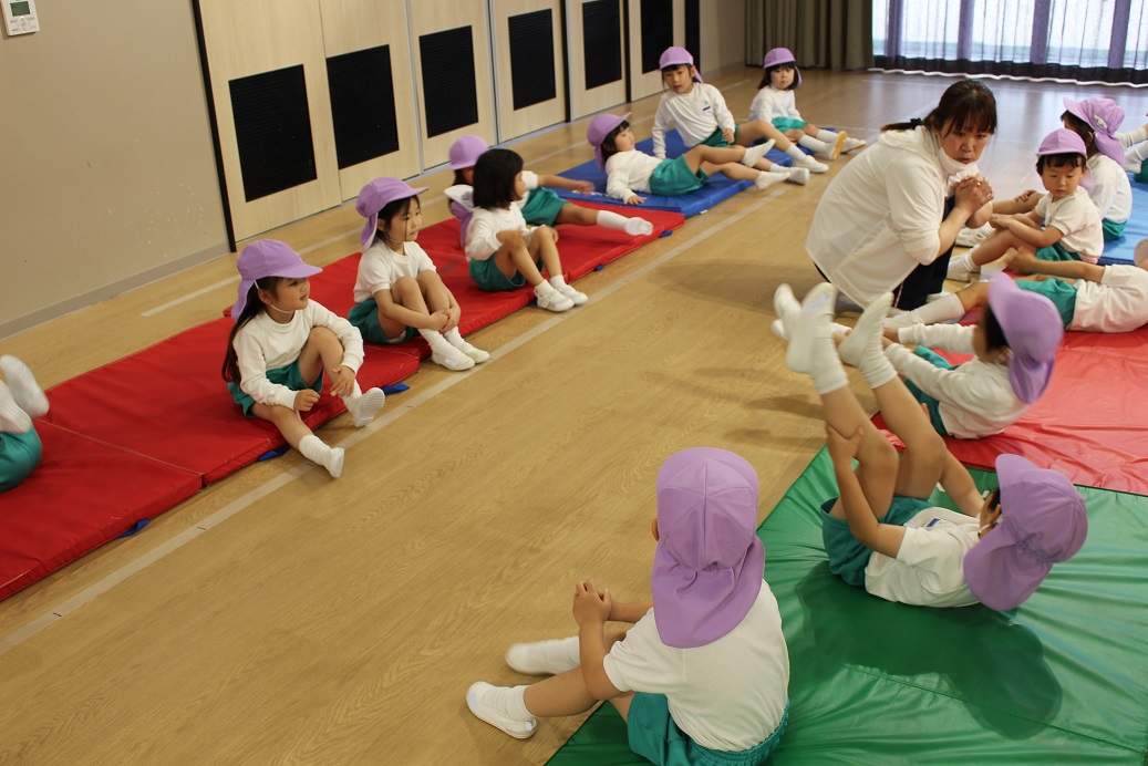 幼稚園のホールで一緒にリズム遊びをしました。