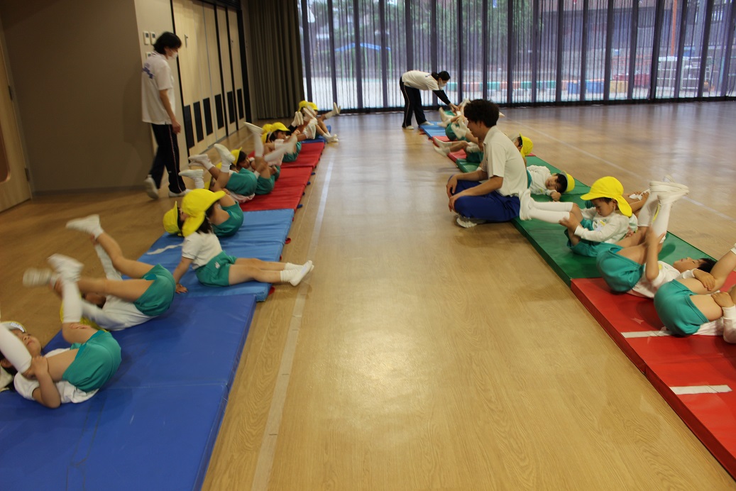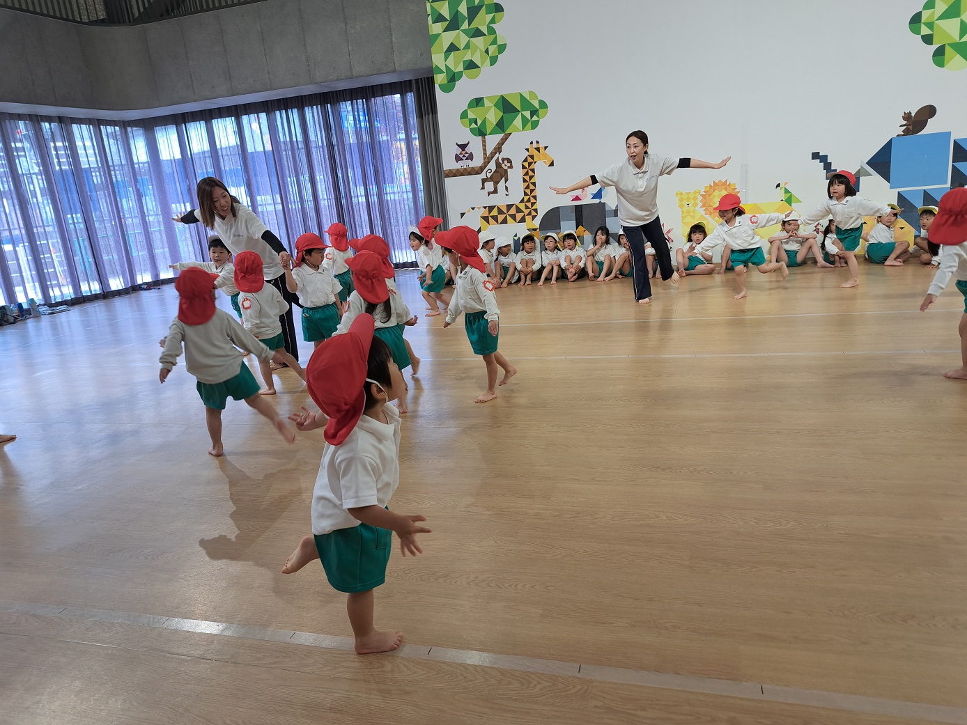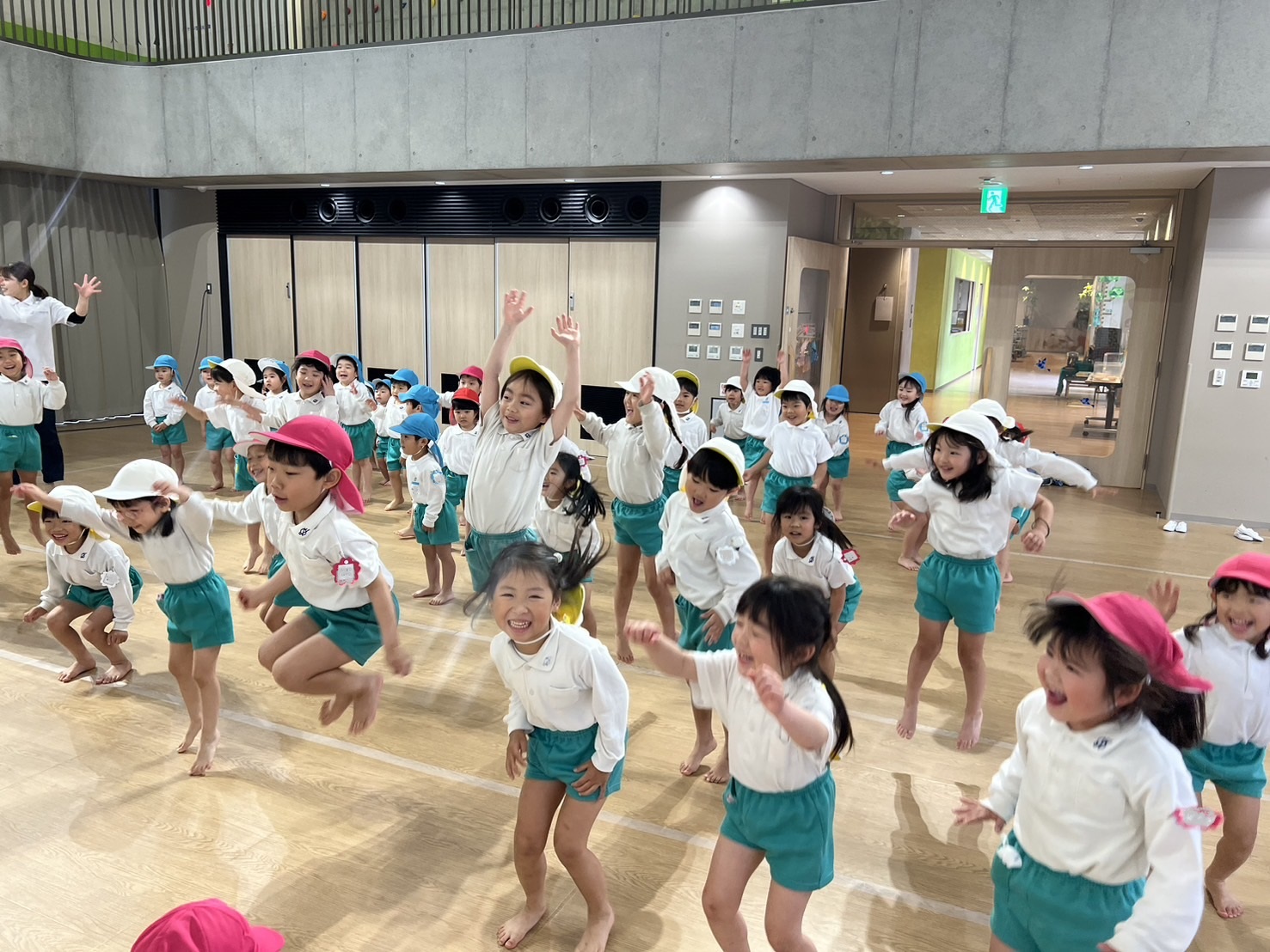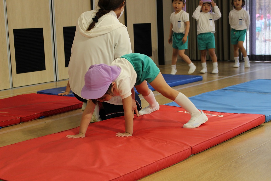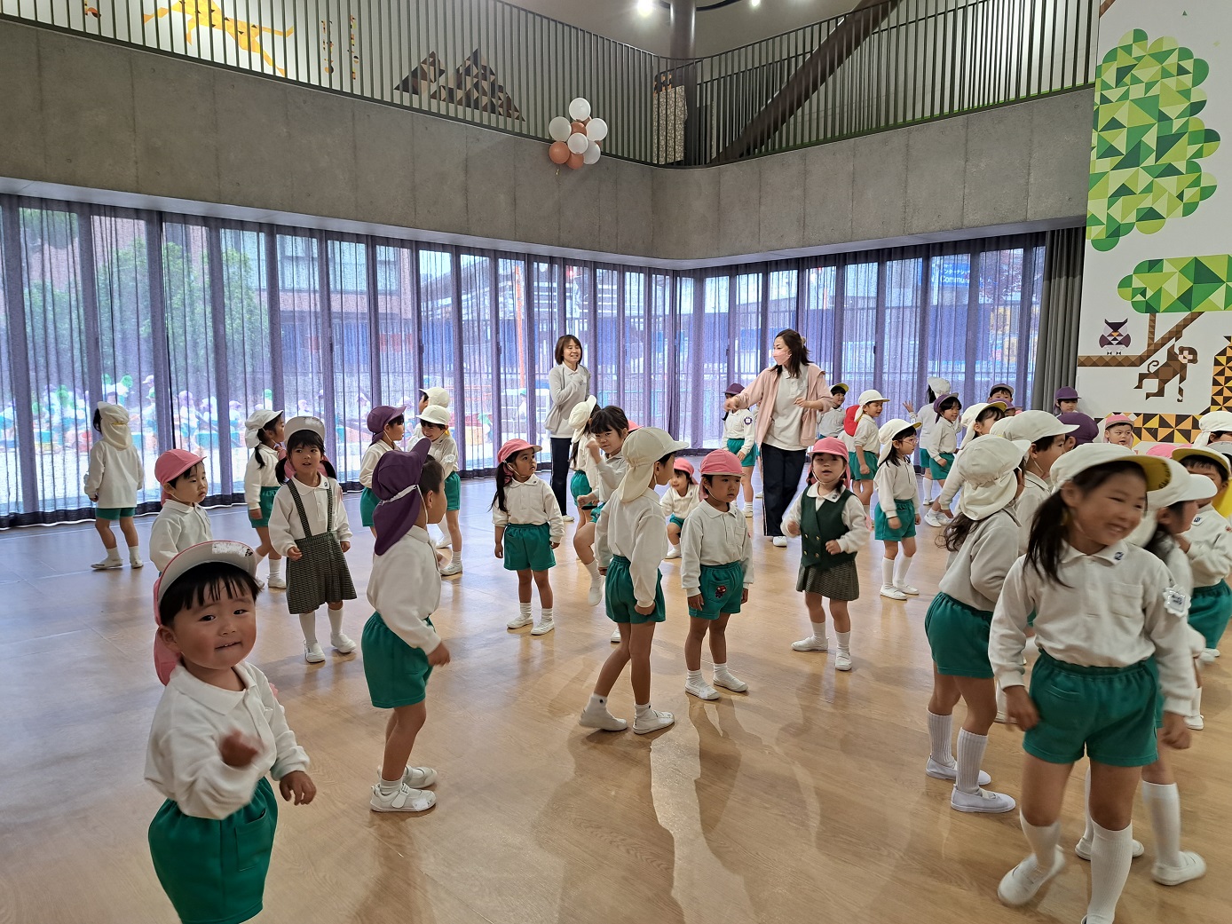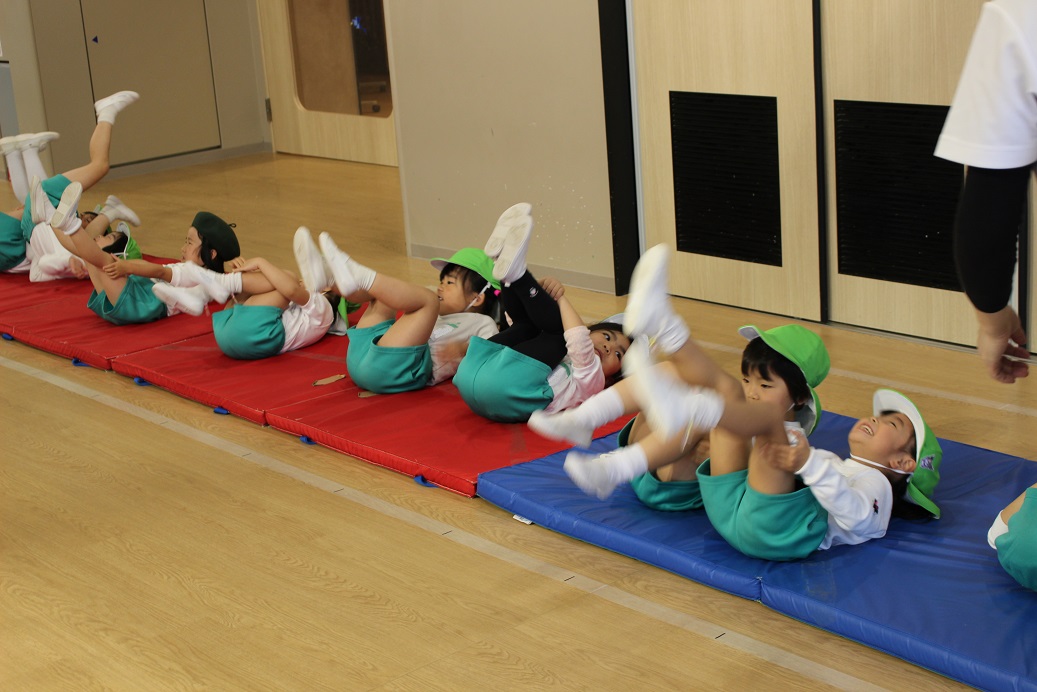 幼稚園のホールで一緒にリズム遊びをしました。