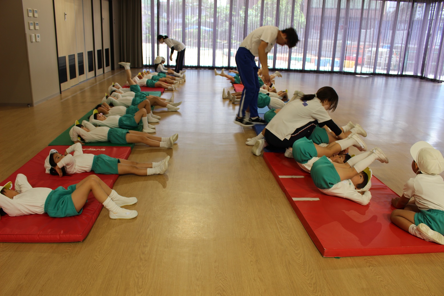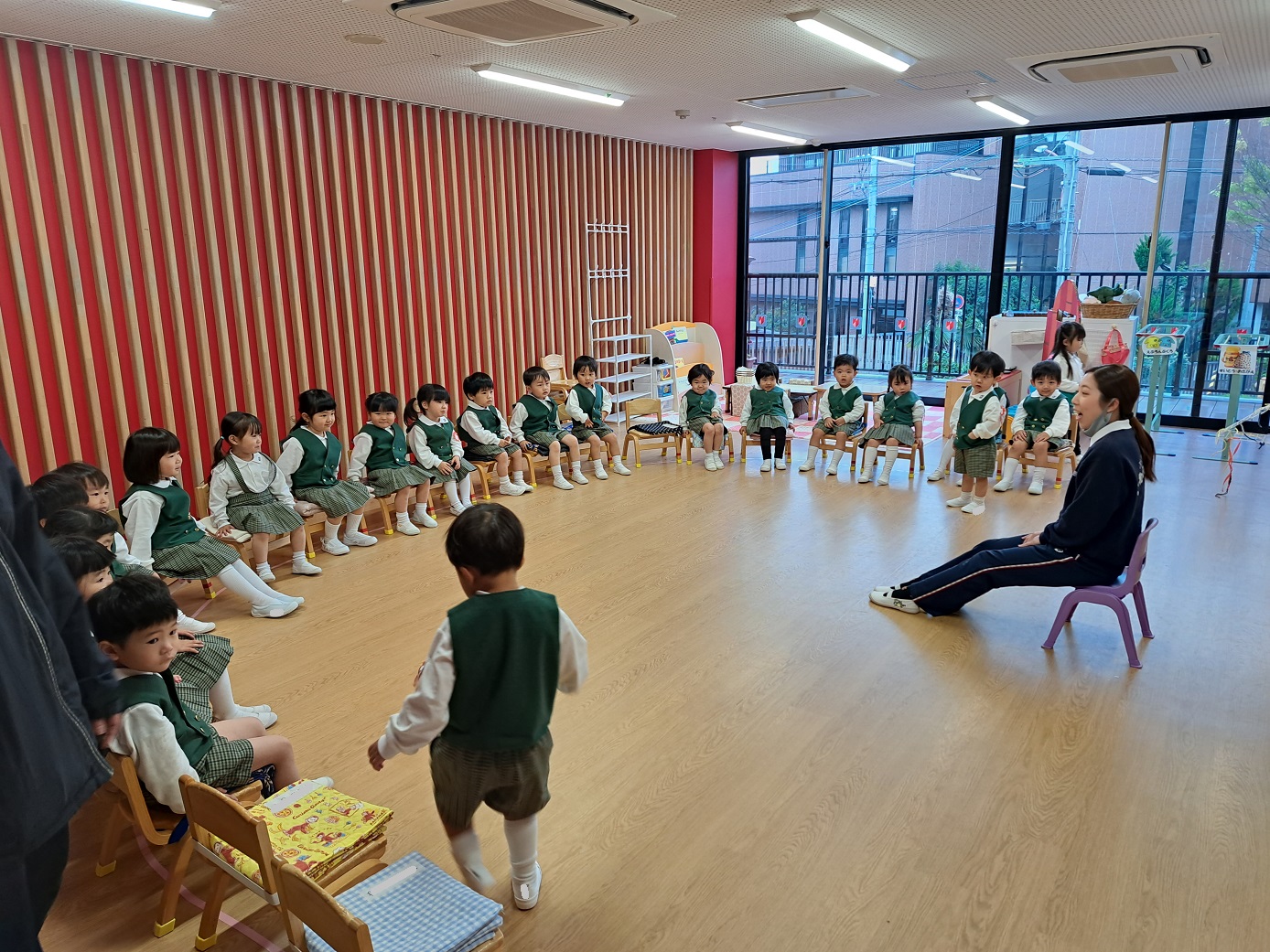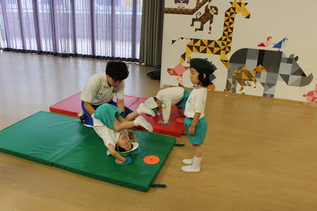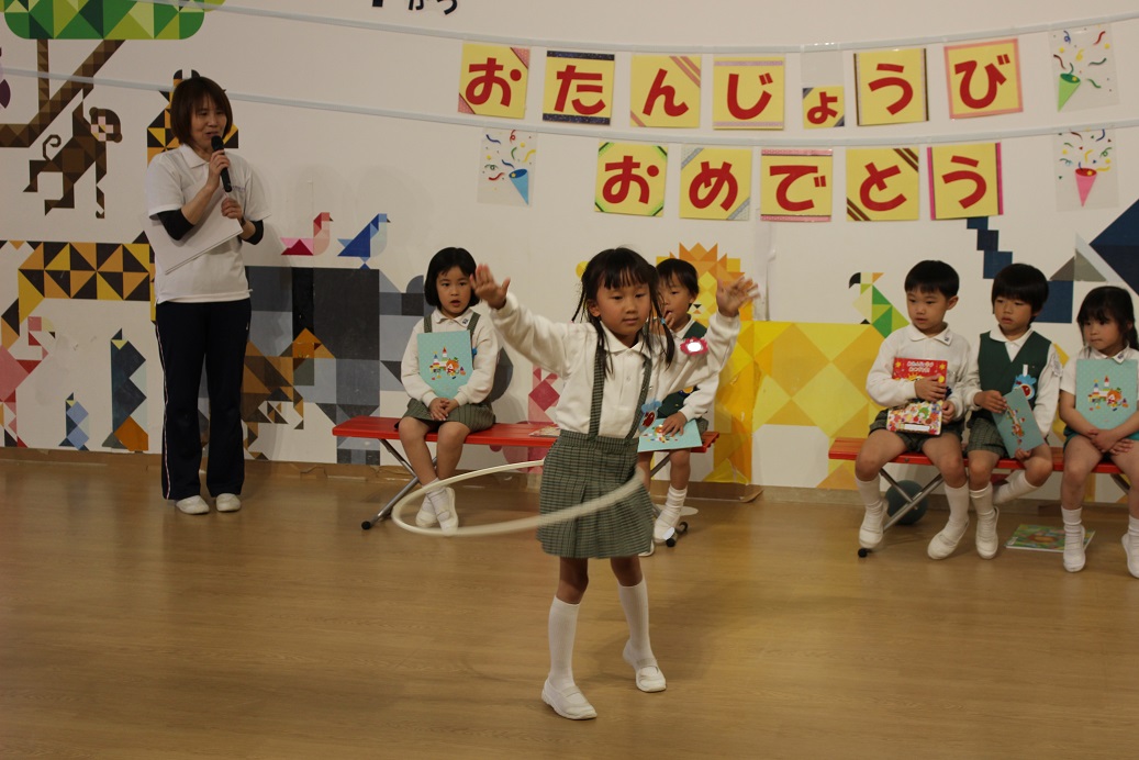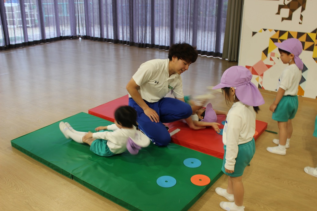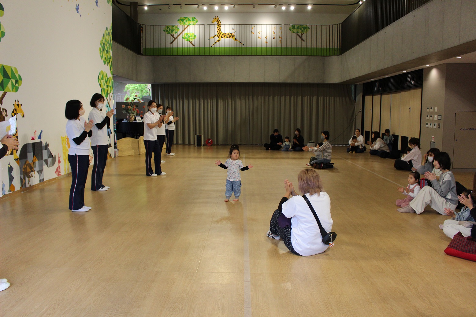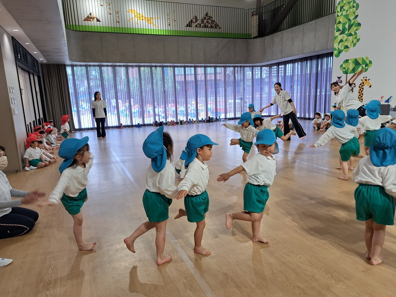 幼稚園のホールで一緒にリズム遊びをしました。