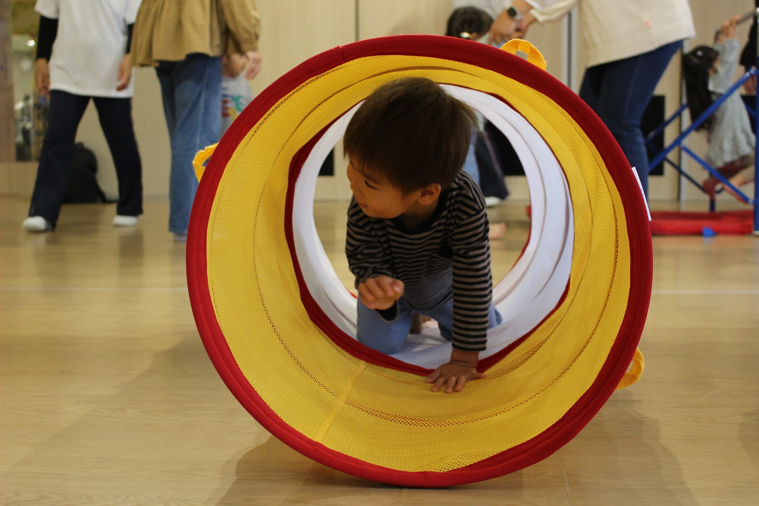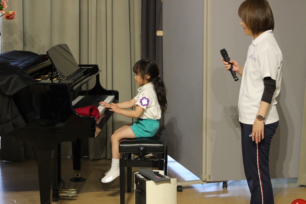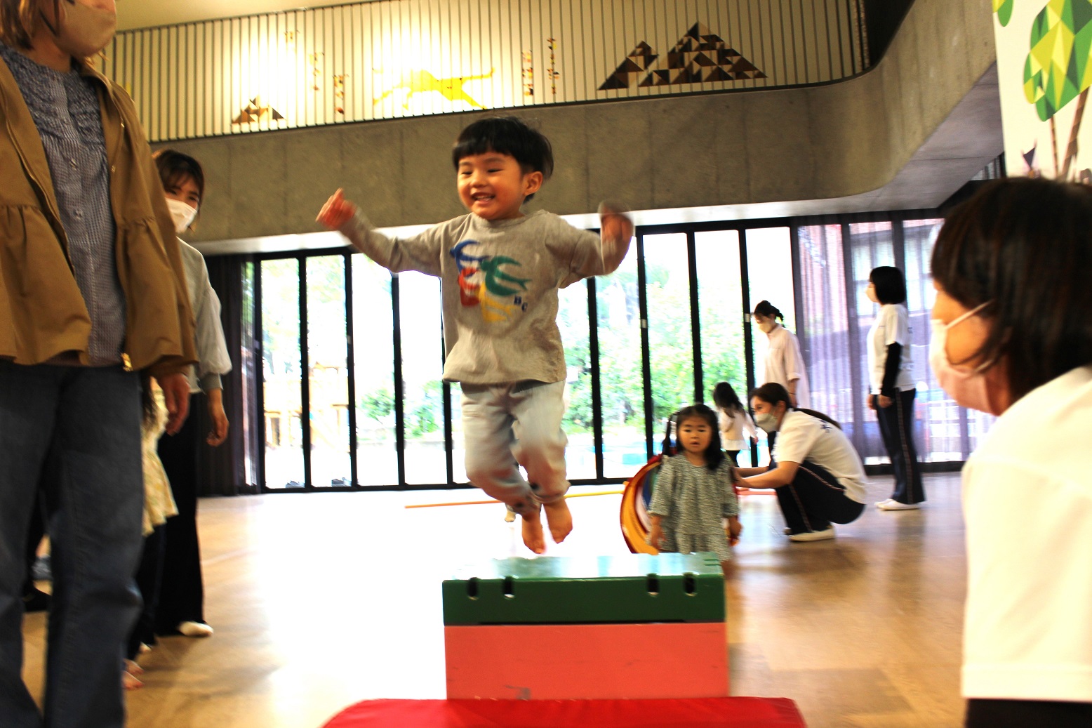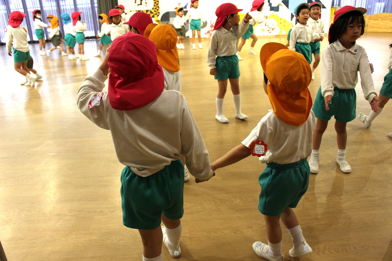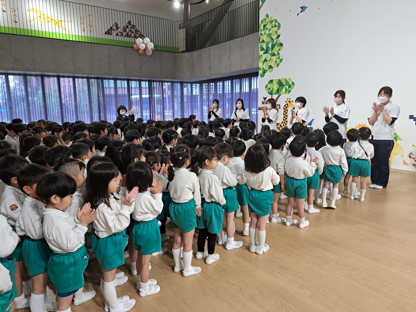 幼稚園のホールで一緒にリズム遊びをしました。