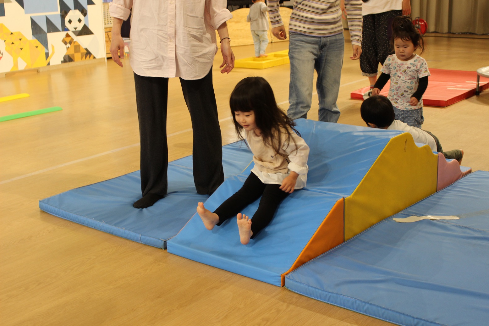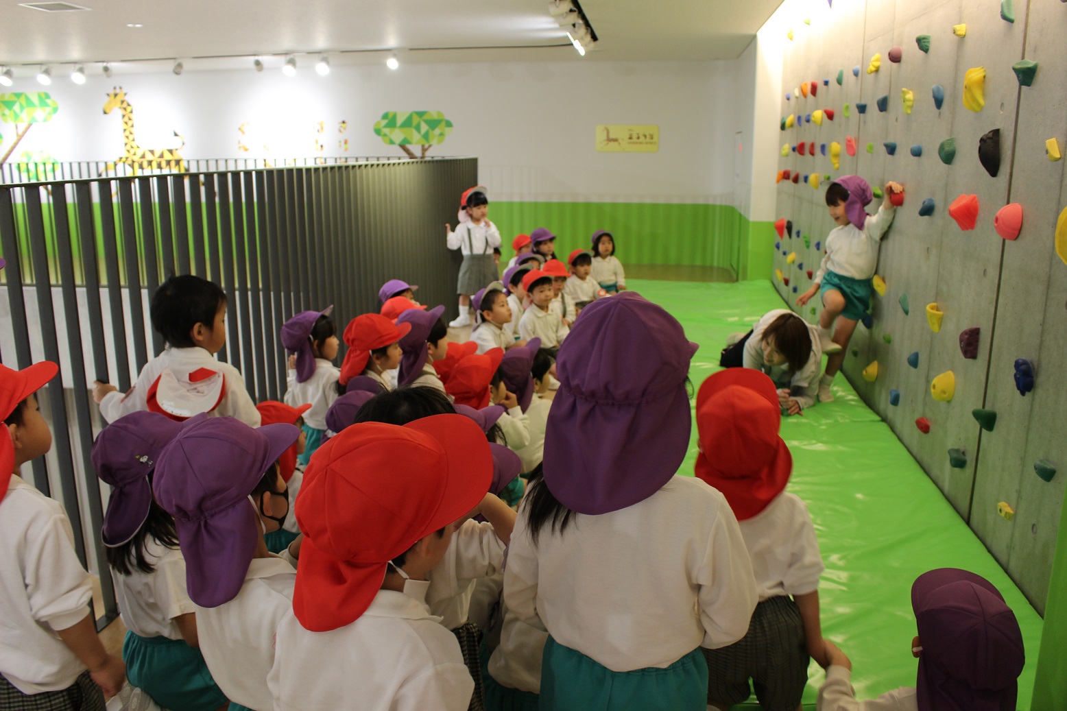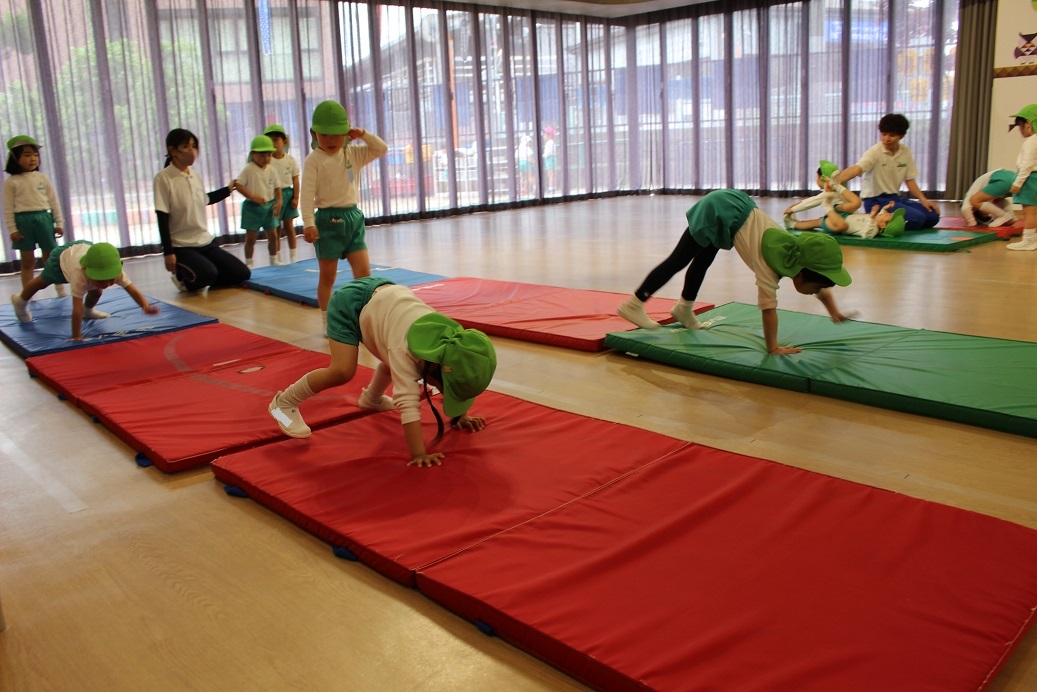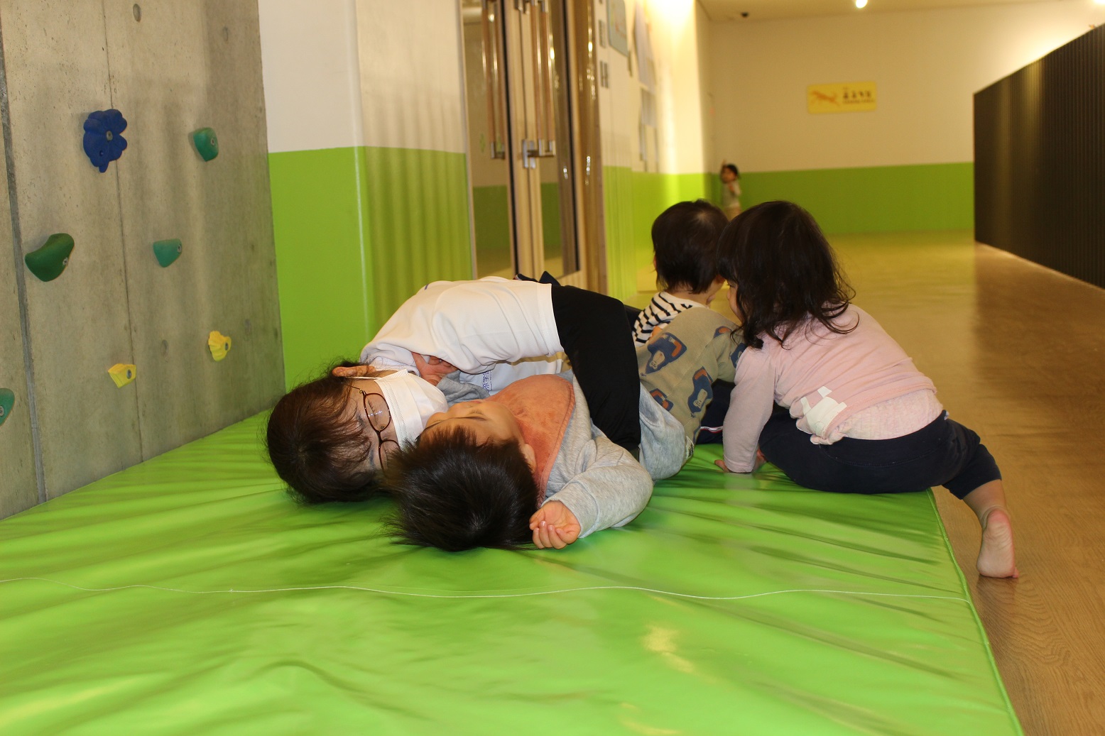 ↑のぼろうか(ボルダリング)の下のマットは、"寝転ばない"ということを実際にわかりやすく先生が見せてくれました。(のぼっている子どもが降りるときに危ないので💦)
