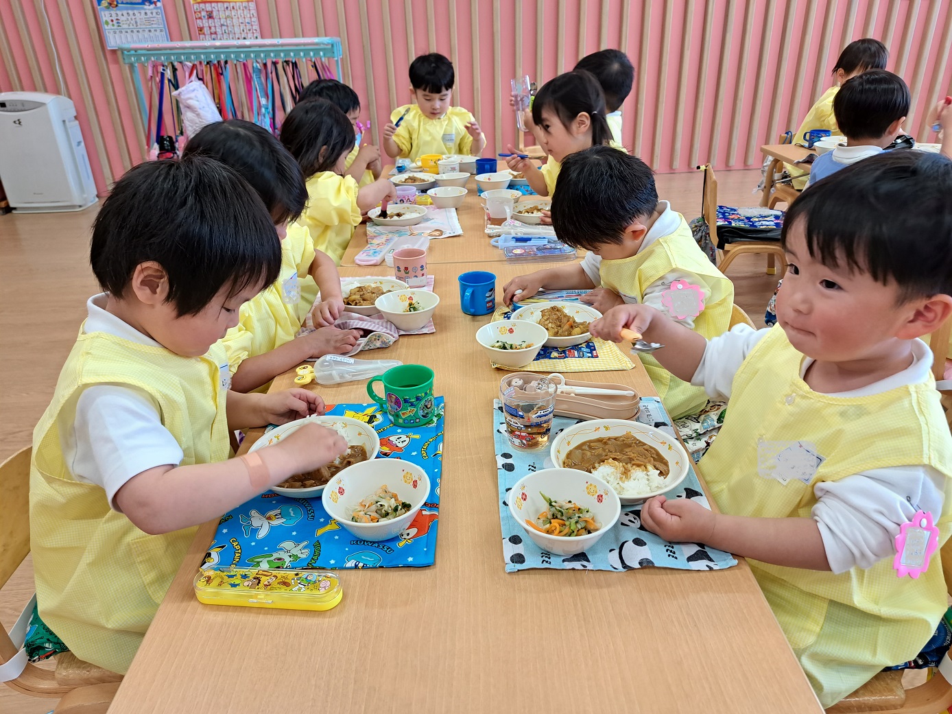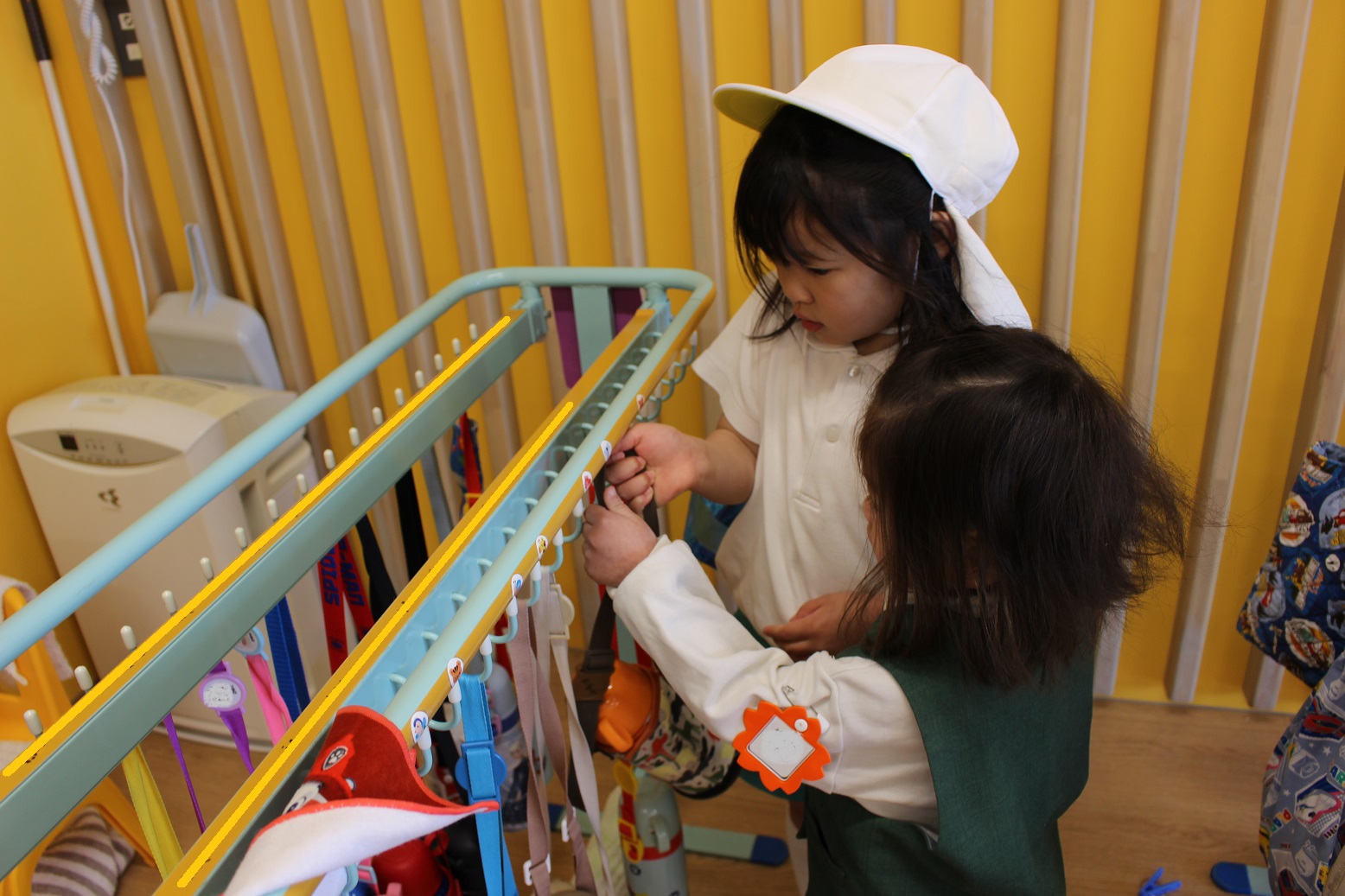 お助けマンの子どもたちは、カバンを置く場所、水筒やタオルをかける場所など・・・