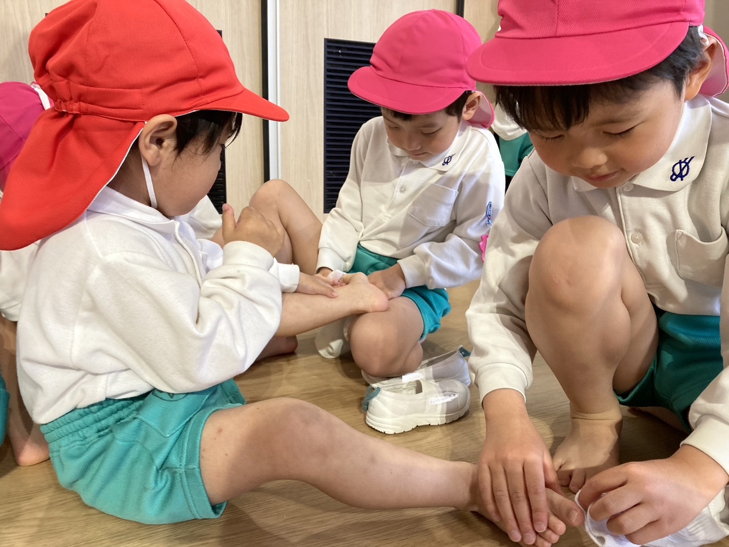 リズム遊びをしたあとは・・・年長組の子どもたちがおたすけマンになって、靴下を履くお手伝いや、給食の準備のお手伝いをしてくれました!