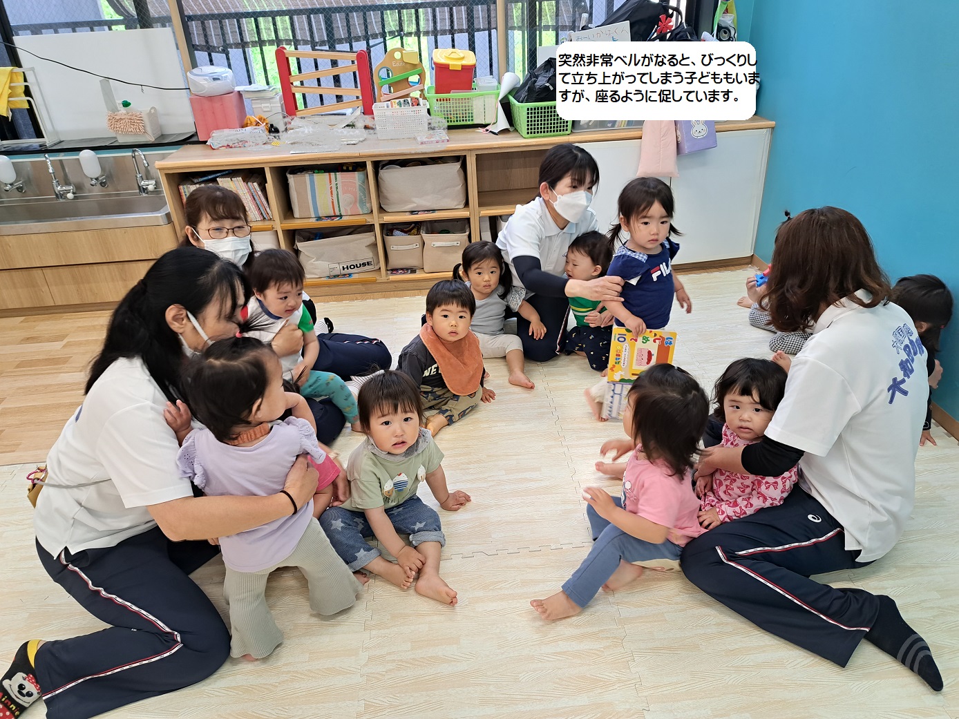 非常ベルがなったら、すぐ近くの先生のところに行き、放送を聞いたり、先生の指示を聞いたりするということを学んでいます。