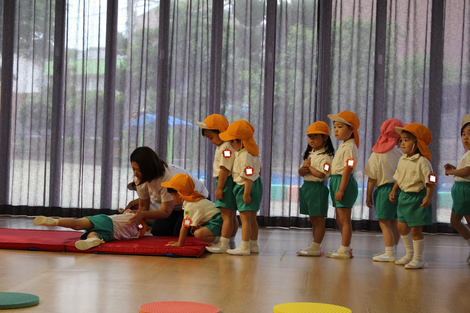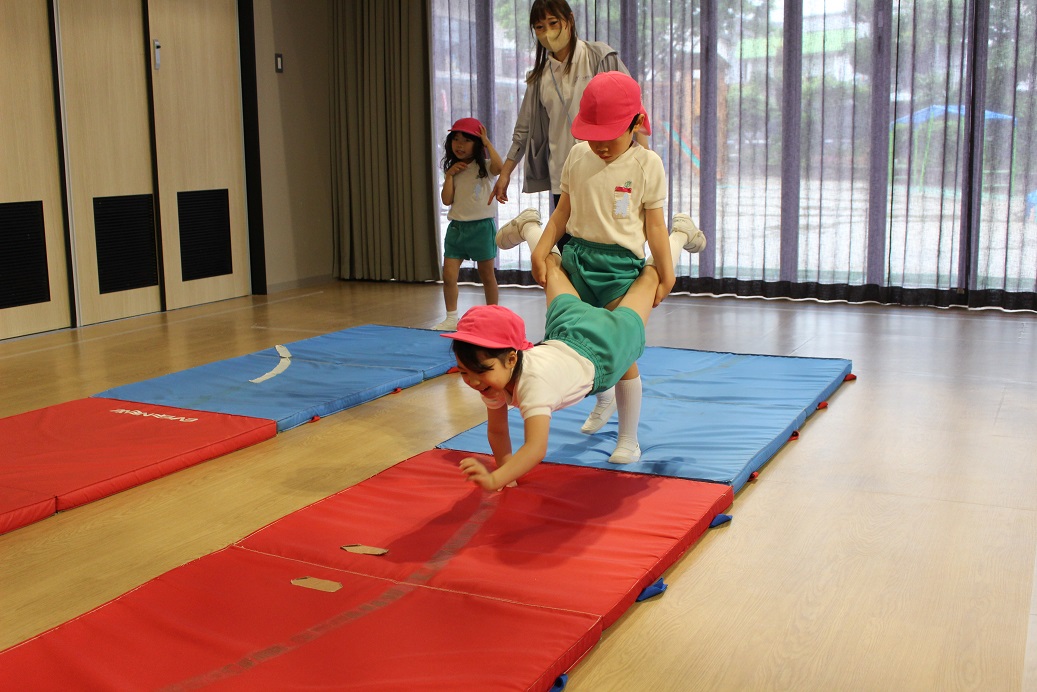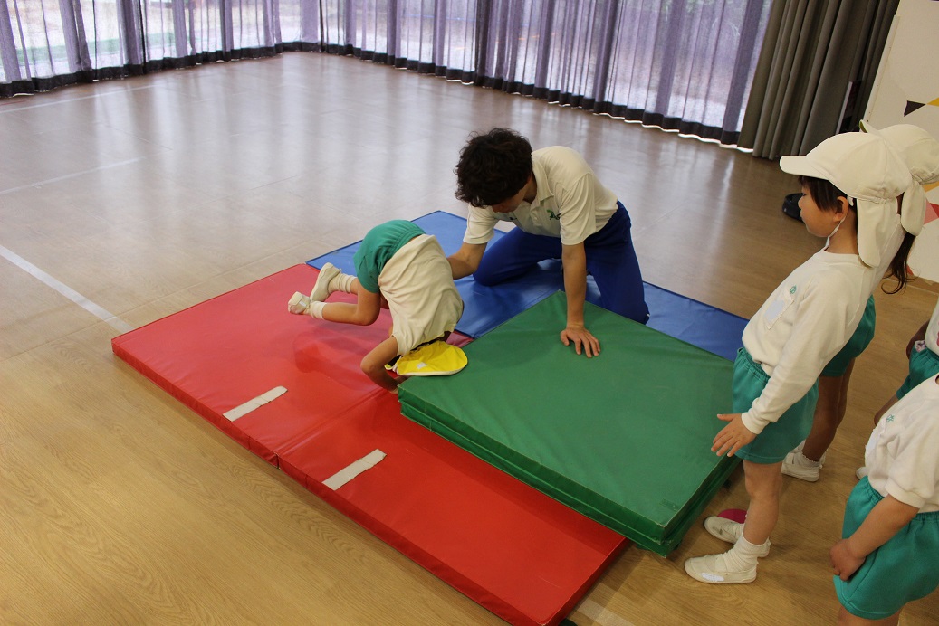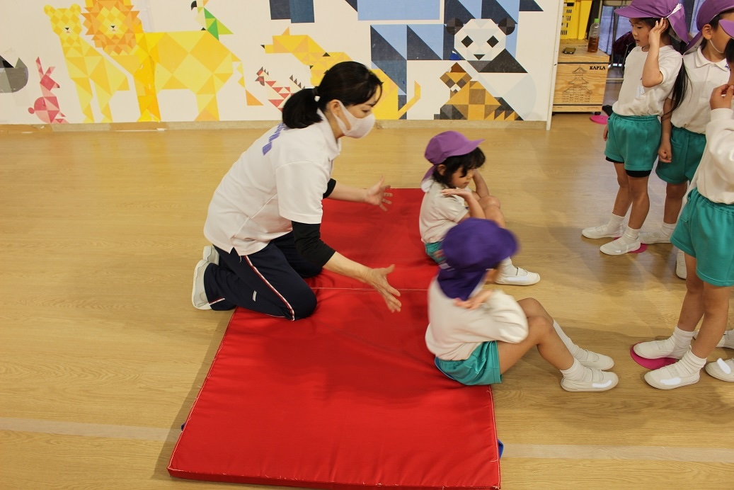 おへそを見ながら体を前に倒しながら回る"前回り"をしました。