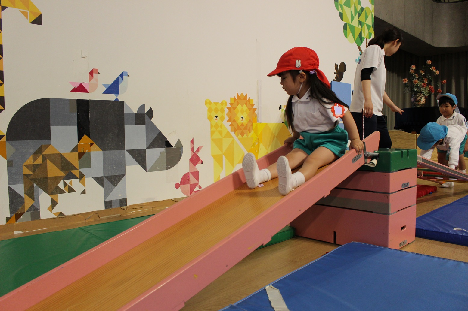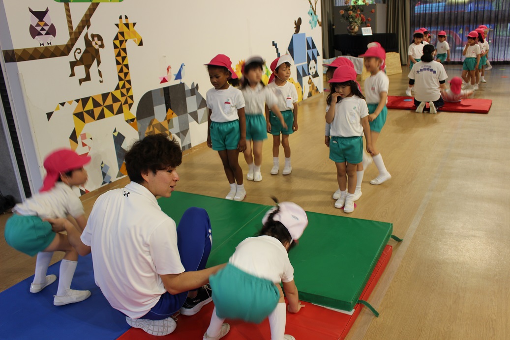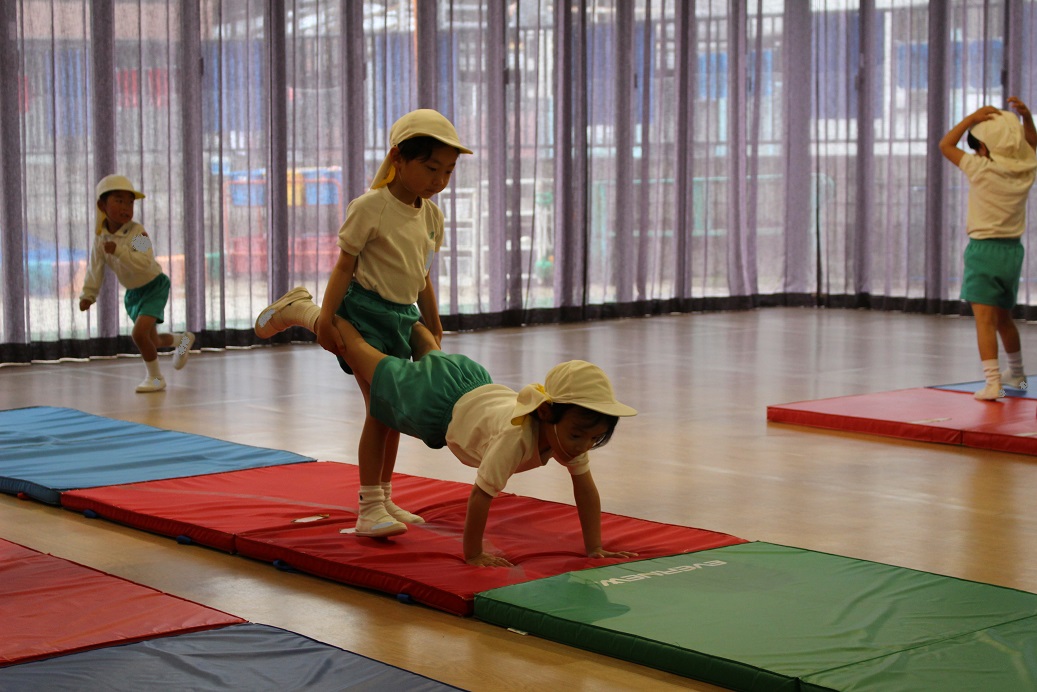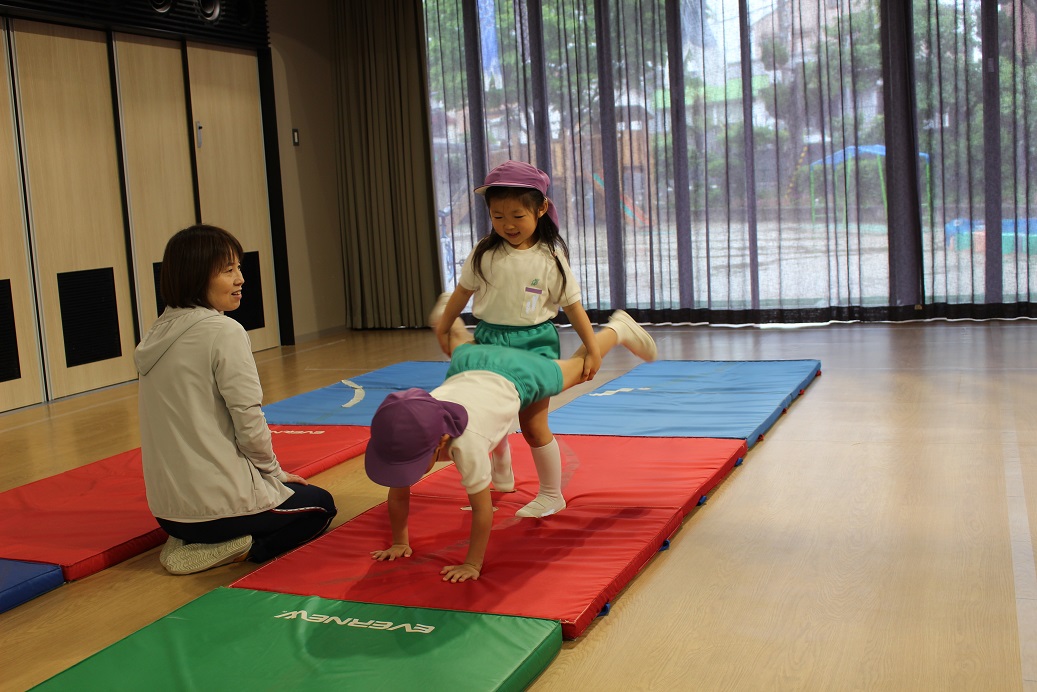 おへそを見ながら体を前に倒しながら回る"前回り"をしました。
