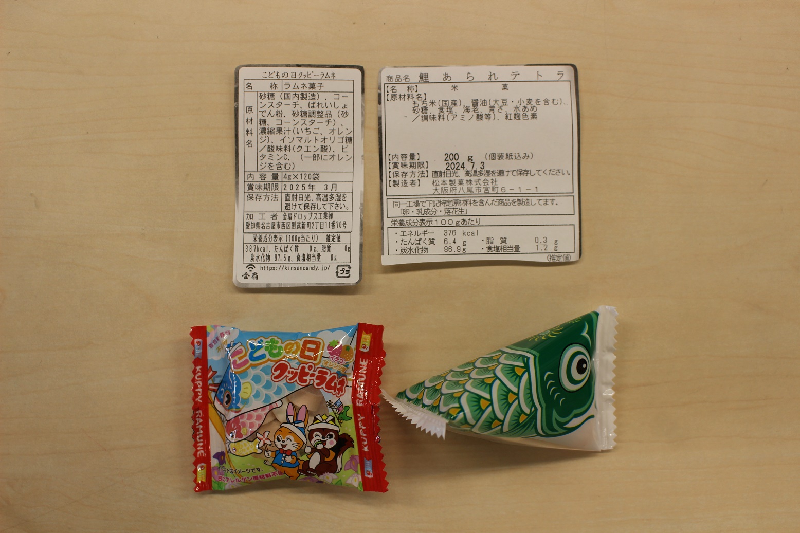 先生から小さなこいのぼりの袋に入ったおかしを受け取り、大きなこいのぼりをみながら「いただきます!」