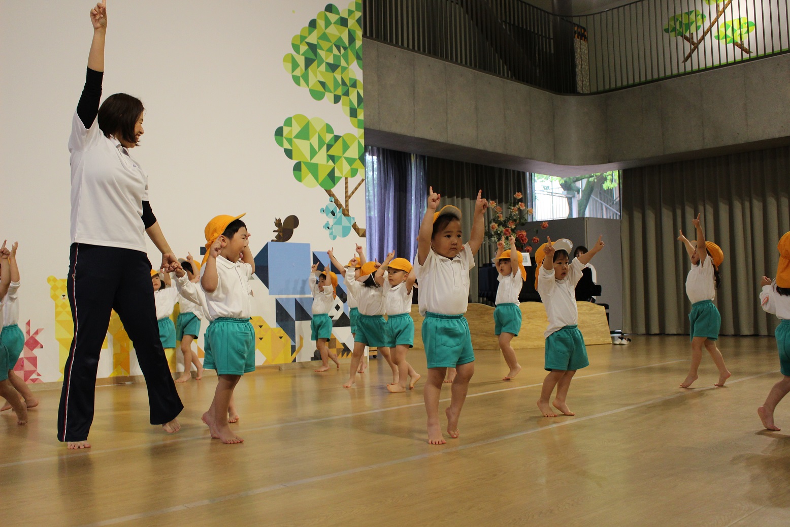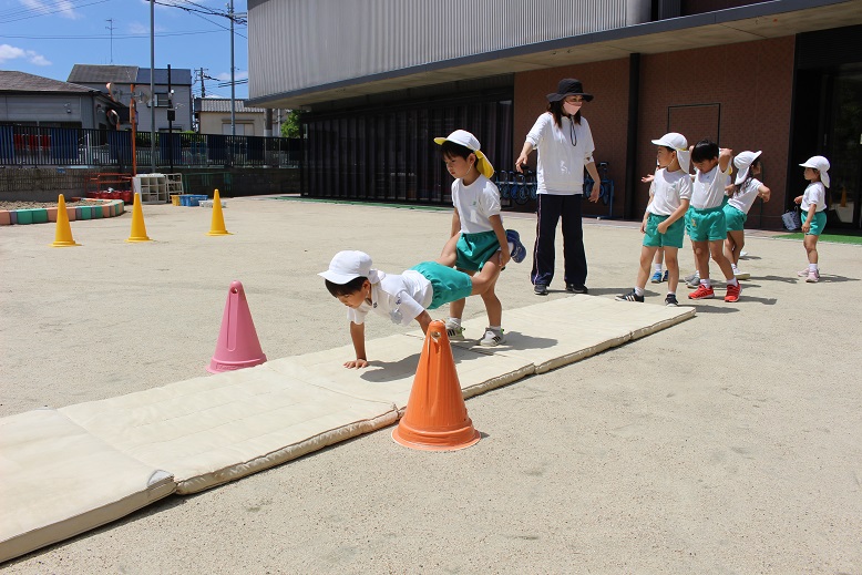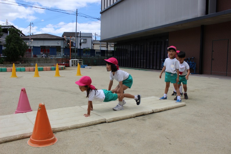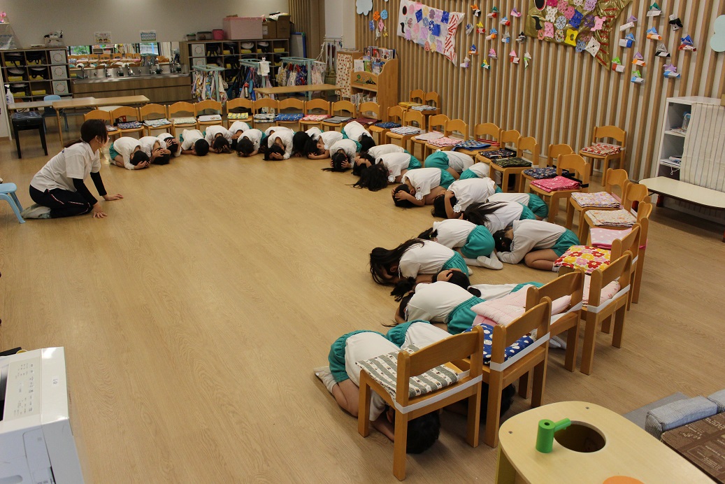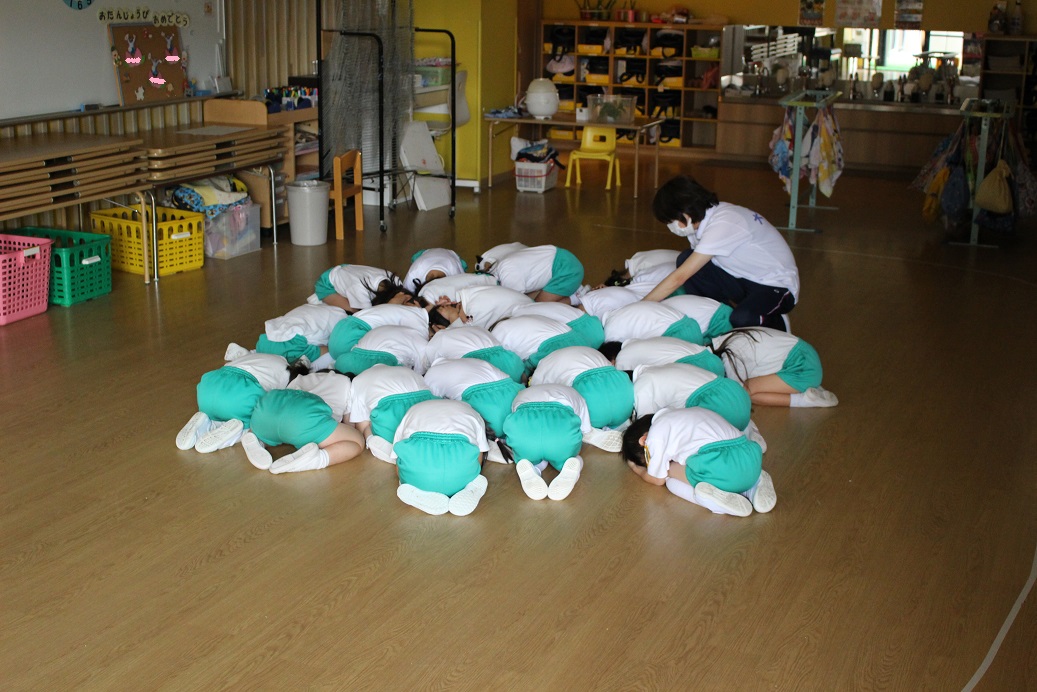 子どもたちは、先生の指示に従って"だんごむしポーズ"で