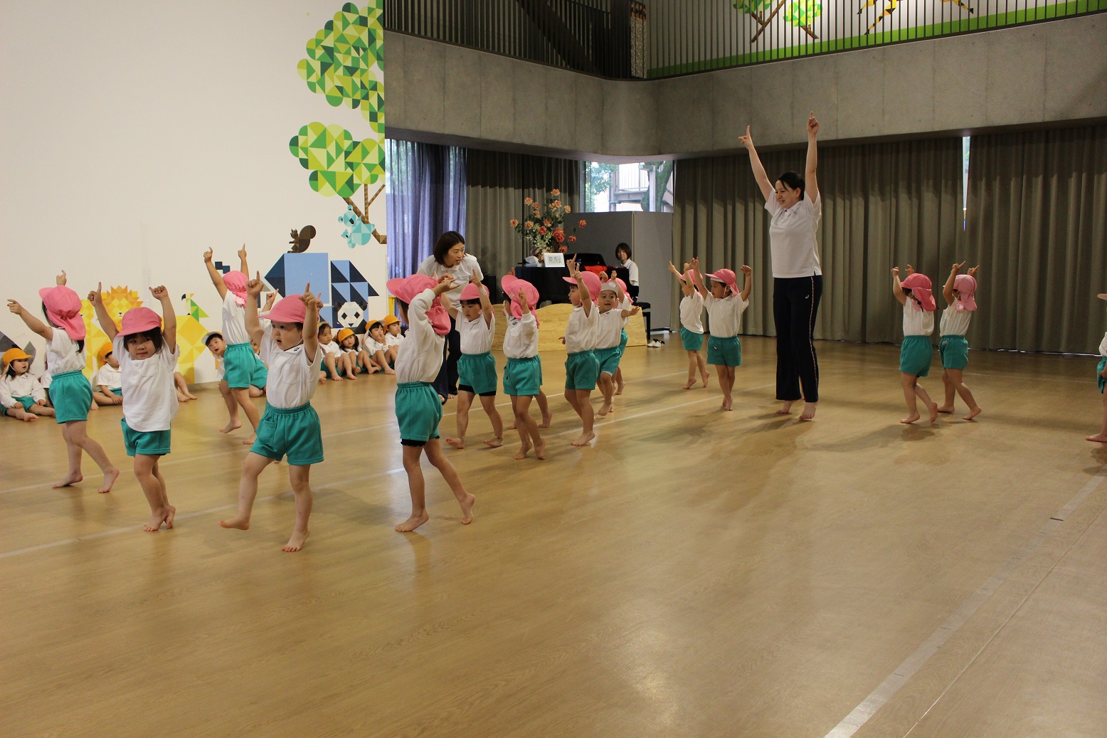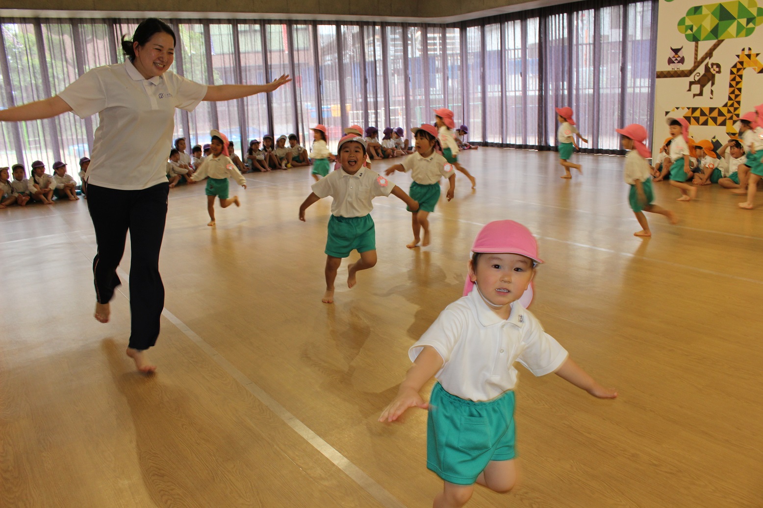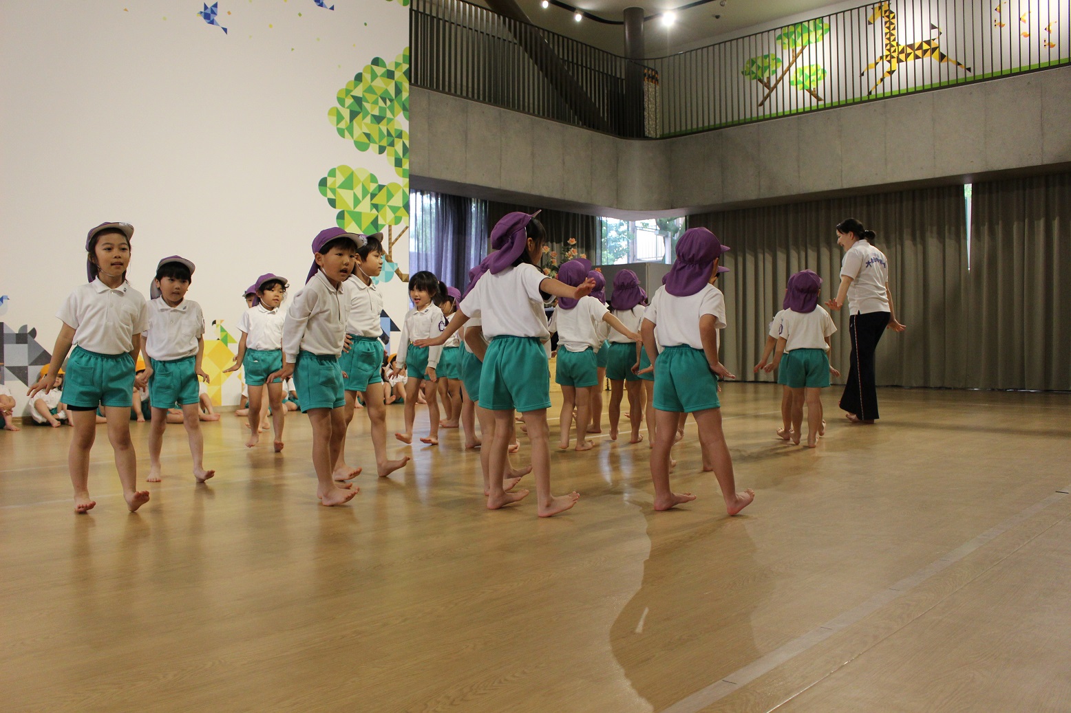 子どもたちは、先生の指示に従って"だんごむしポーズ"で
